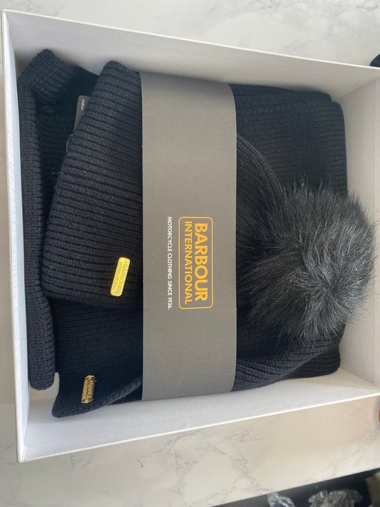 Barbour Black Bobble Hat and Scarf Set New in Box
