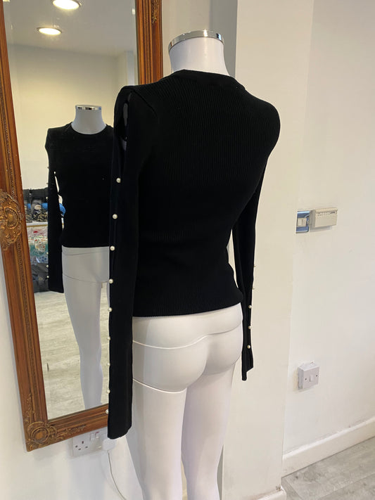 Zara Black Knit Ribbed Top with Pearl Detailing Size Small 6-8