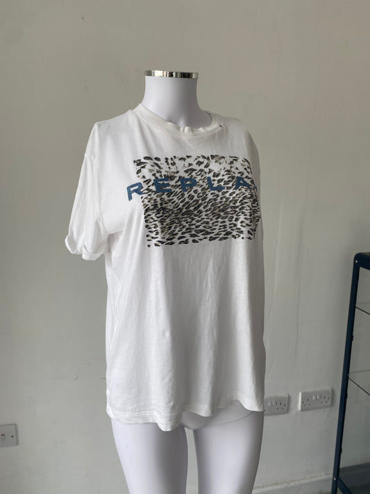 Replay White T-shirt With Leopard Print Design Size 8