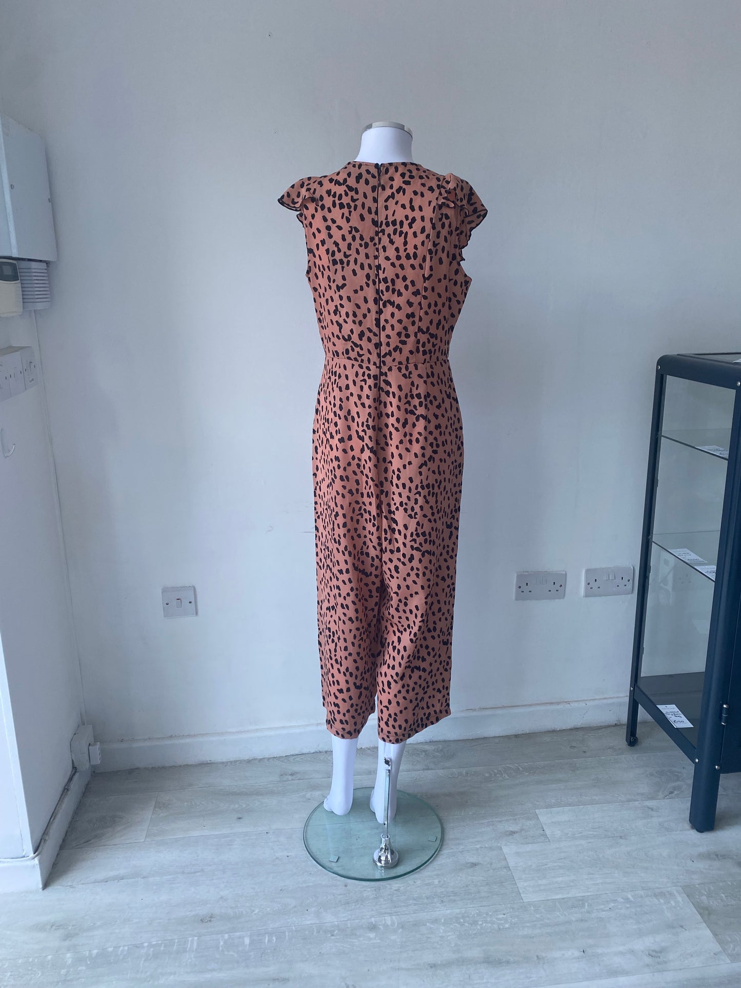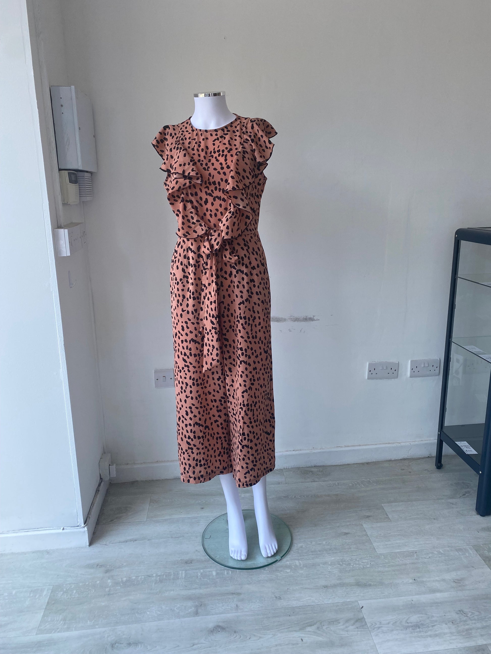This lovely jumpsuit has a gorgeous print. It is wide legged so looks like a dress. Has lovely ruffle detailing at the front.
