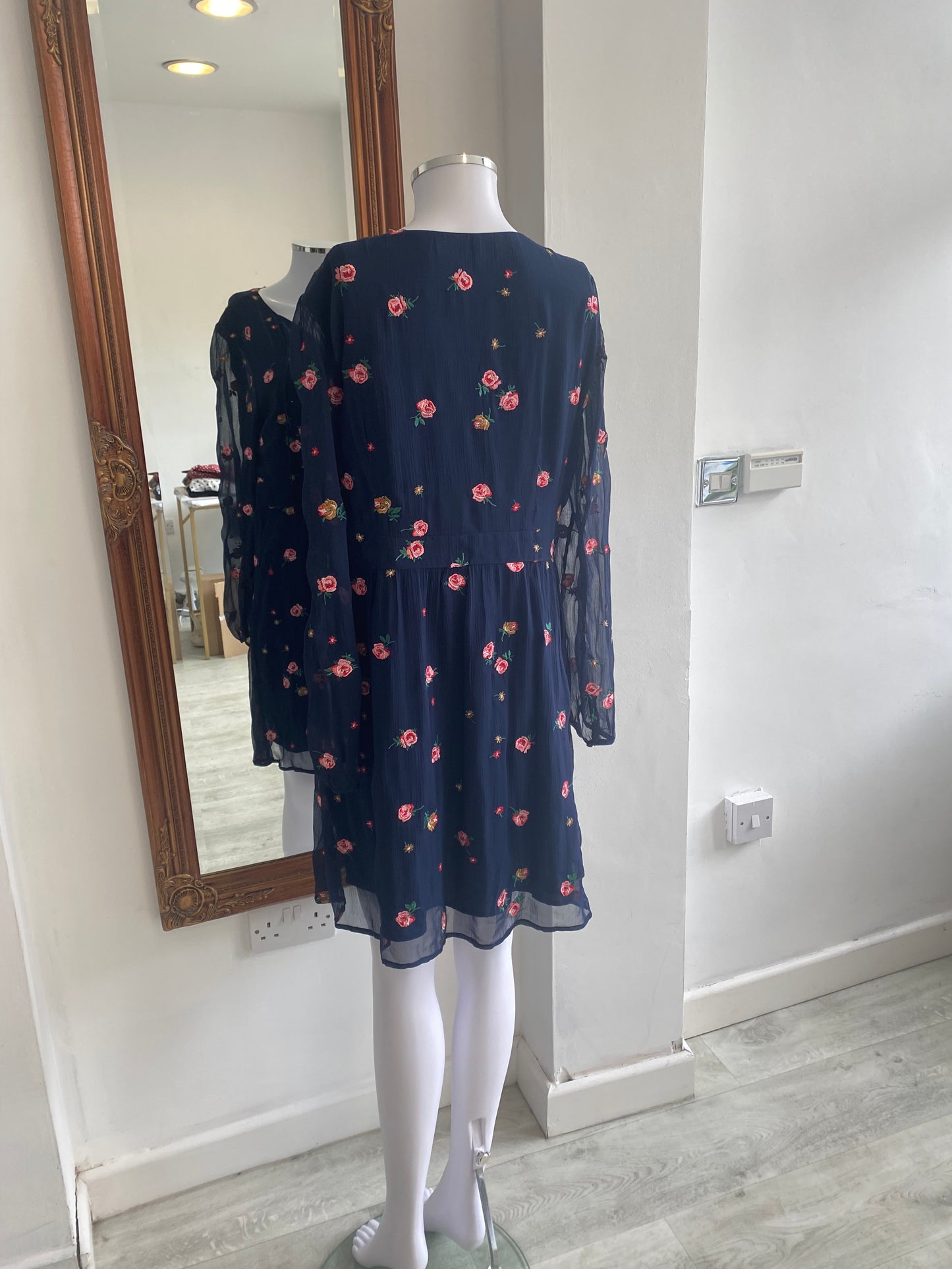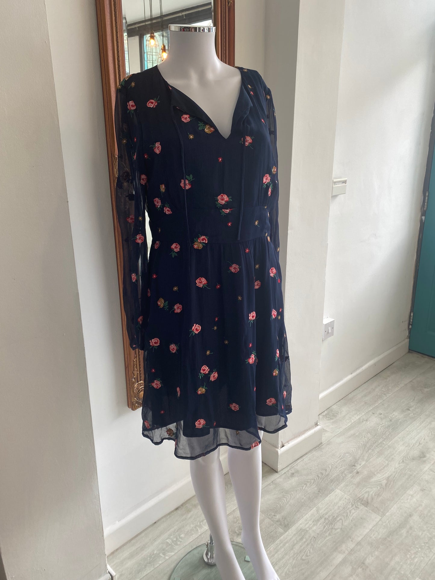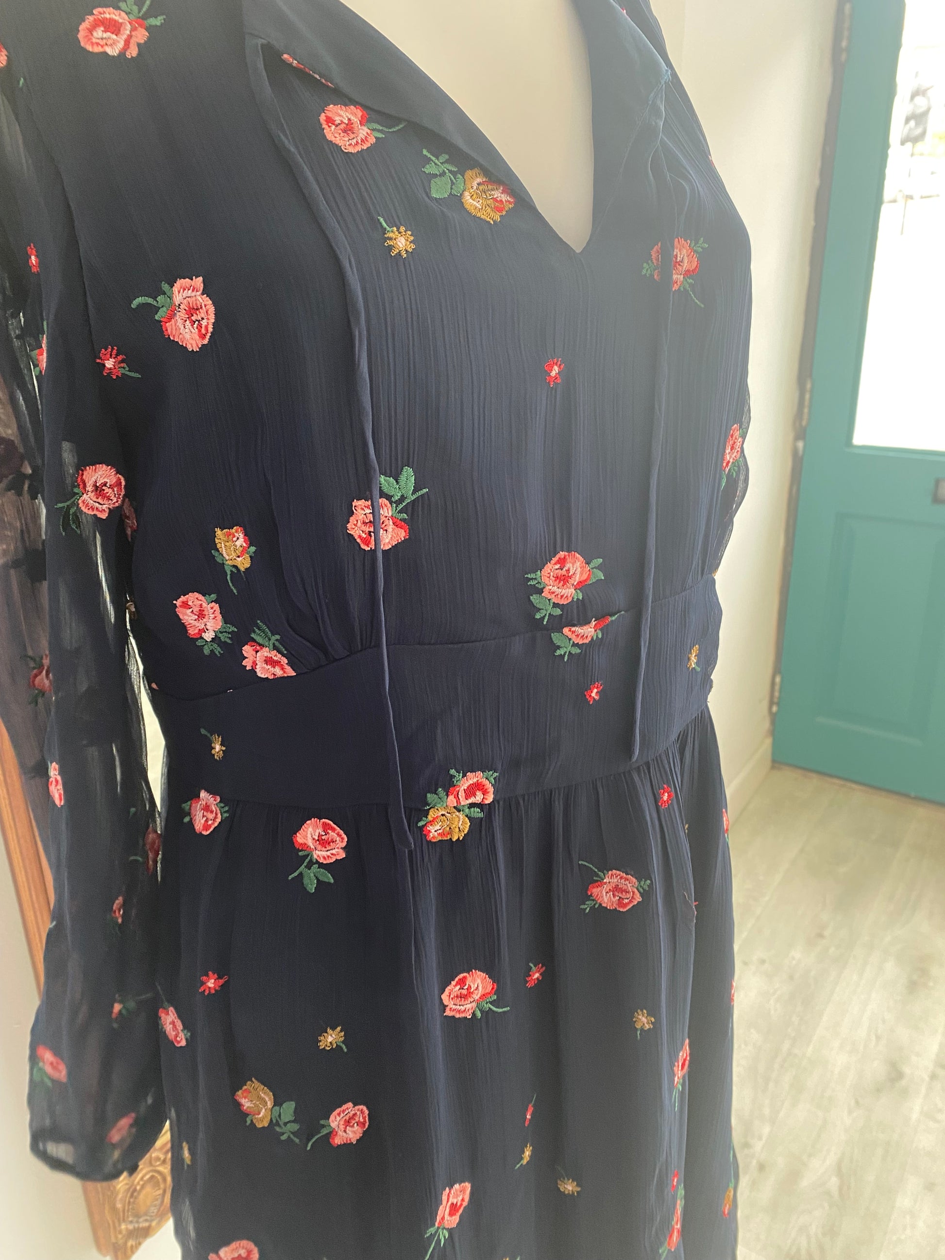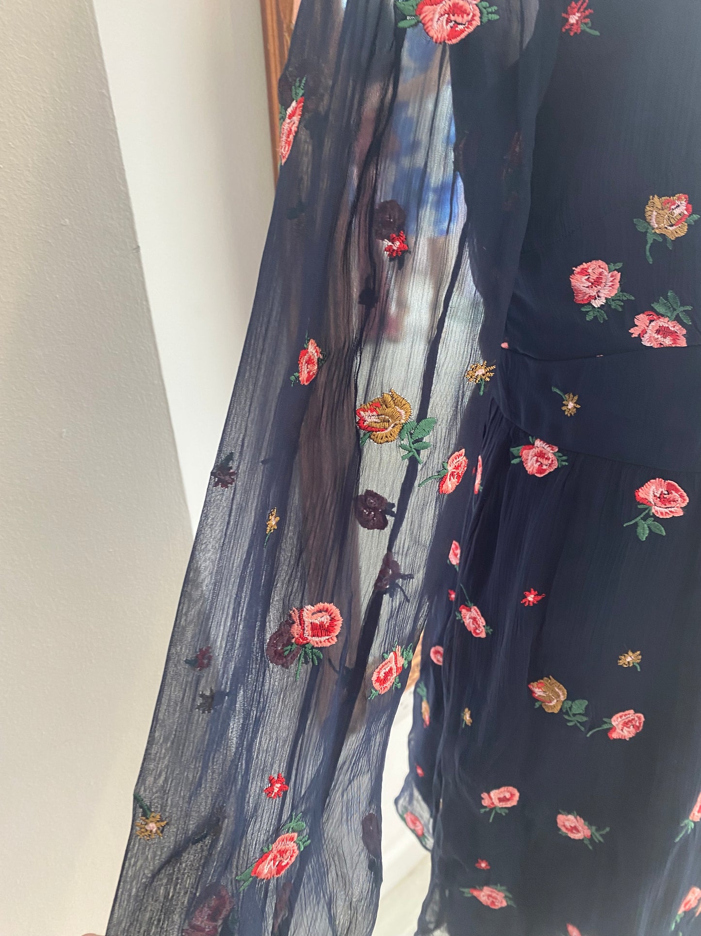 This dress is beautiful and has embroidered roses throughout. It’s a navy blue dress with pink roses. The sleeves are sheer. In great condition, lightly worn.