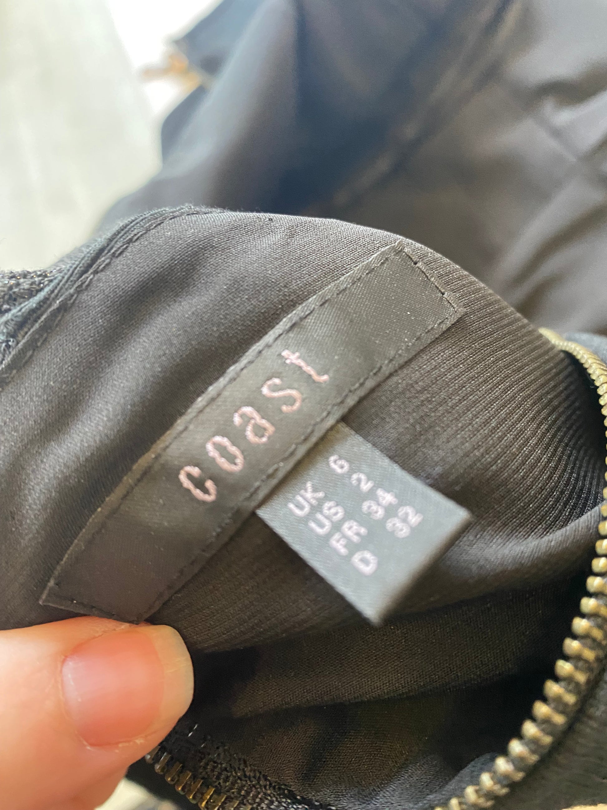 Lovely top, zips at the back to fasten and has cross over straps at the back which are a black shimmery fabric. Marked up a size 6, fits like a 6-8.