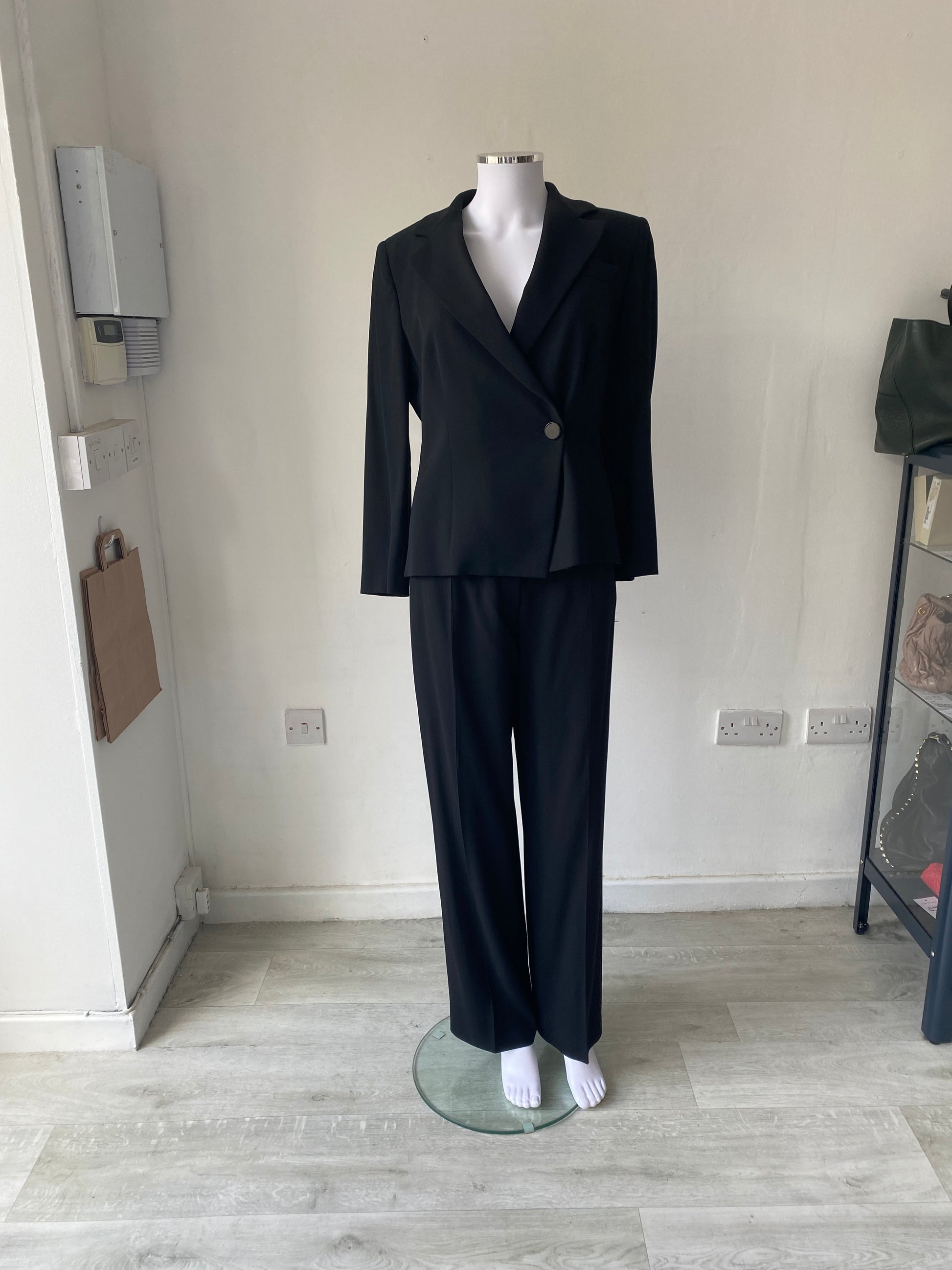 Gorgeous black trouser suit, in good condition. The jacket has an internal button to cinch it in, the external buttons have a pearly finish. The trousers have lovely button detailing around the waistband.