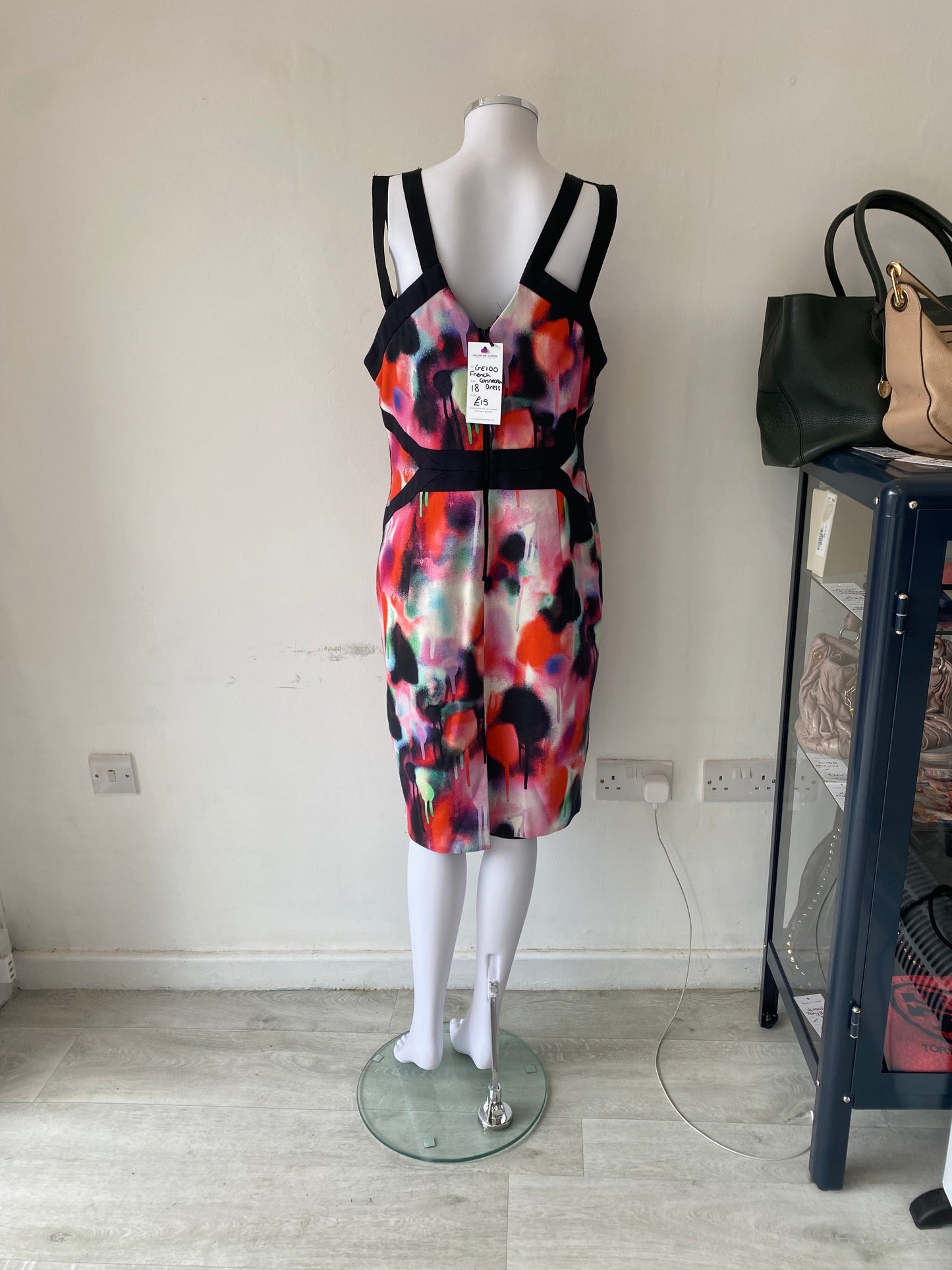This dress features a beautiful print. It would fit a size 18 and would be perfect for a summer wedding or event.