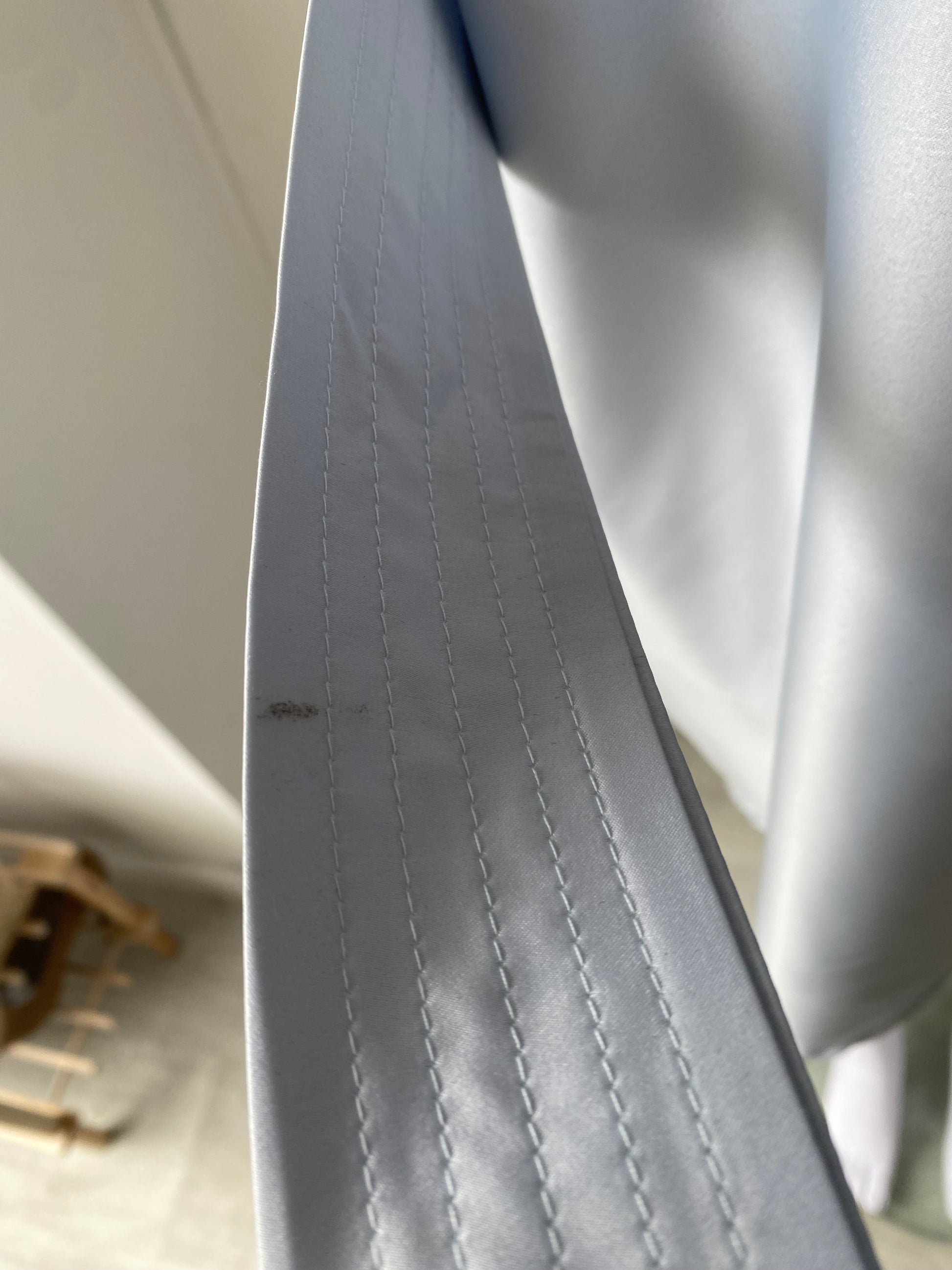 Lovely silk feel dress with a belt and asymmetric buttons. It does have a small fake tan mark on the inside of the belt.