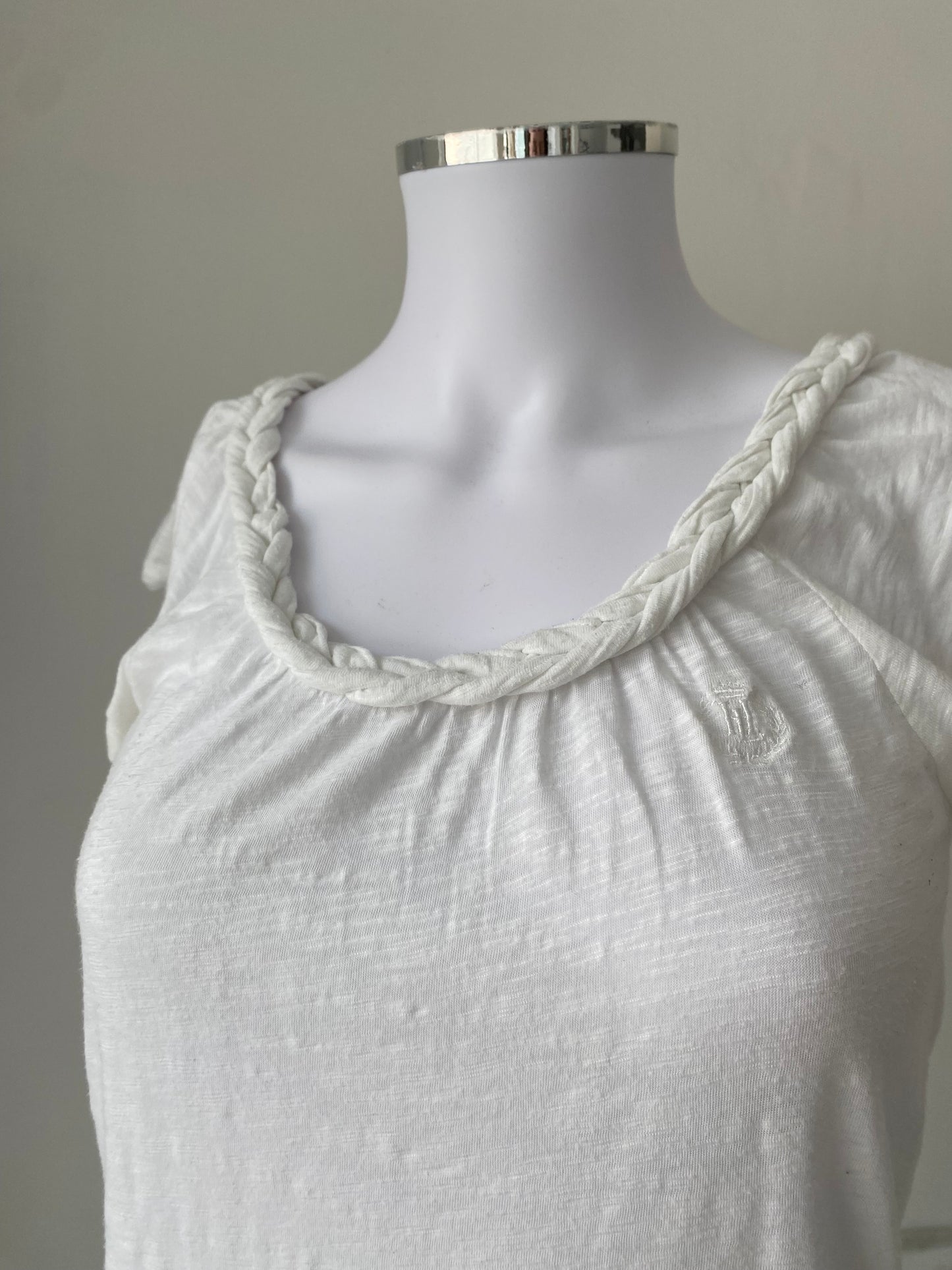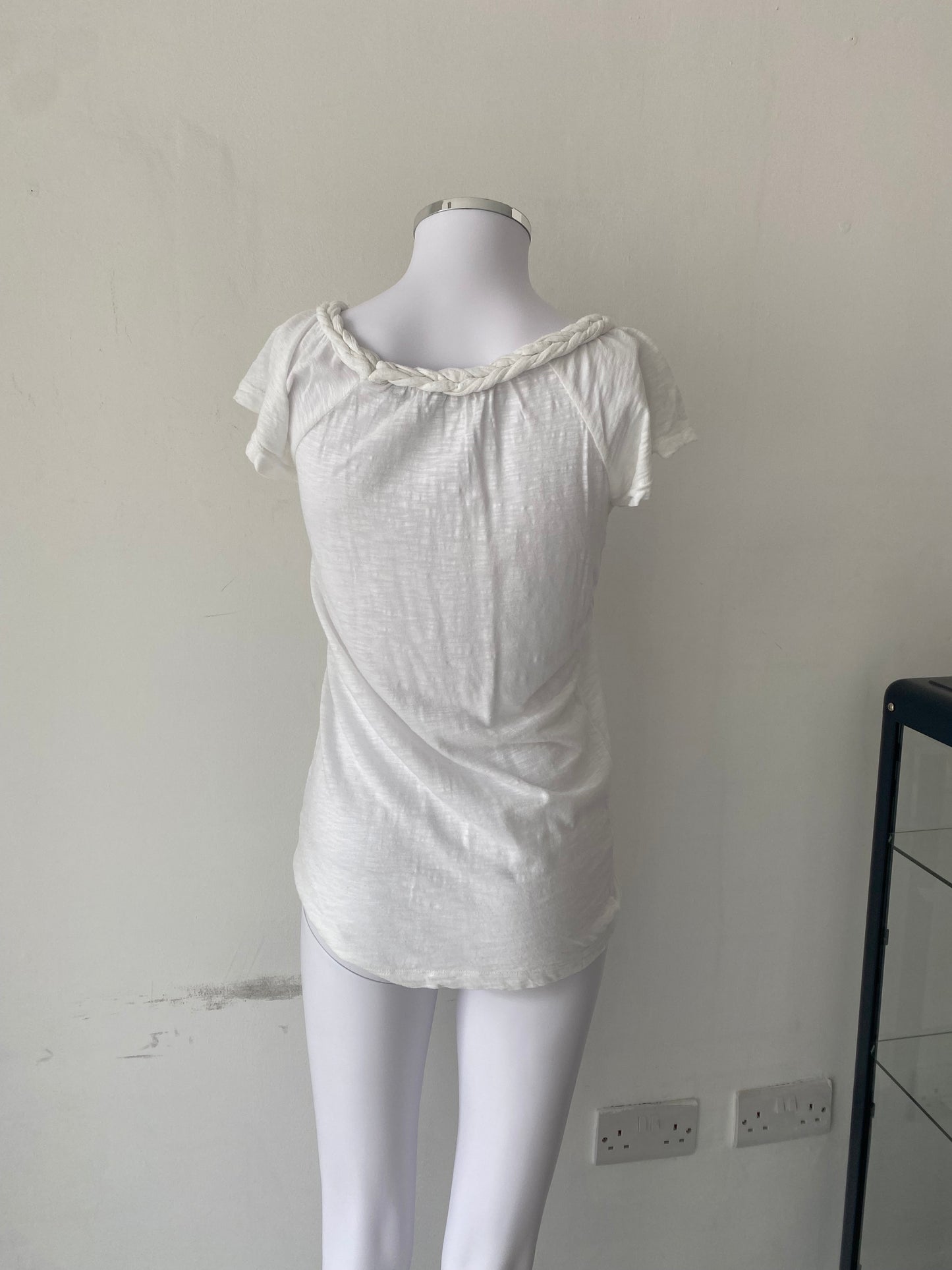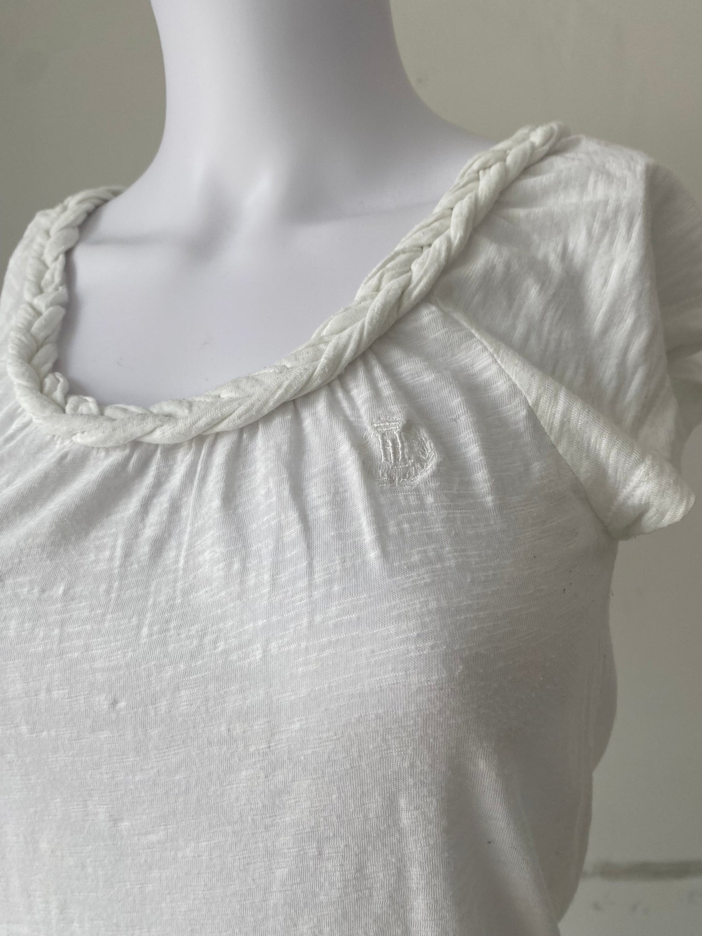 Lovely T-shirt, has nice braided fabric around the neck. Does have a small mark.