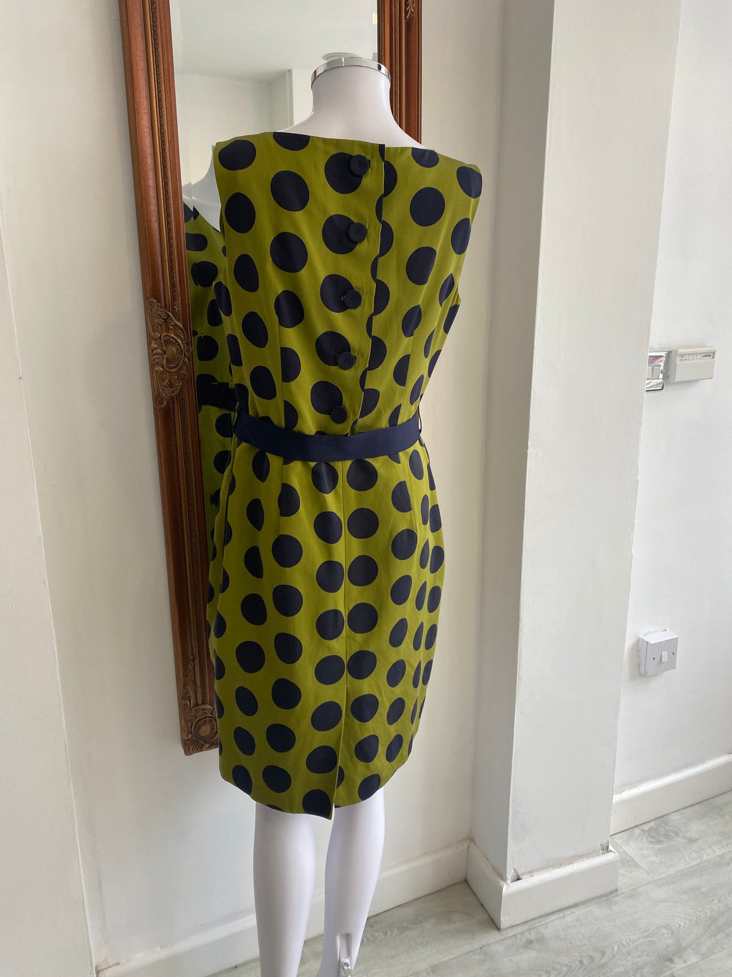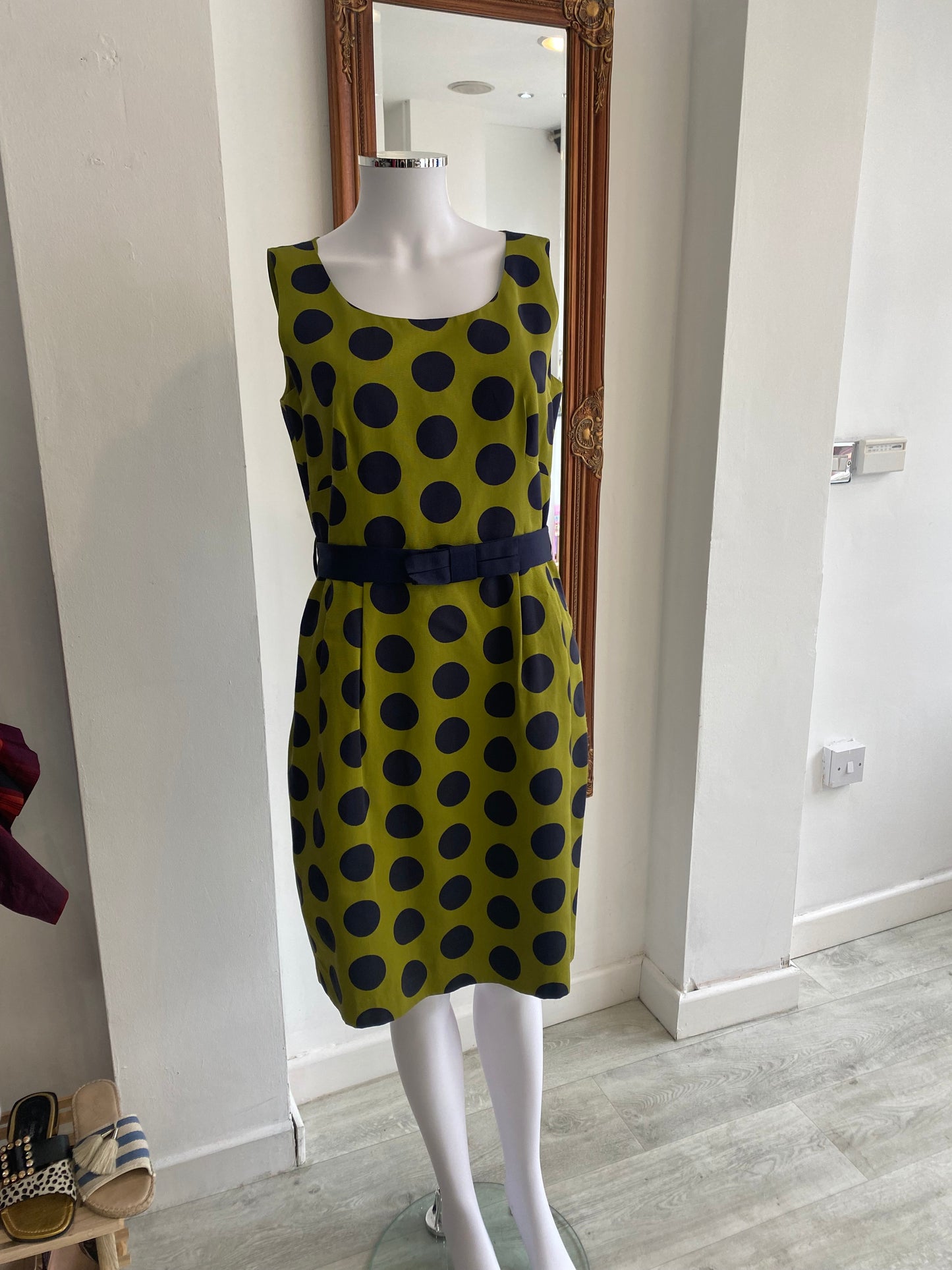 This dress is beautiful, very lightly worn. It is green with navy polka dots and a bow belt.