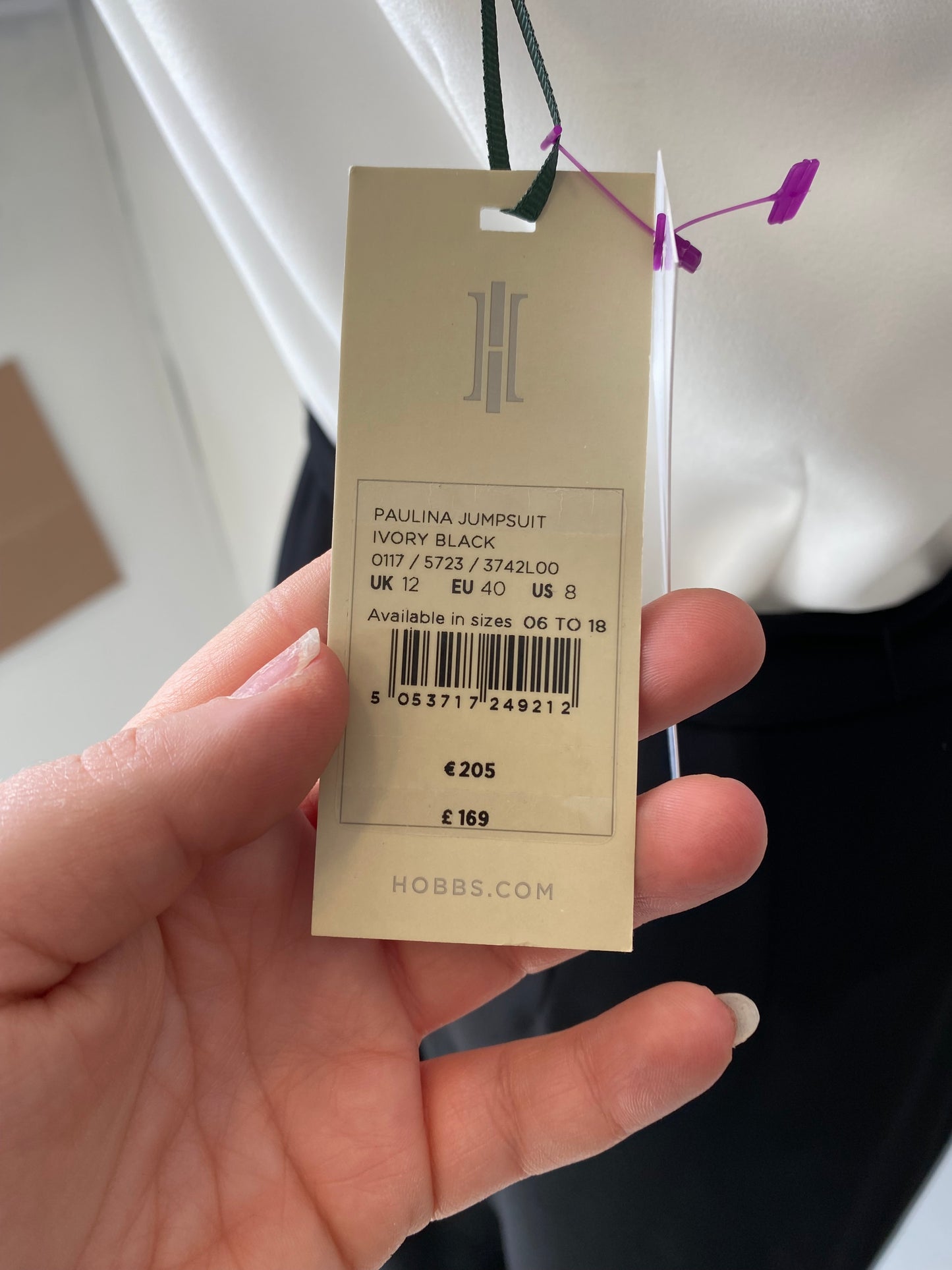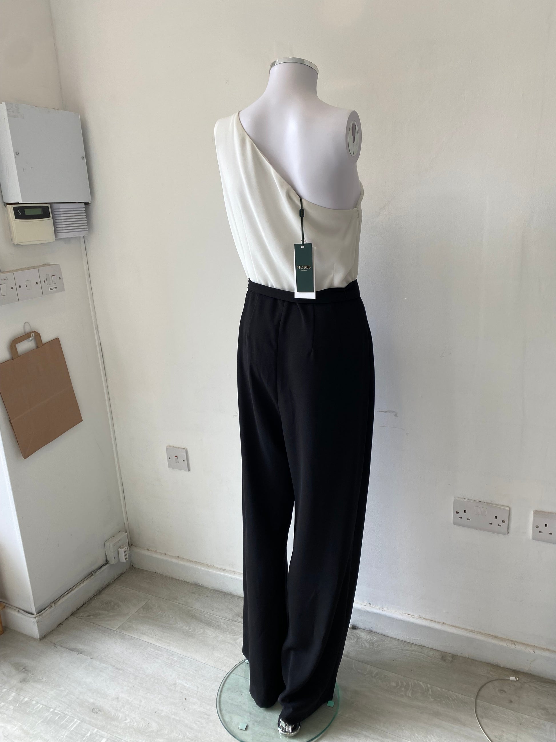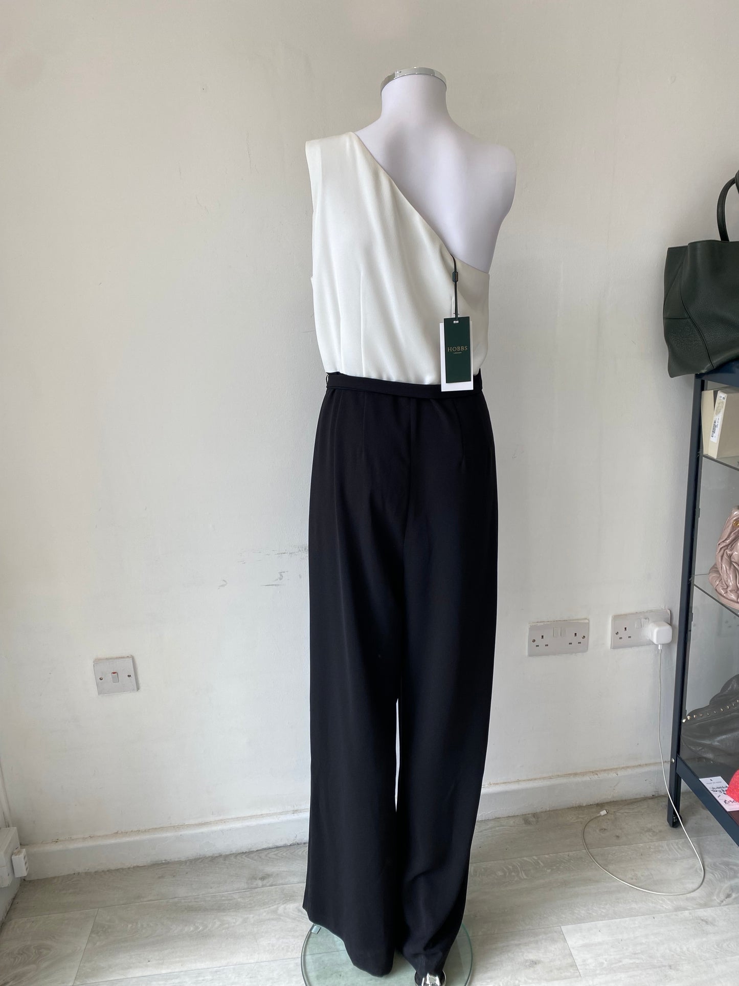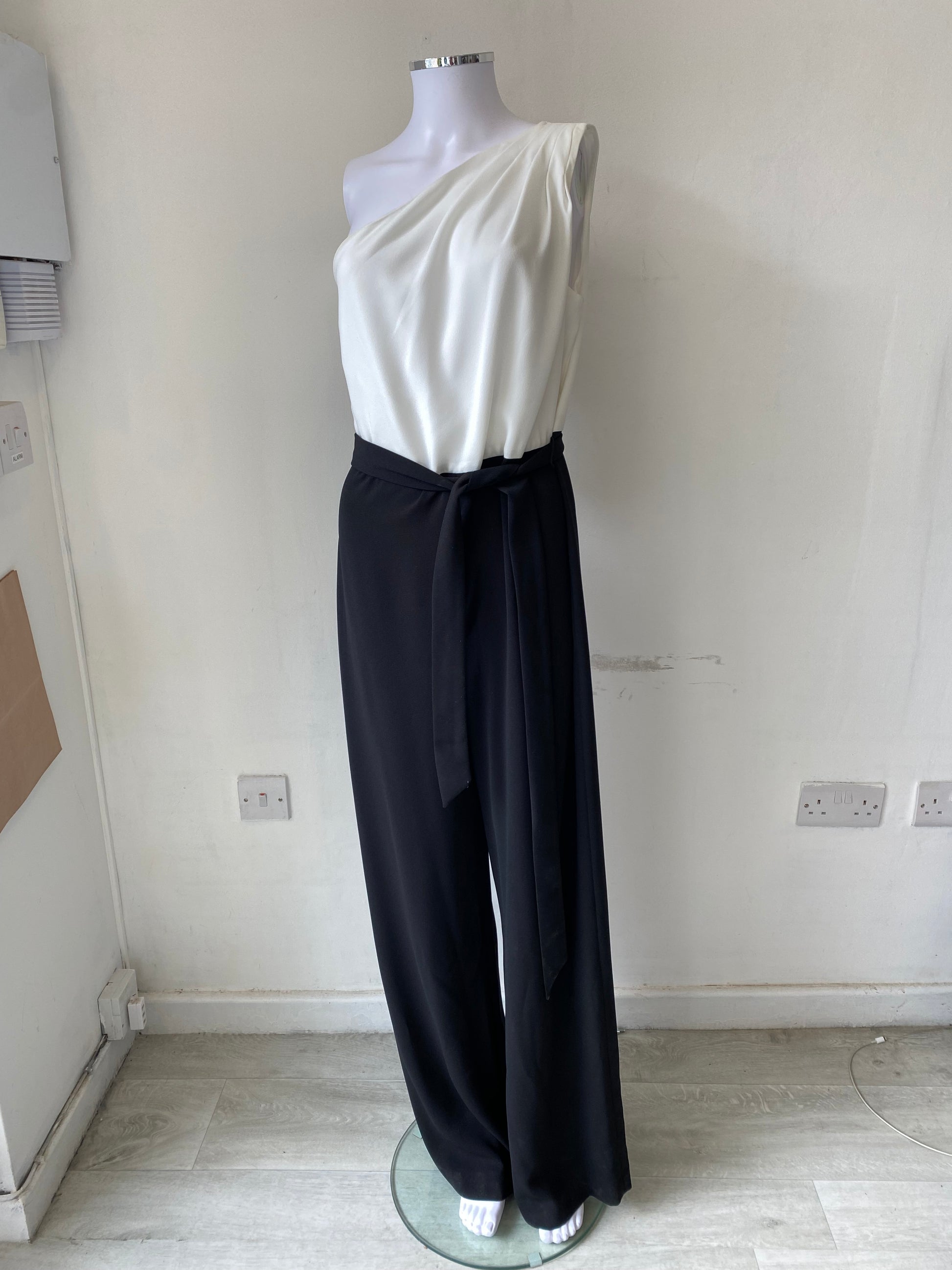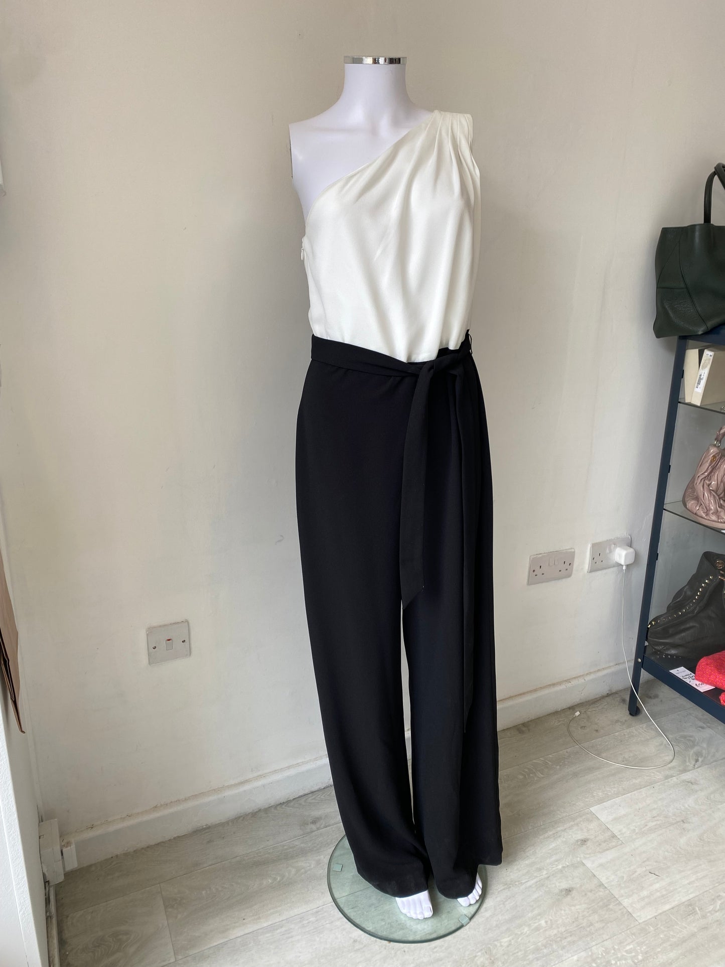 This jumpsuit is new with tags. It has a tie belt around the middle and the top part is cream and off one shoulder.