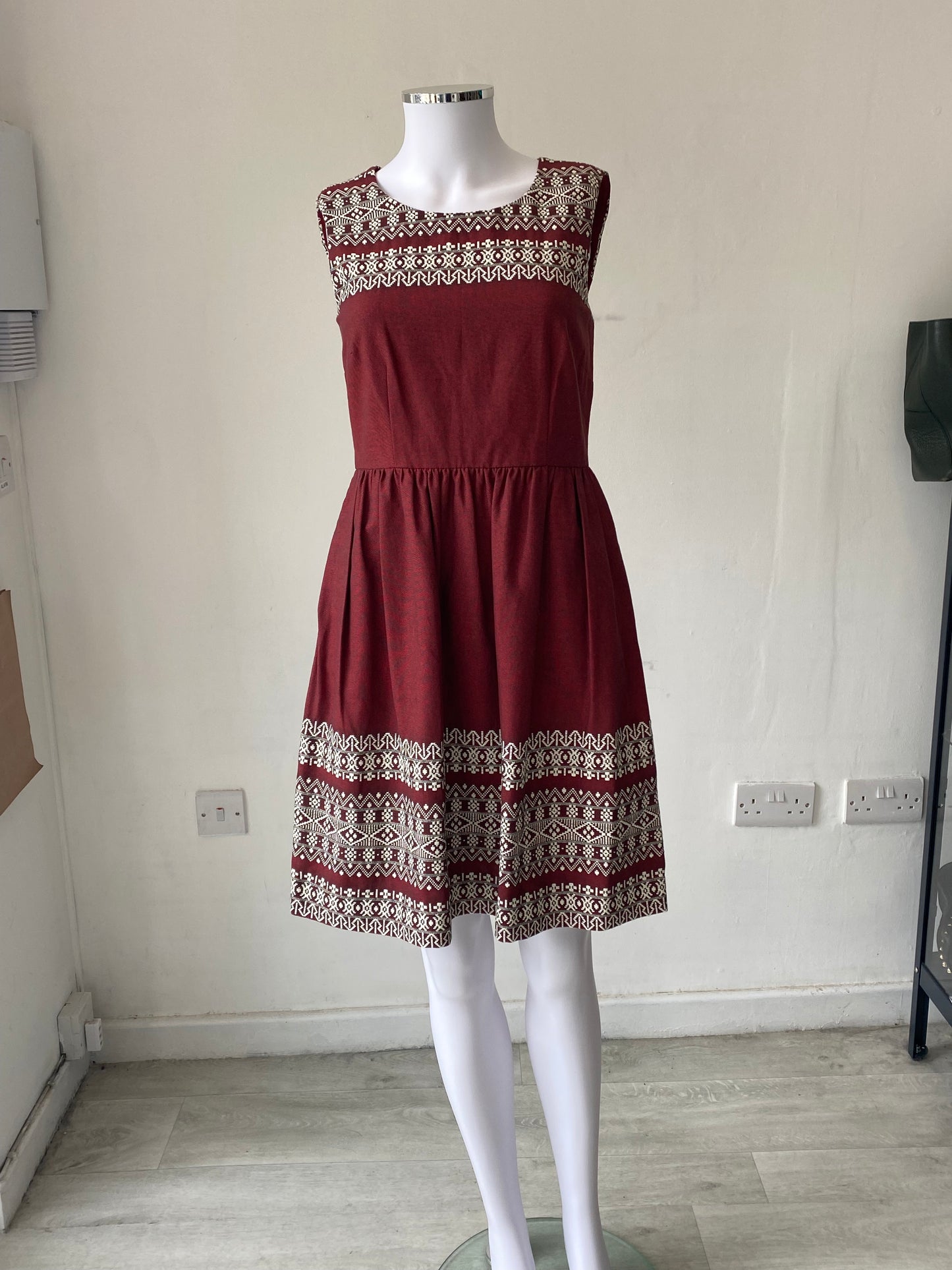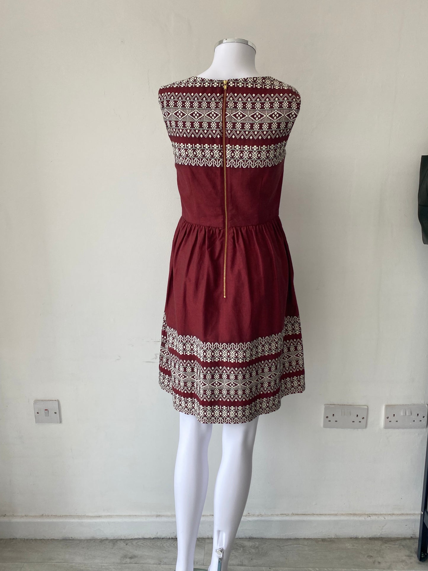 Hobbs NW3 Burgundy Cotton Dress with Embroidered Detailing Size 6