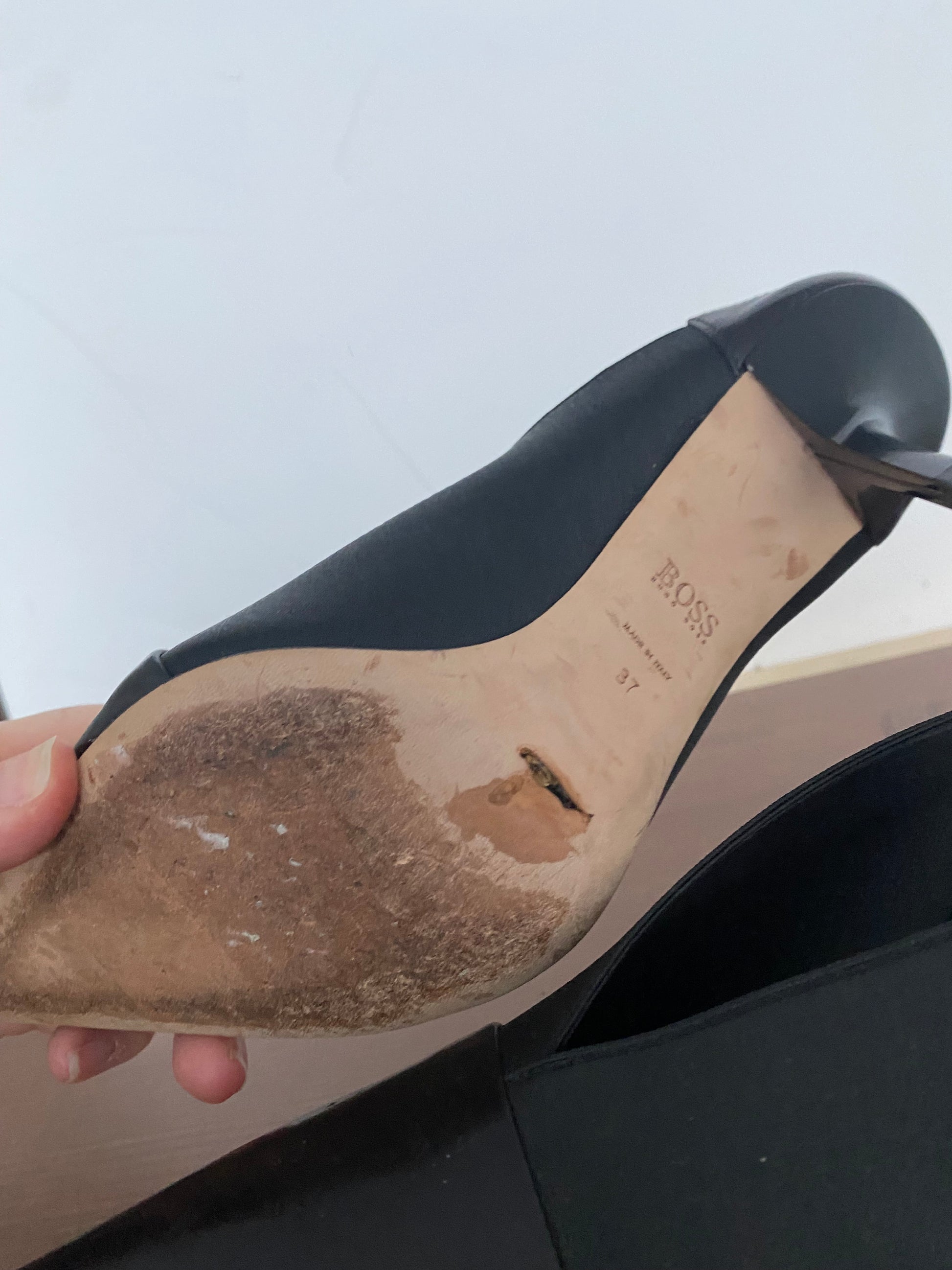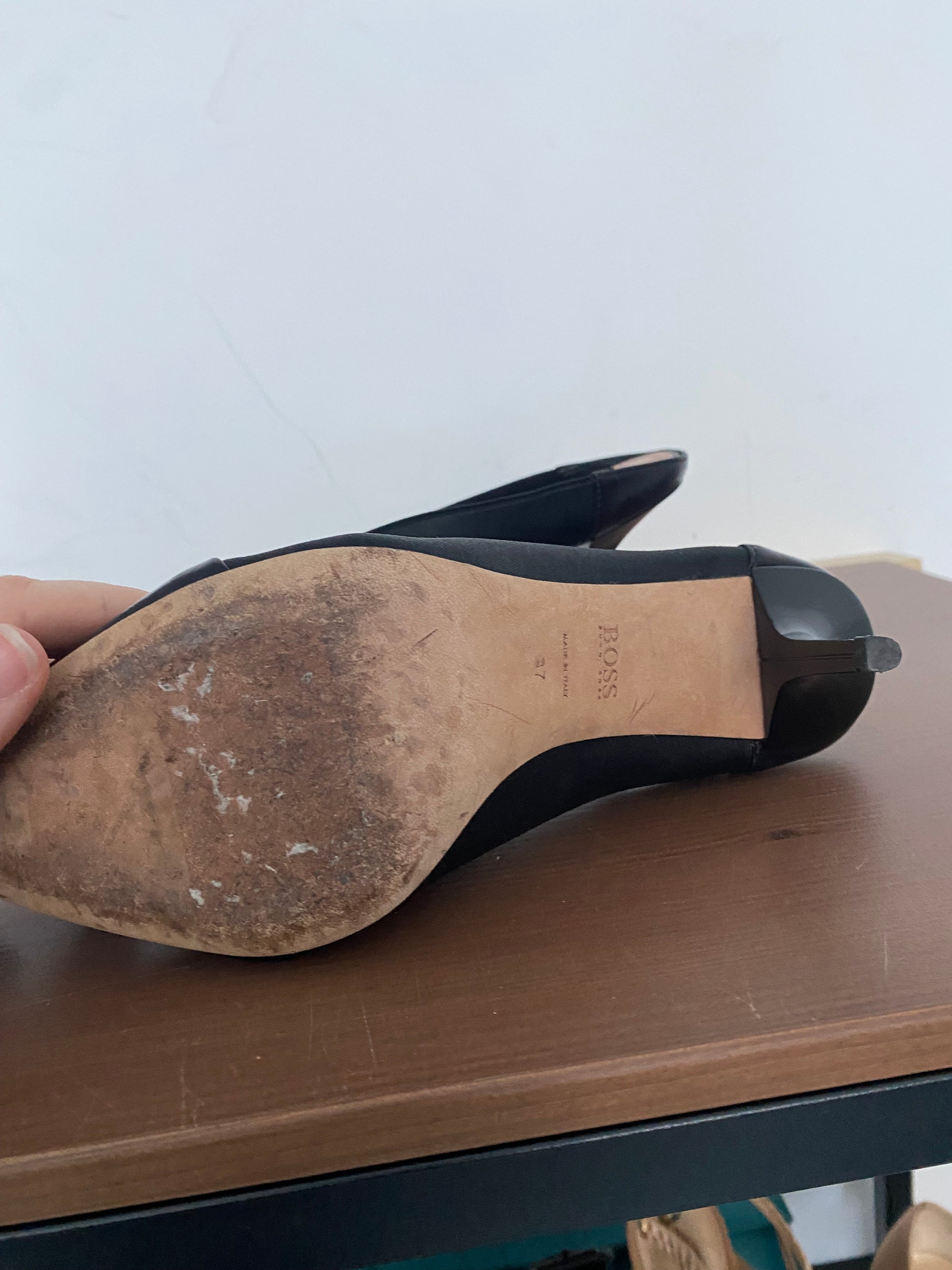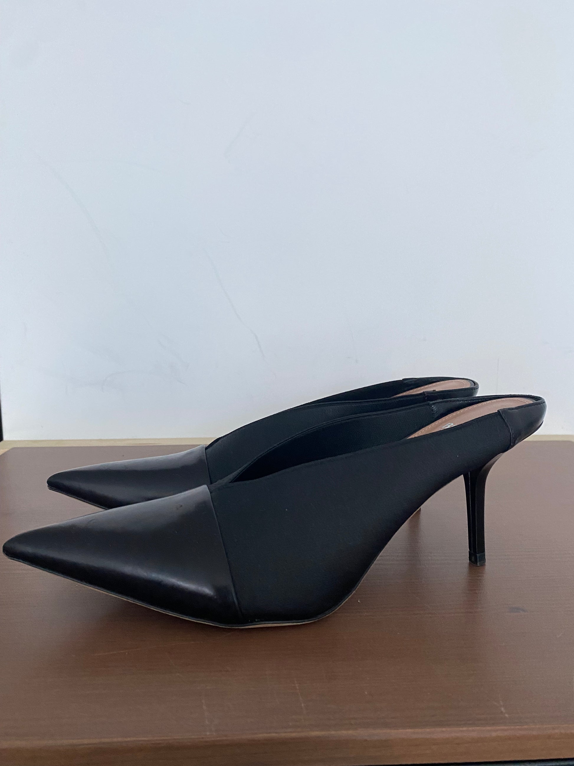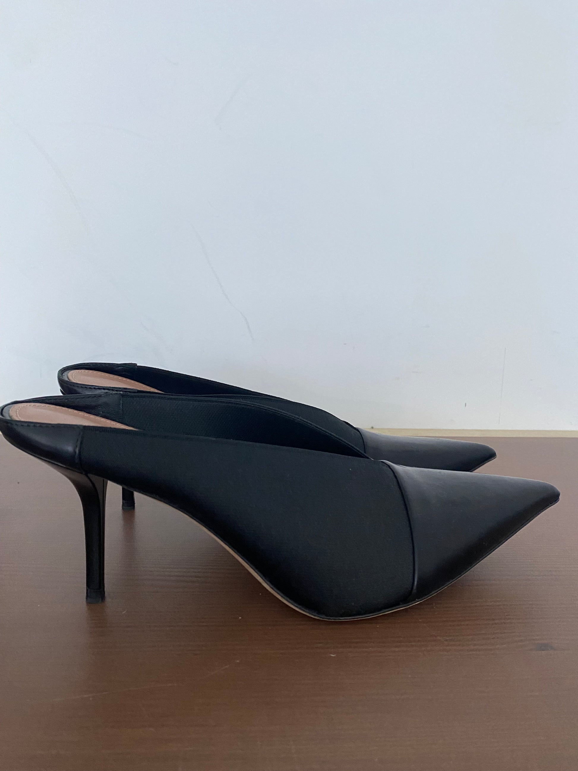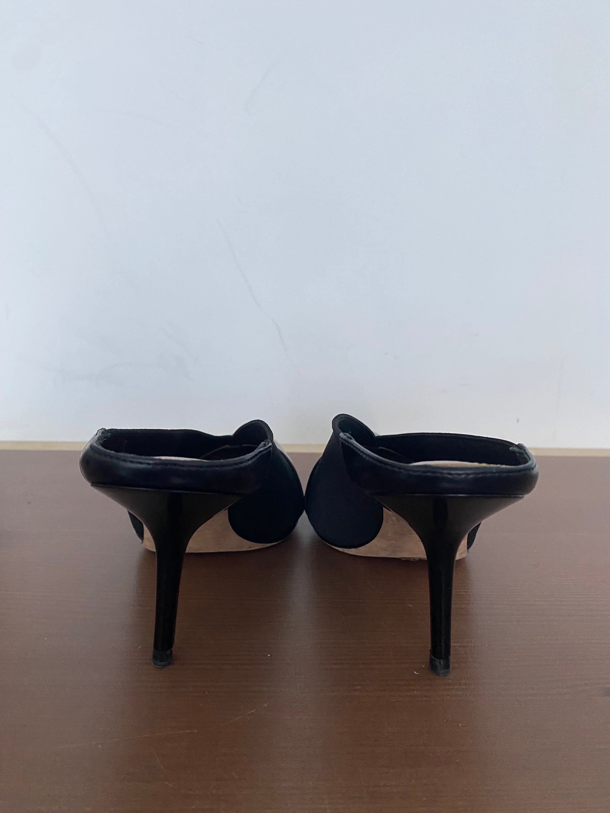 Lovely soft leather and fabric black heels, they have quite a low heel. The back is mule style, so backless. Size 37 UK 4, no dust bag or box, shoes only. In very good, lightly worn condition.