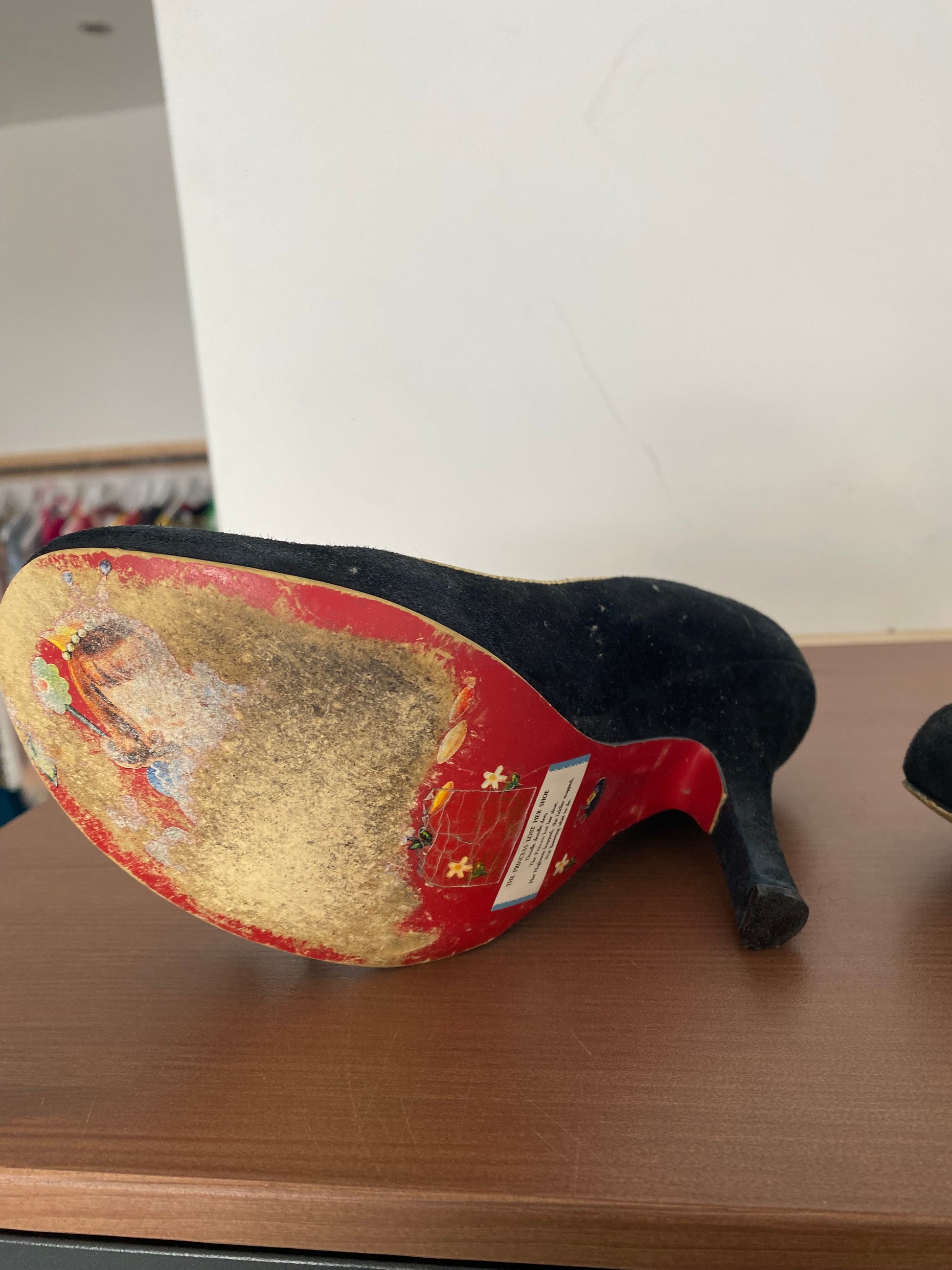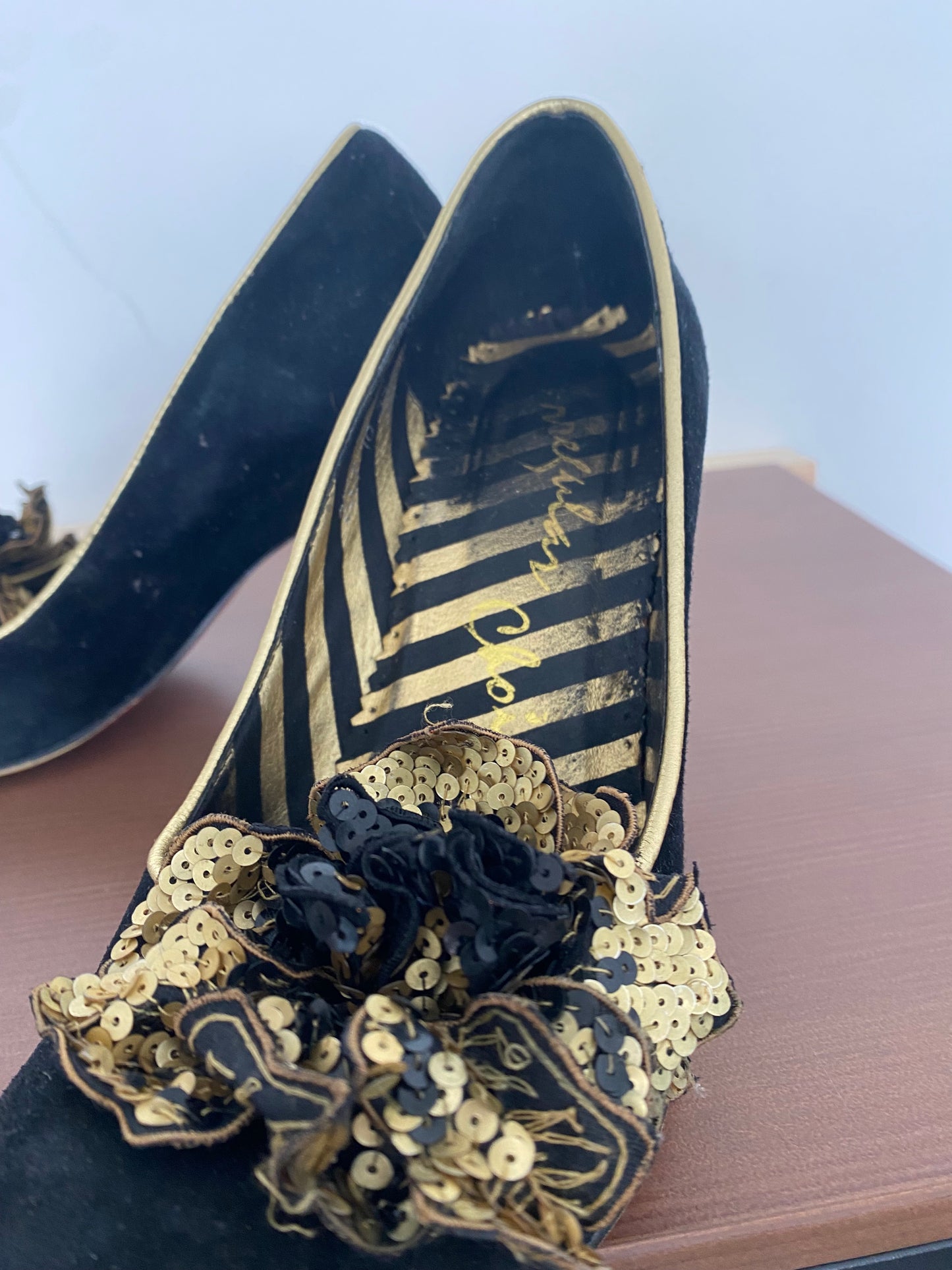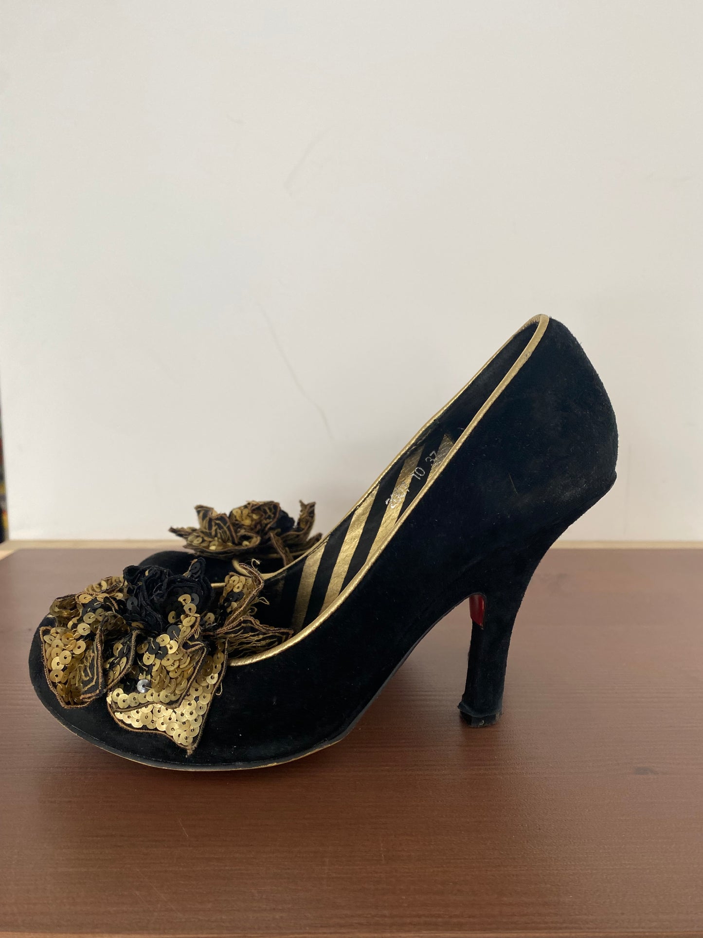 These heels are beautiful with a black and gold sequinned flower detail. They have been worn and show signs. The base shows signs of ware as does the suede which has some scuffing and marks throughout.