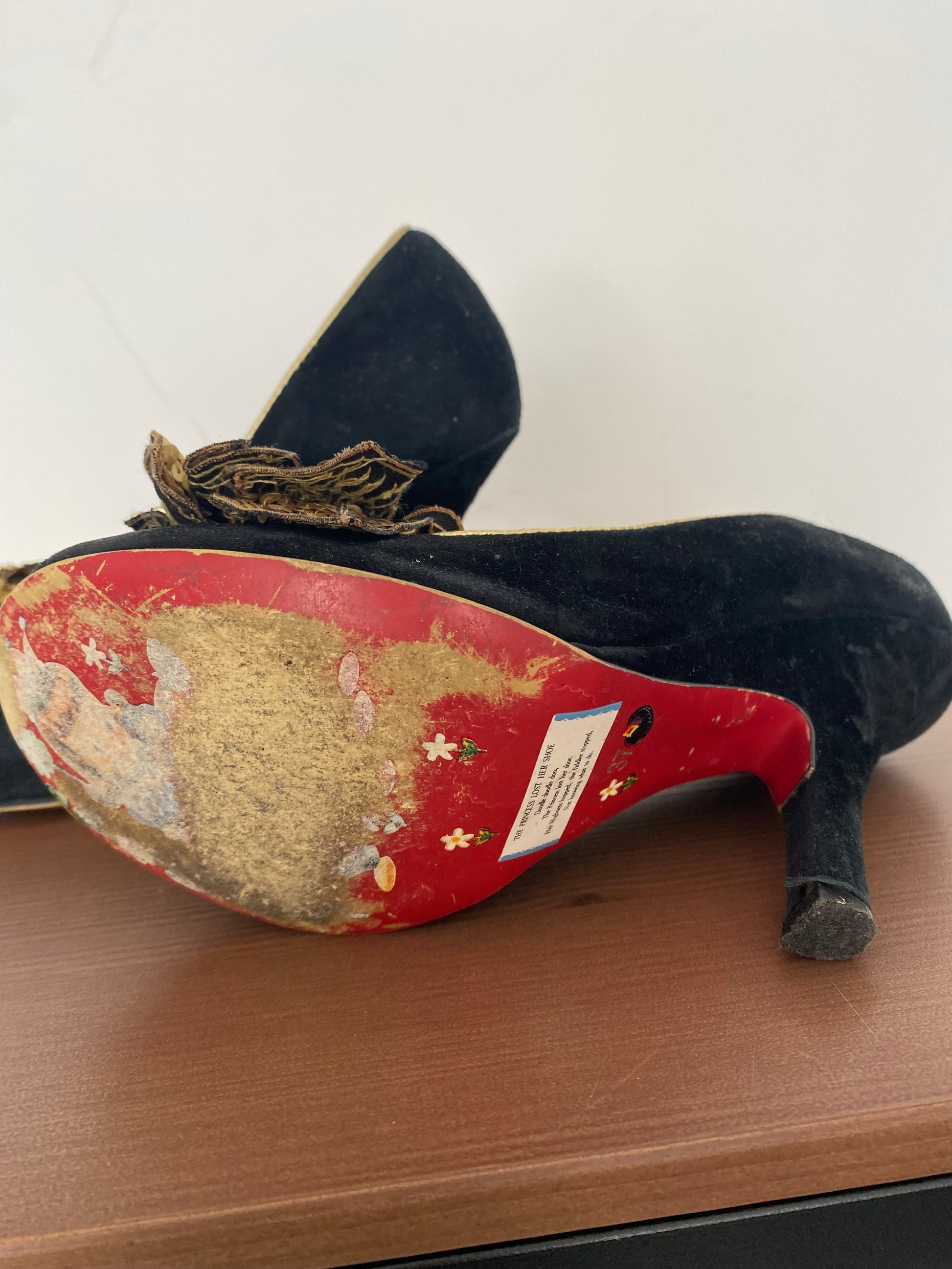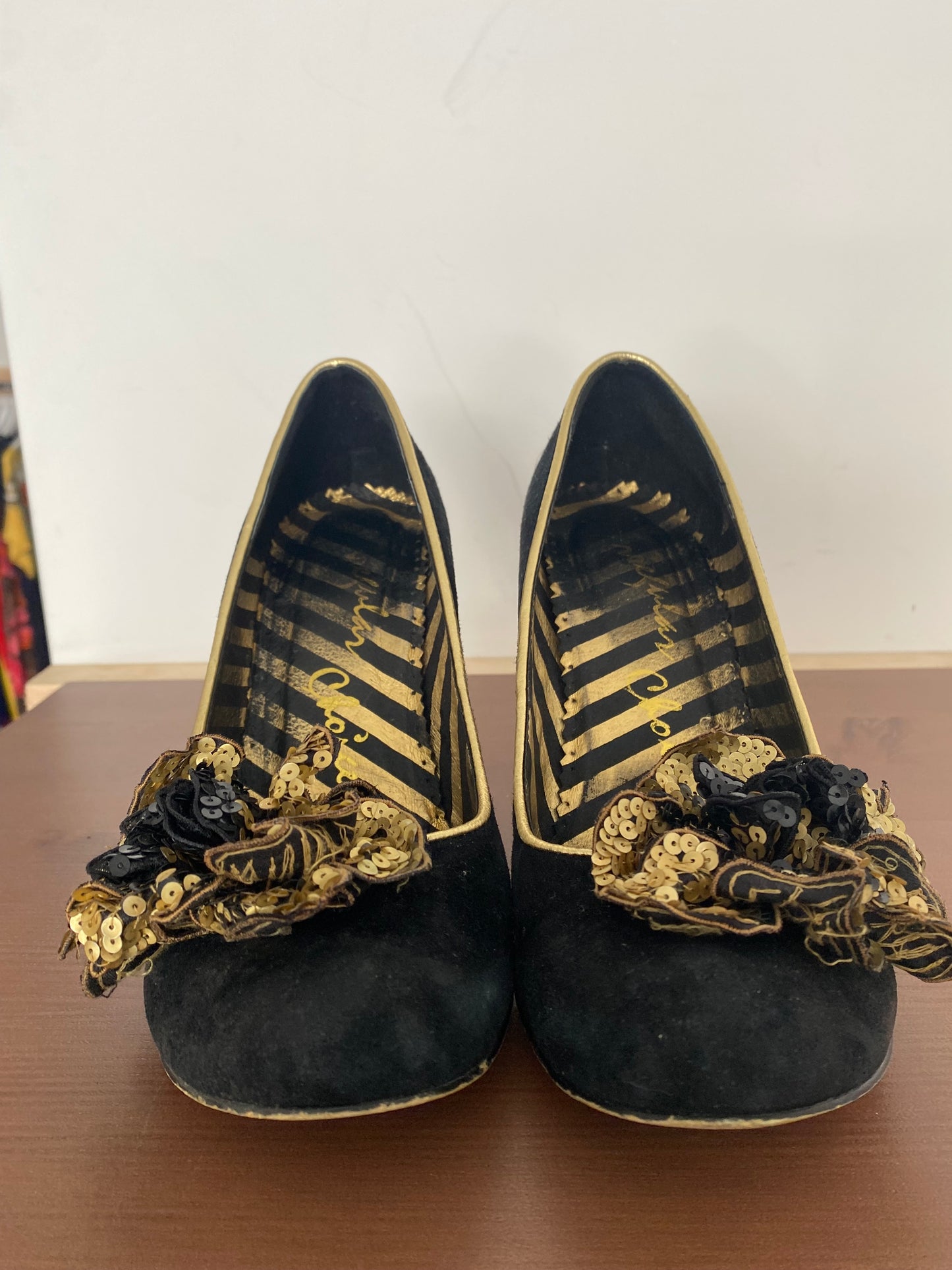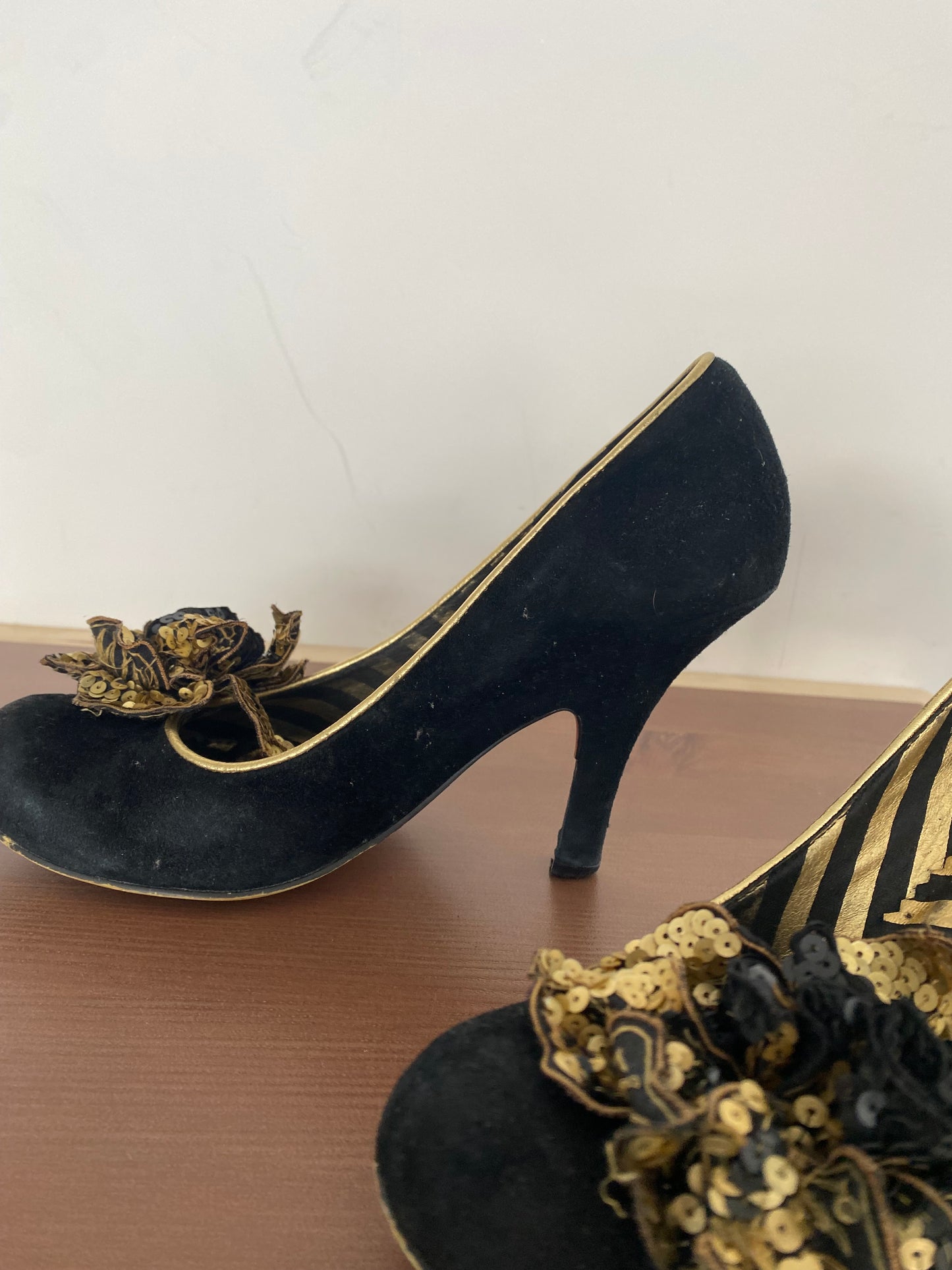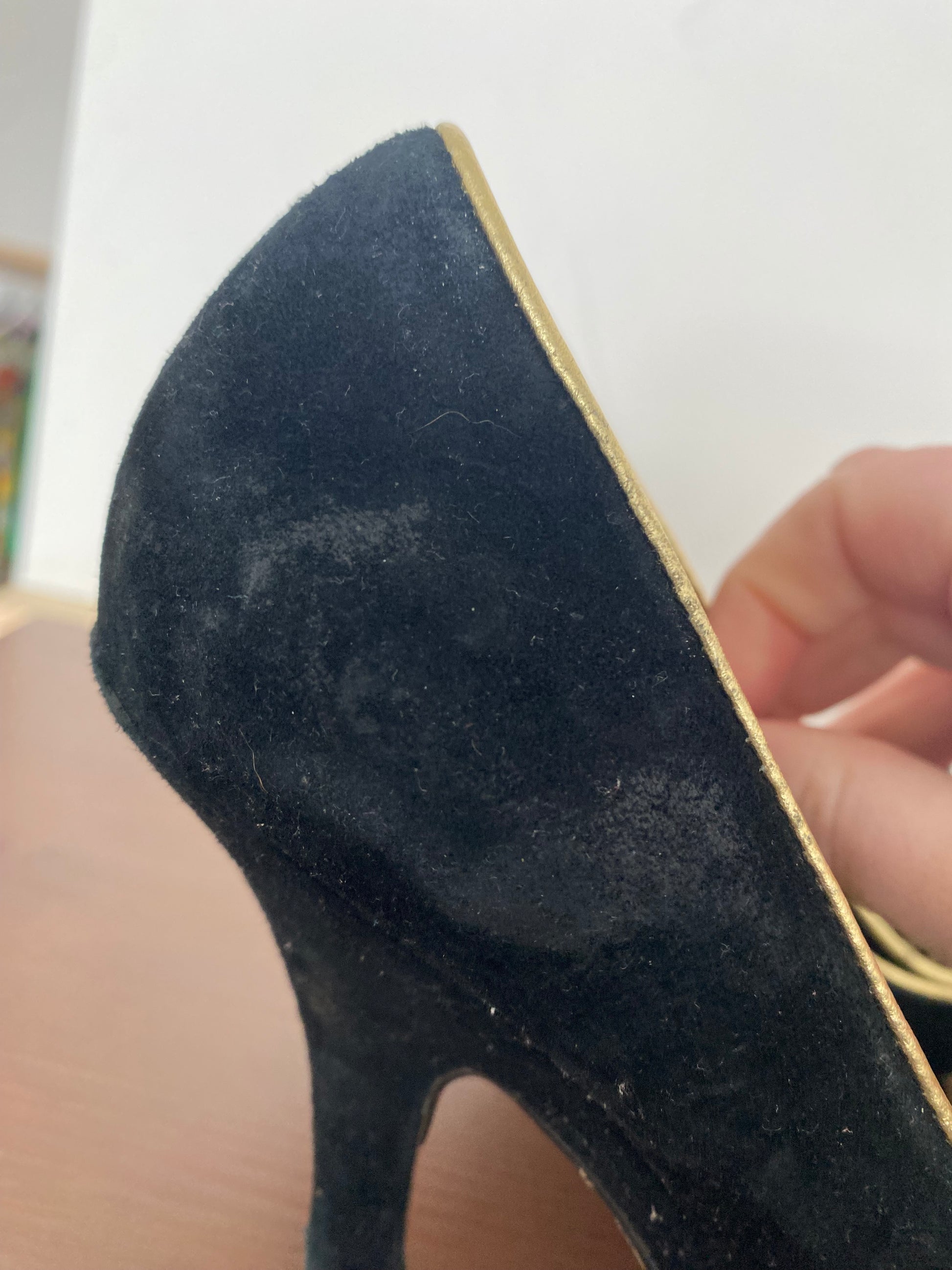 These heels are beautiful with a black and gold sequinned flower detail. They have been worn and show signs. The base shows signs of ware as does the suede which has some scuffing and marks throughout.