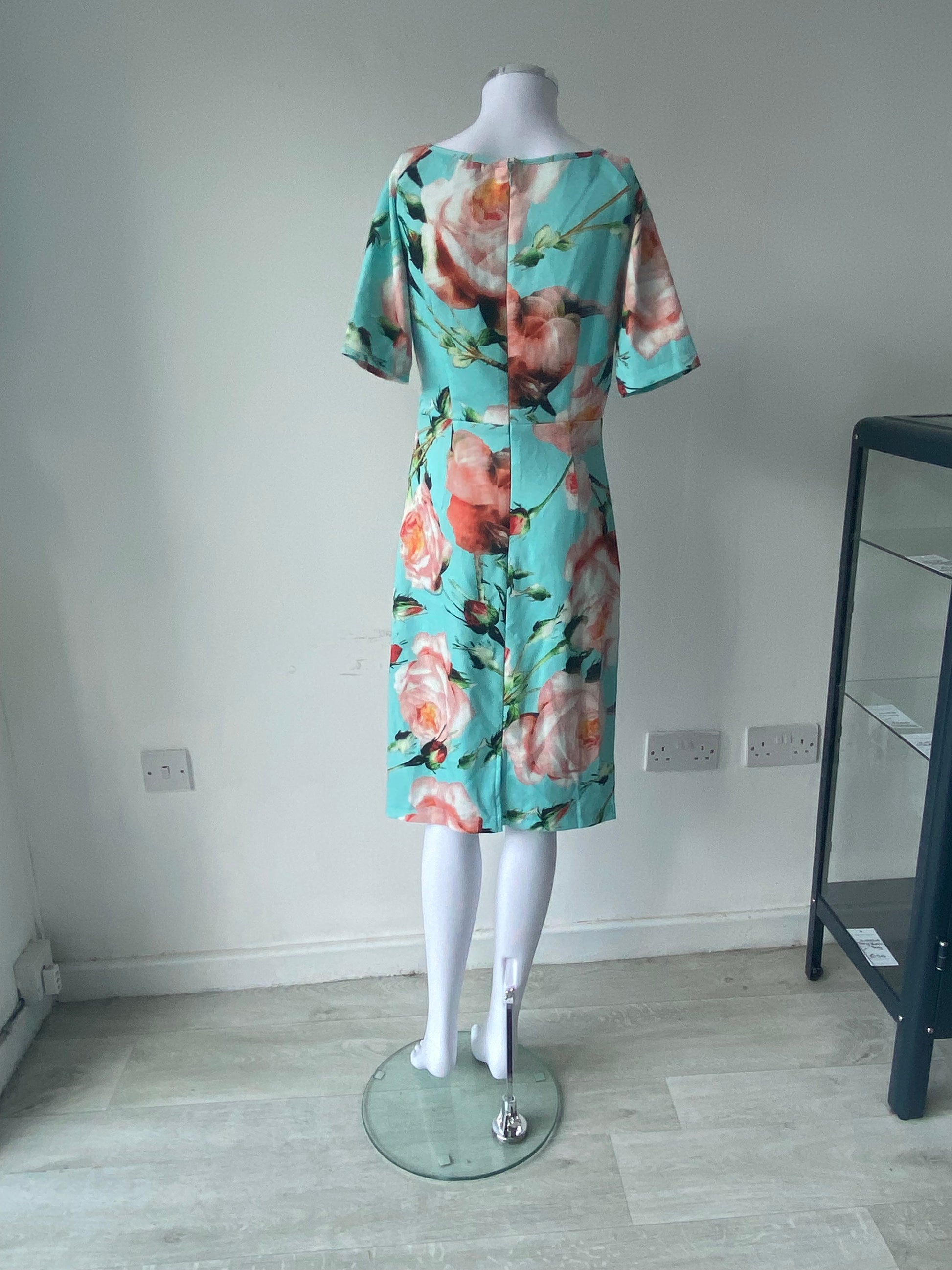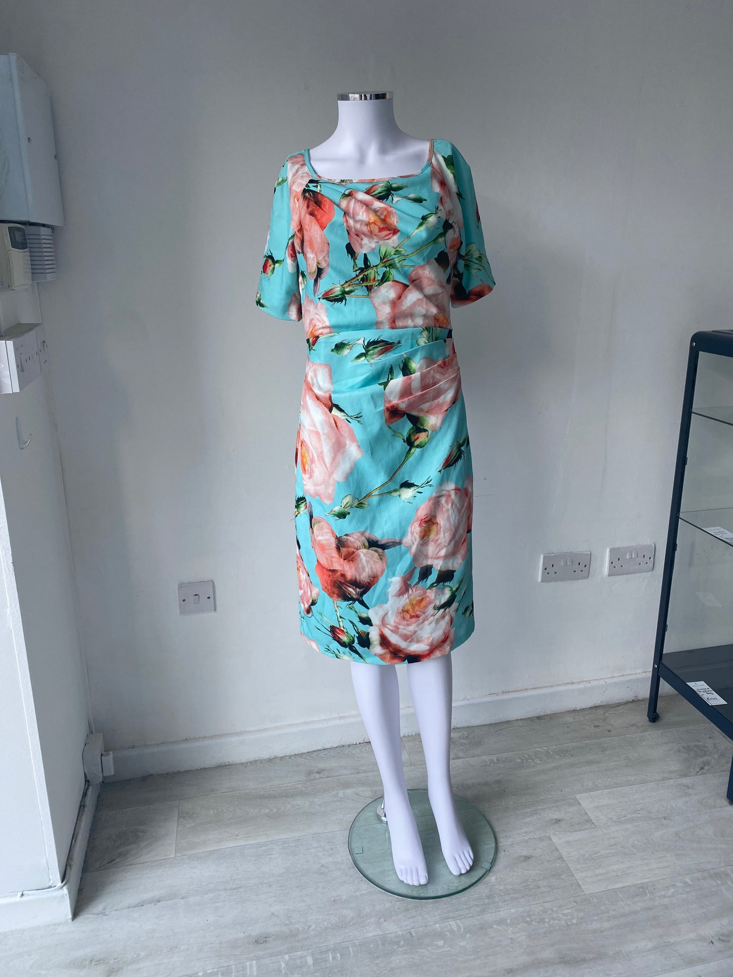 This dress is stunning and would be perfect for a wedding or for the races. It’s a turquoise base with a floral pattern. It has gathered fabric around the tummy making it very flattering.