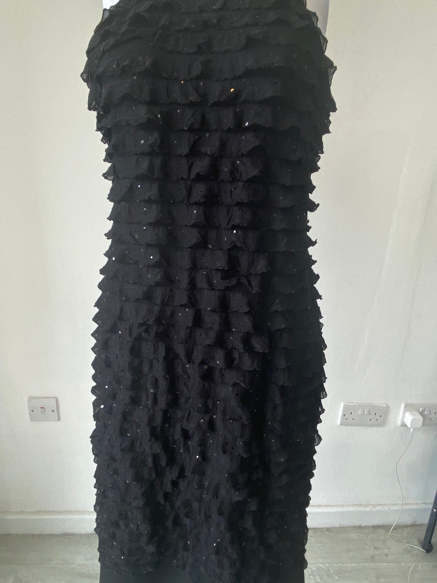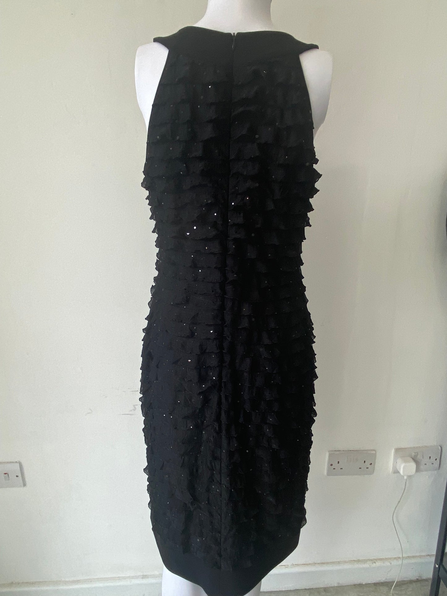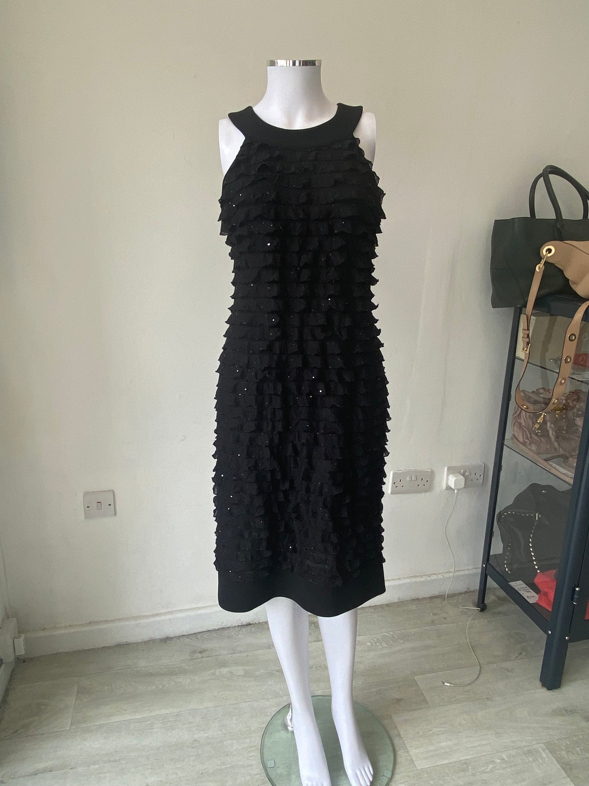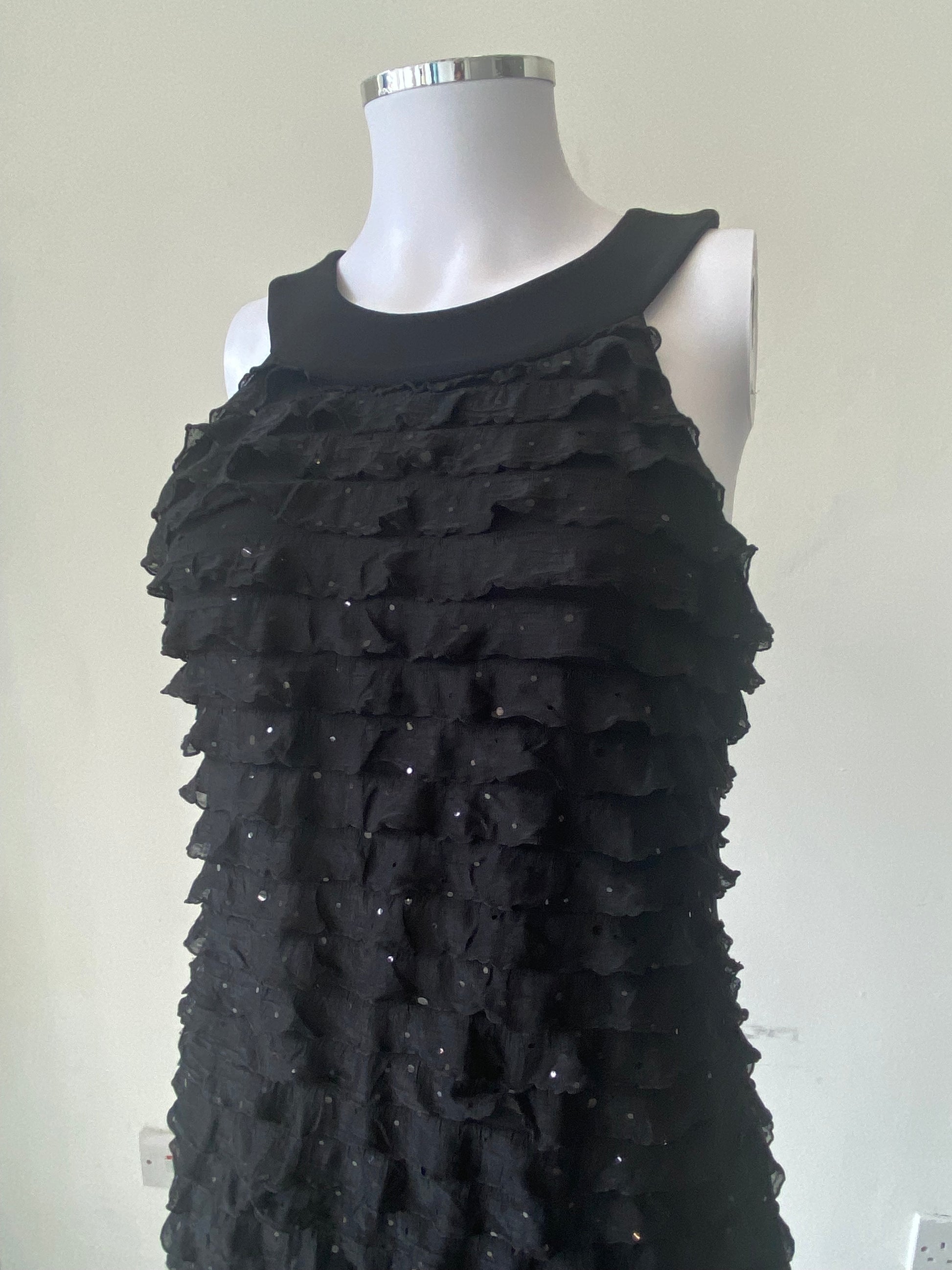 Lovely black dress with ruffle detailing and sparkly sequins throughout.