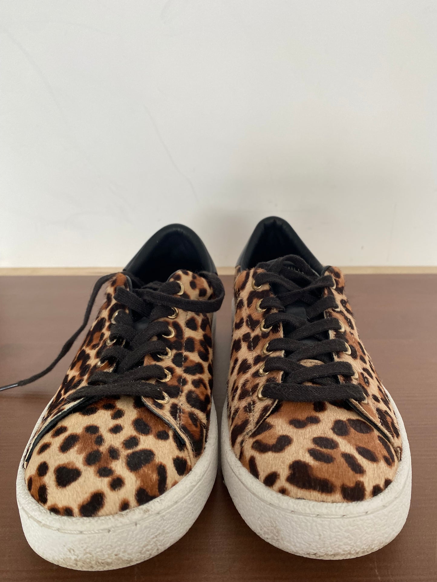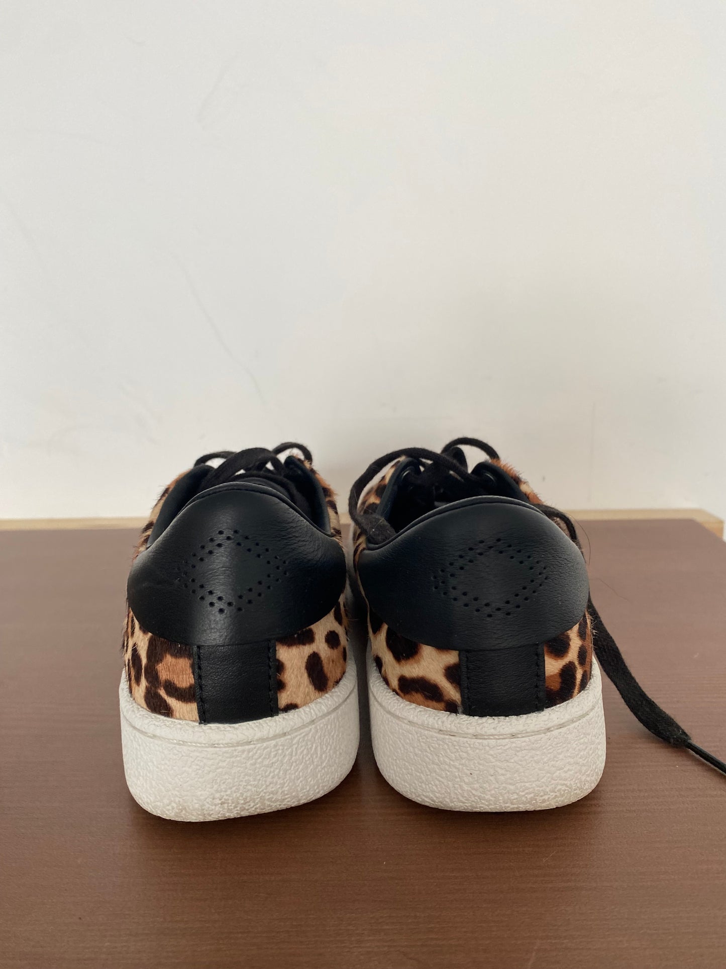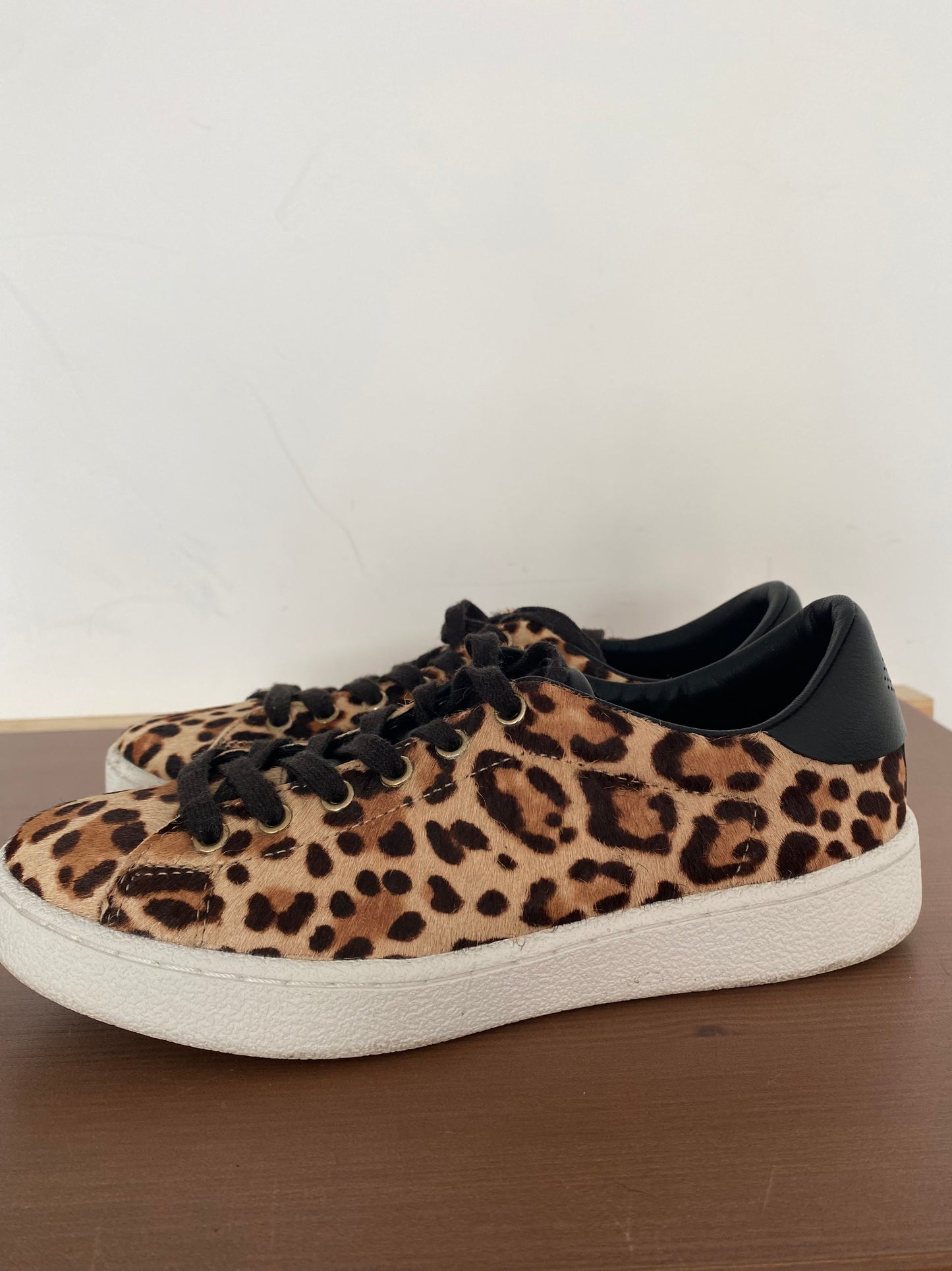 These trainers are in very good condition, very lightly worn. They are black and leopard print, the leopard print part is a pony skin fabric. They lace up to fasten. No box, trainers only.