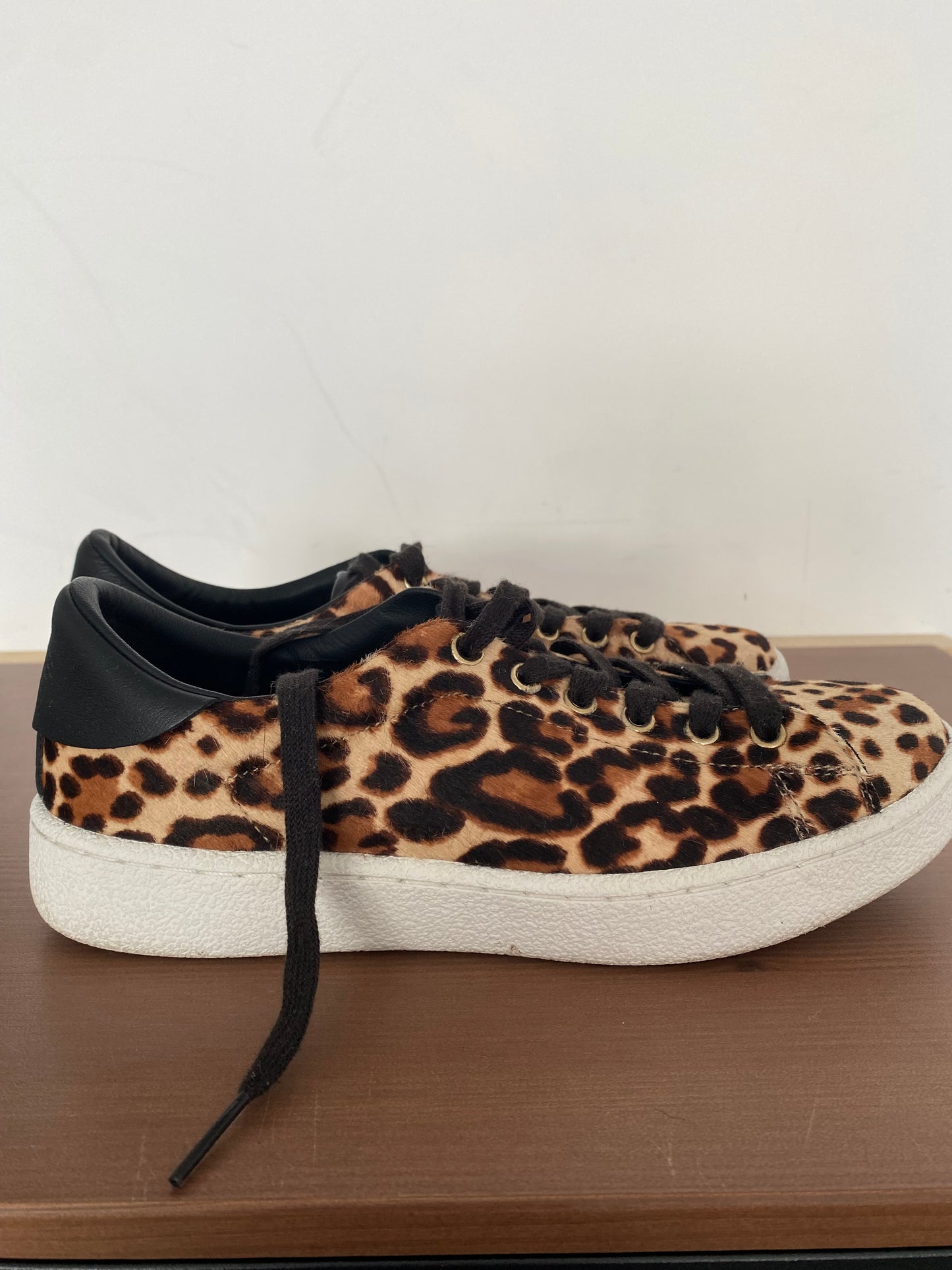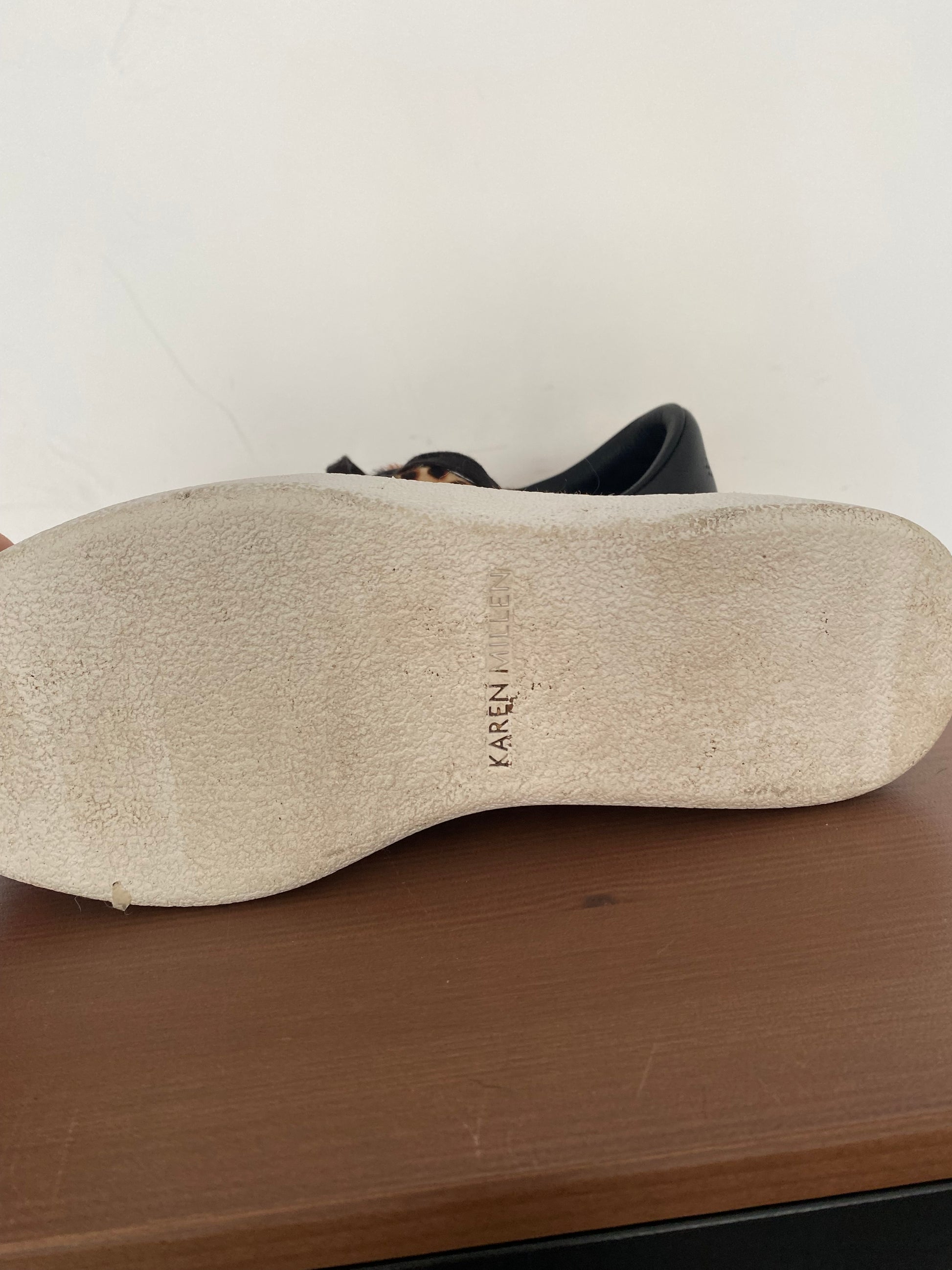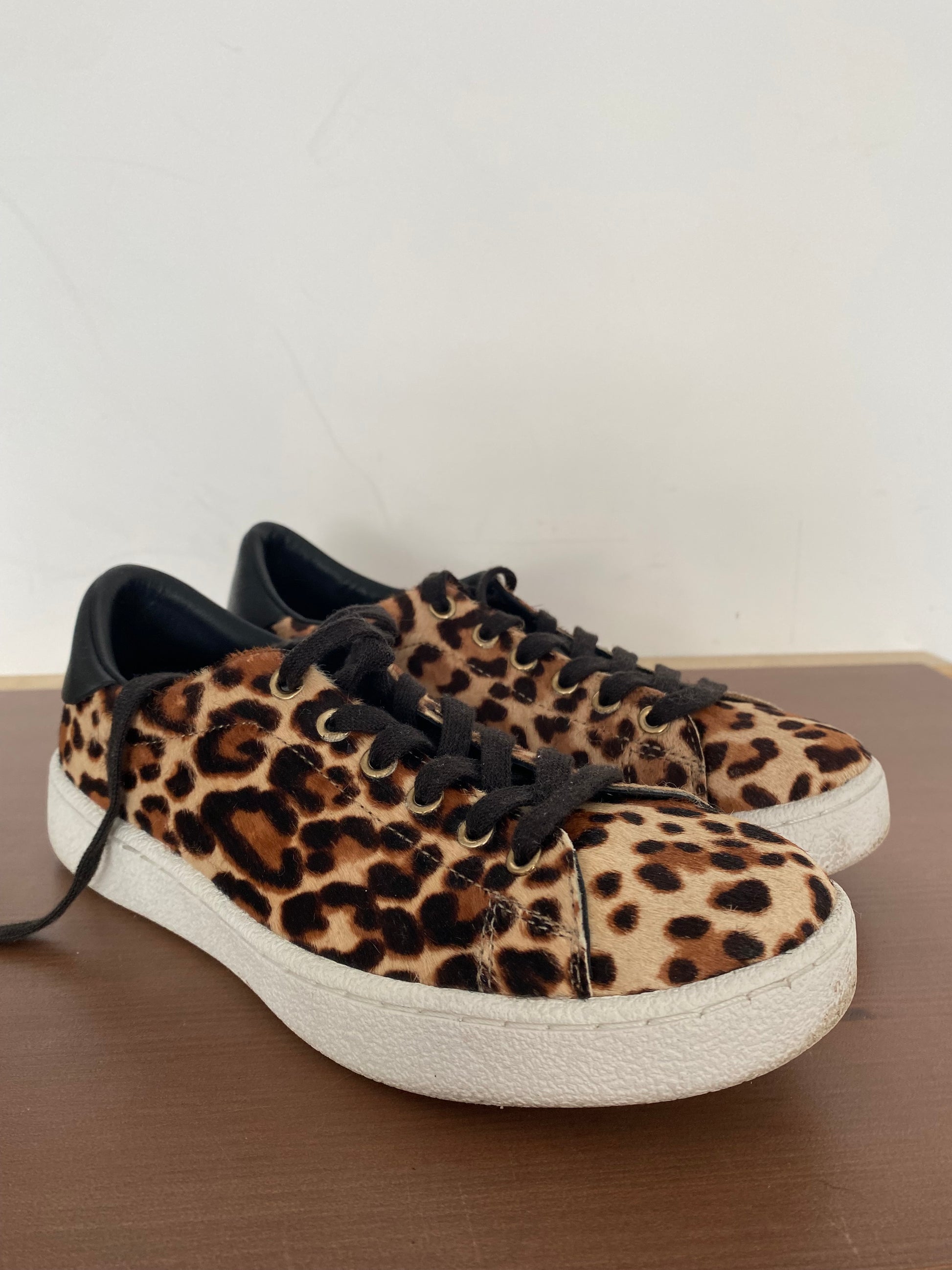 These trainers are in very good condition, very lightly worn. They are black and leopard print, the leopard print part is a pony skin fabric. They lace up to fasten. No box, trainers only.