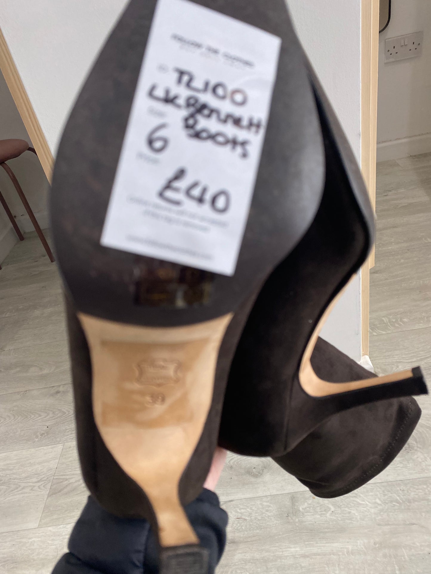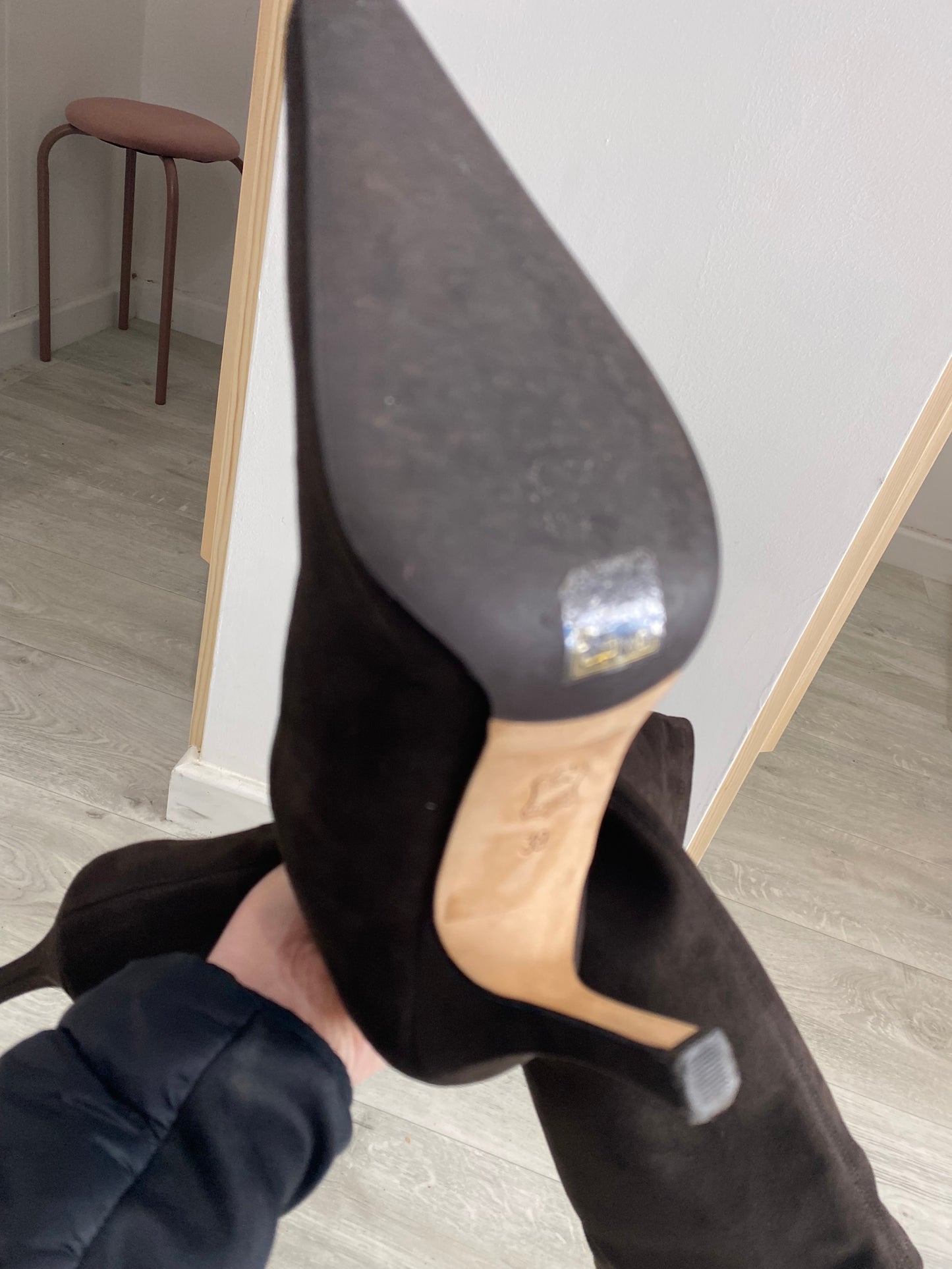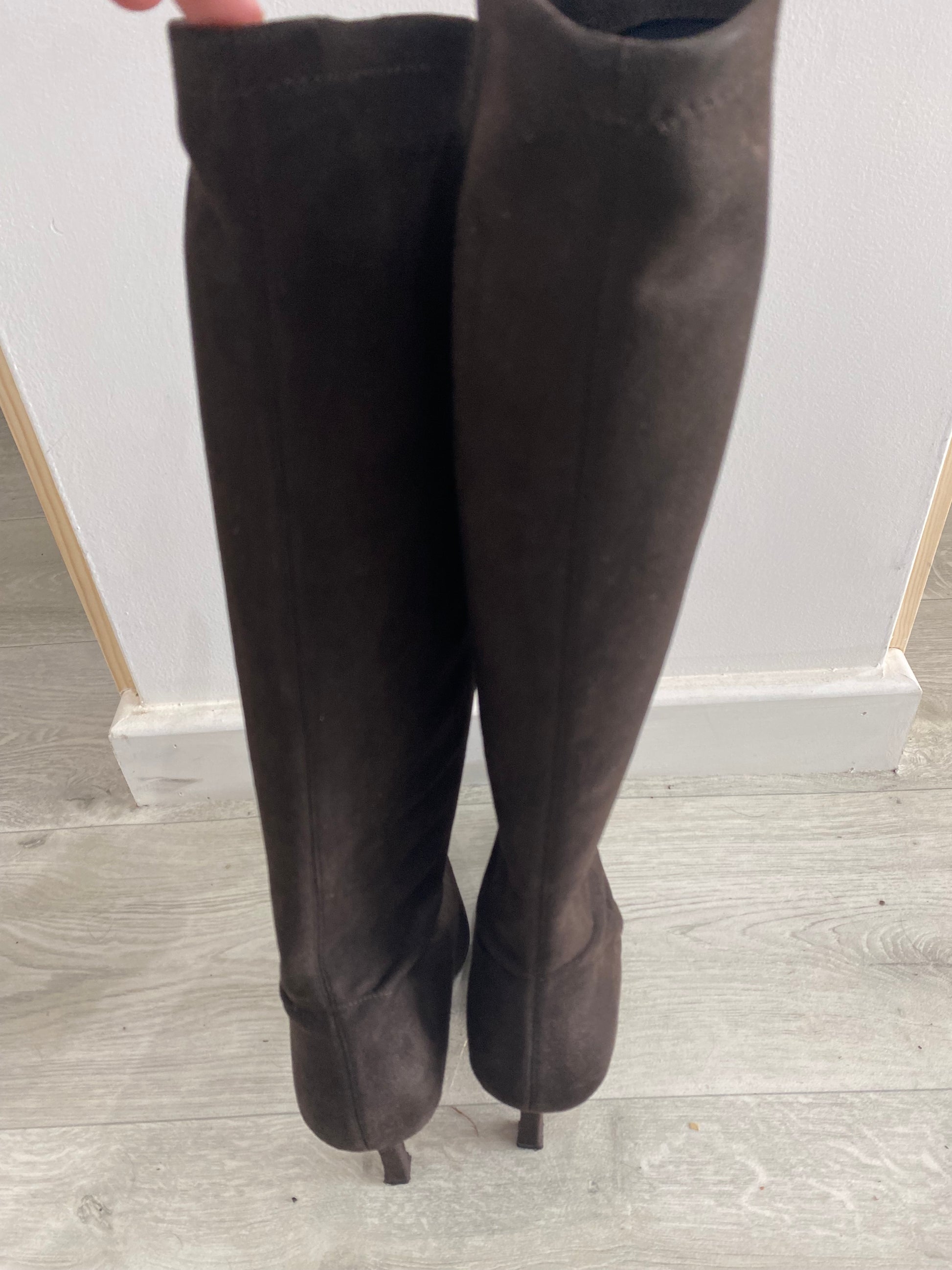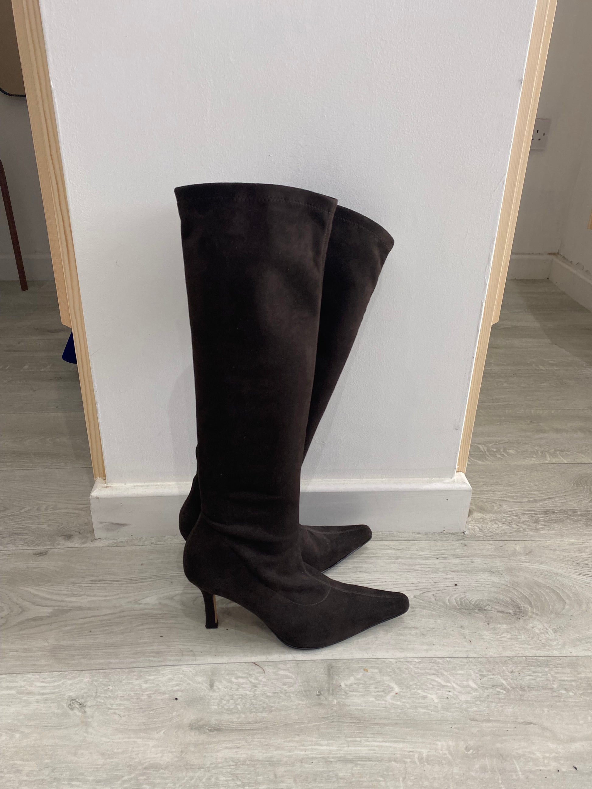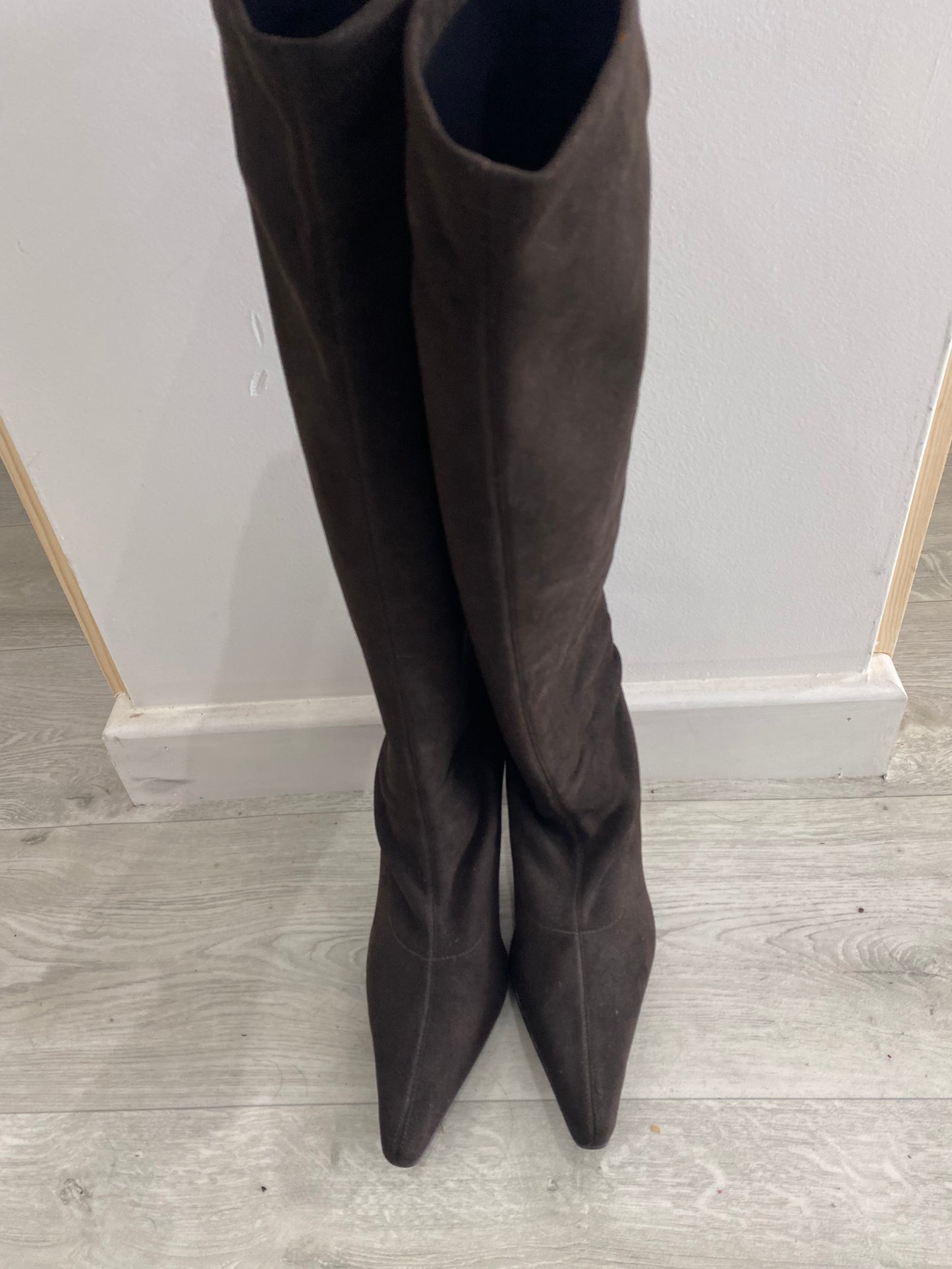 These knee length boots are made of a soft brown suede and are lightly used with some slight signs of ware.