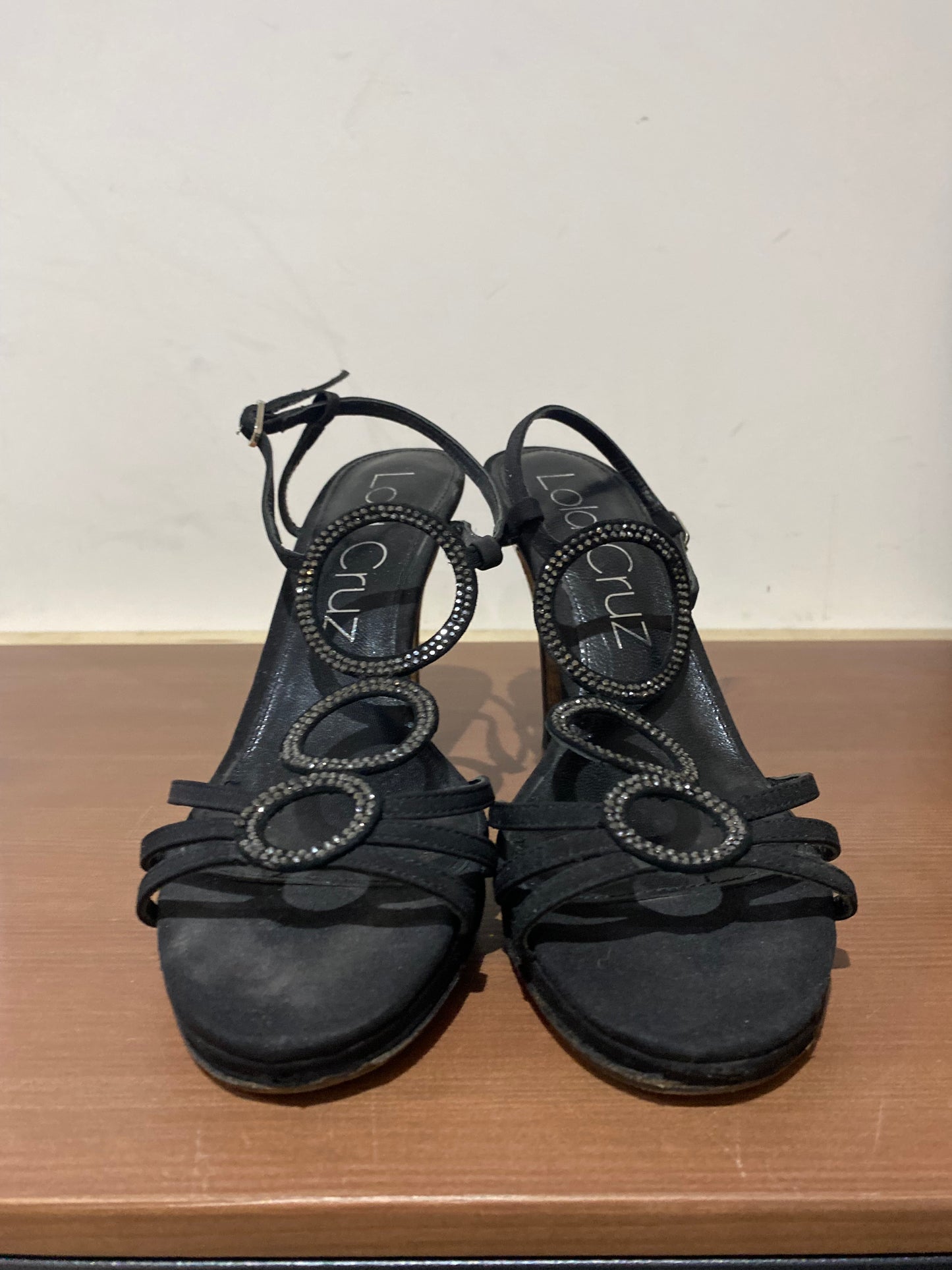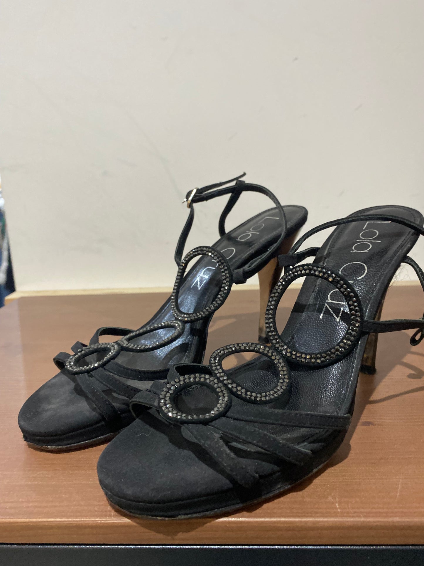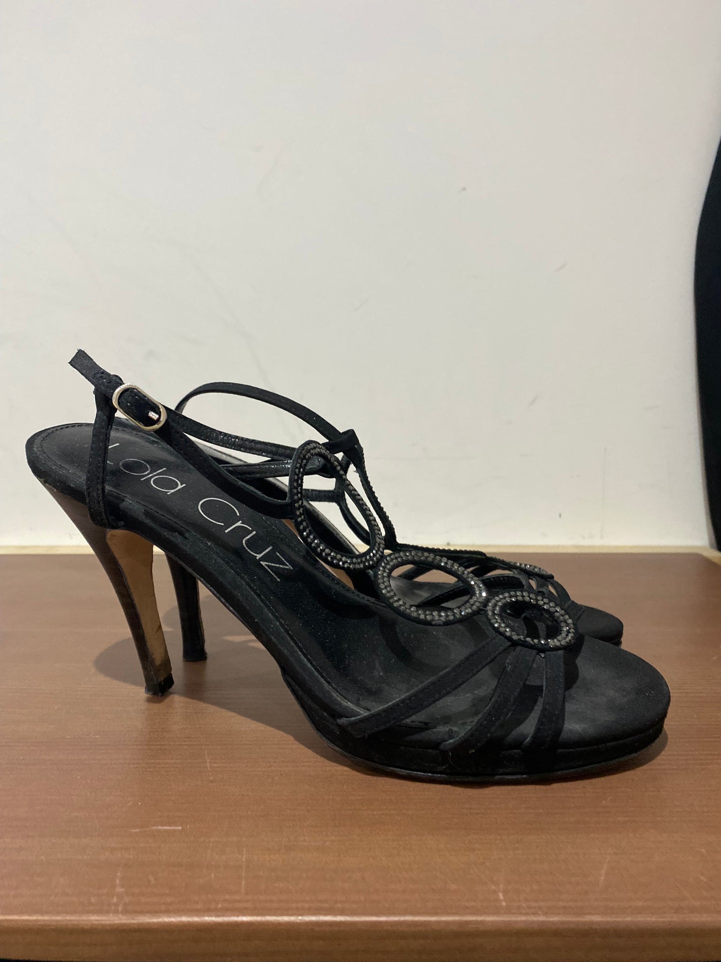 Lola Cruz Black Fabric Heeled Sandals with Diamante Circles Size 6