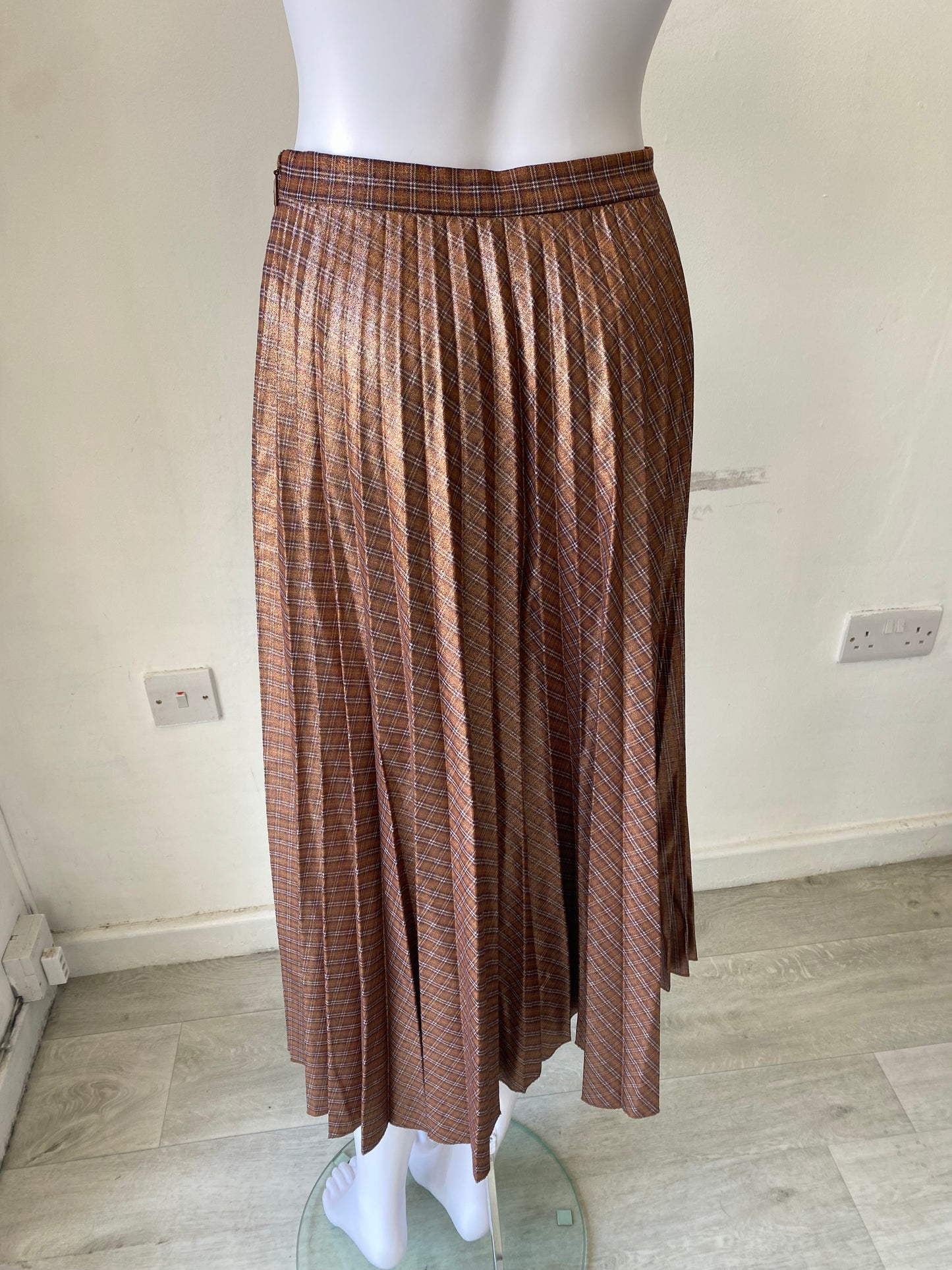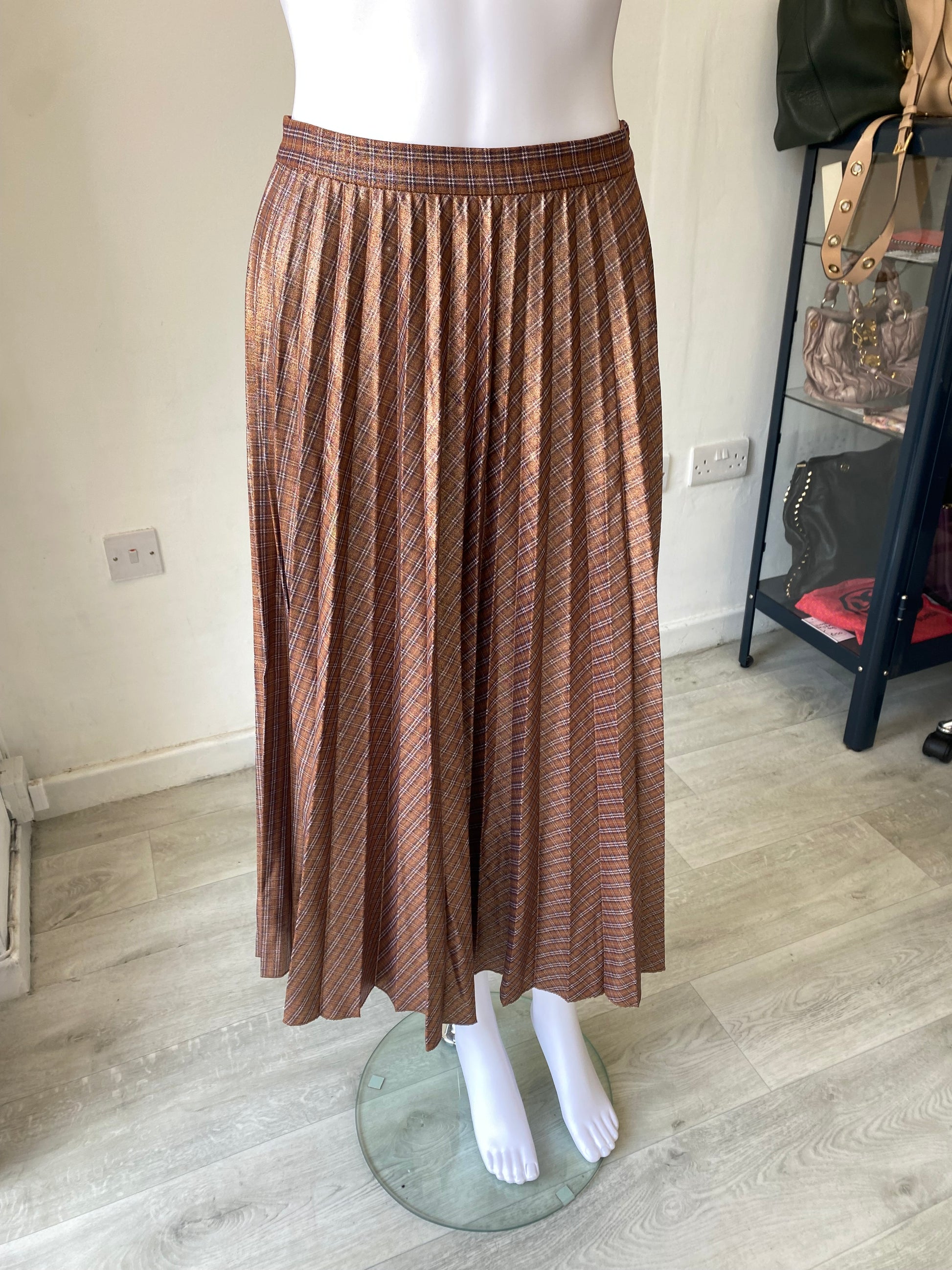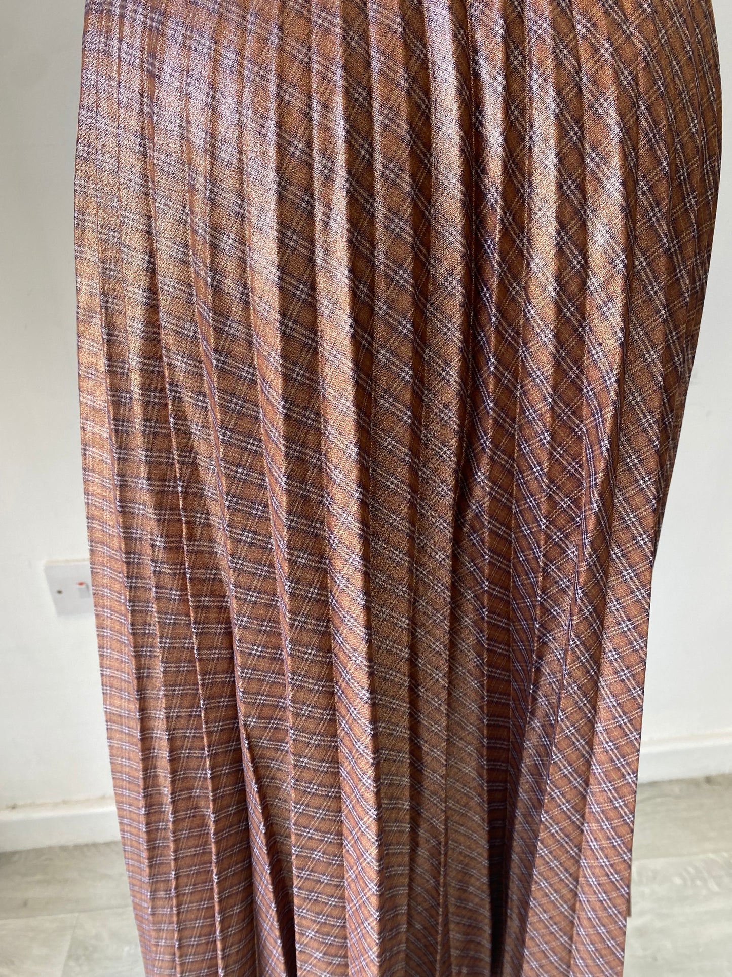 Beautiful skirt with a coated metallic finish, has a subtle tartan pattern. It also is pleated throughout.