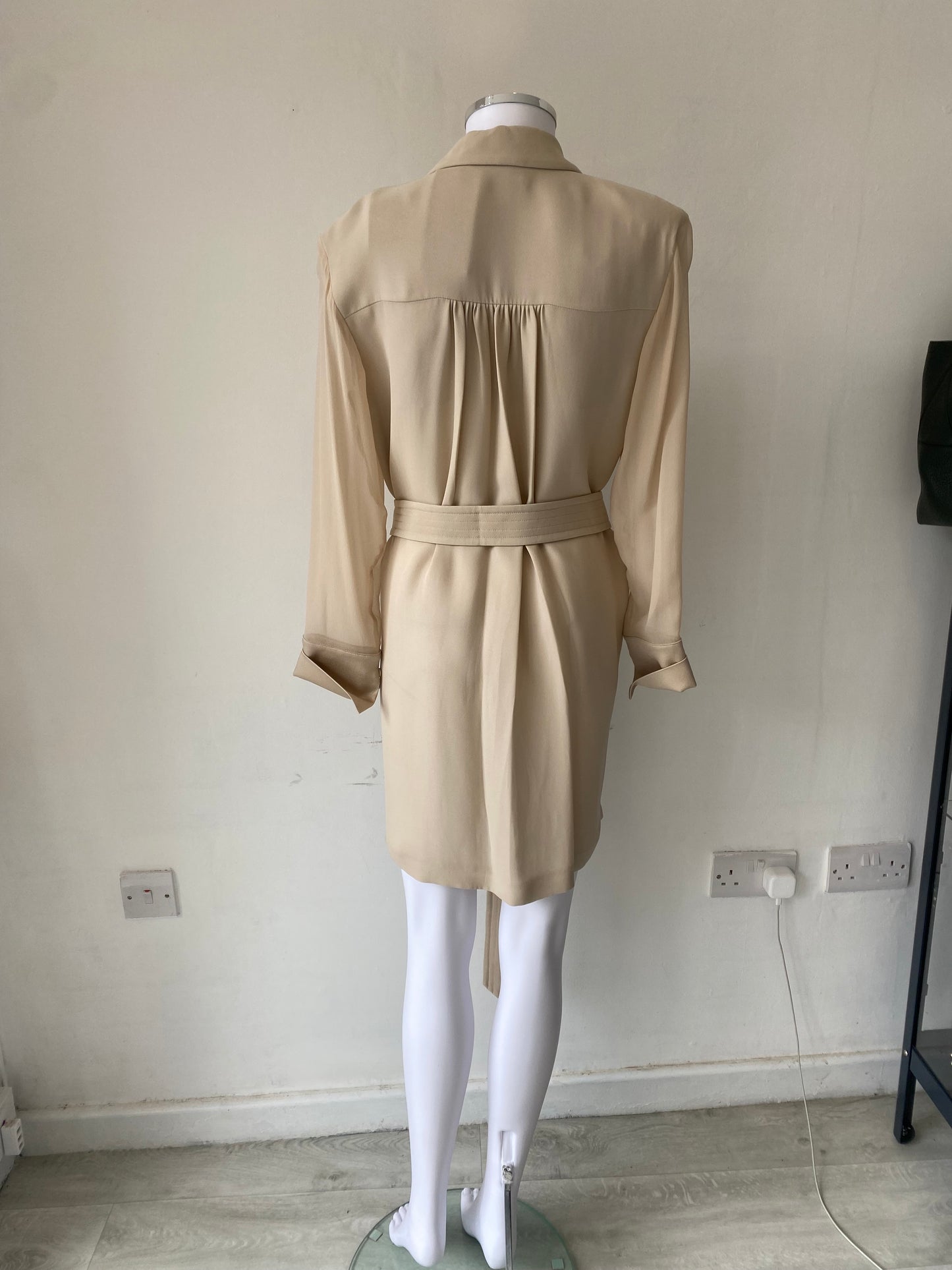 This jacket is beautiful, it would need a slip or another dress underneath as it only has one button to fasten. Comes with the belt. The sleeves are sheer.