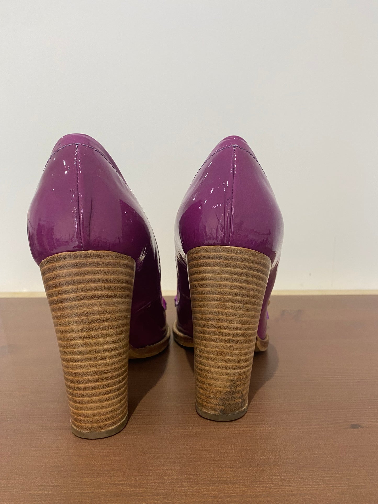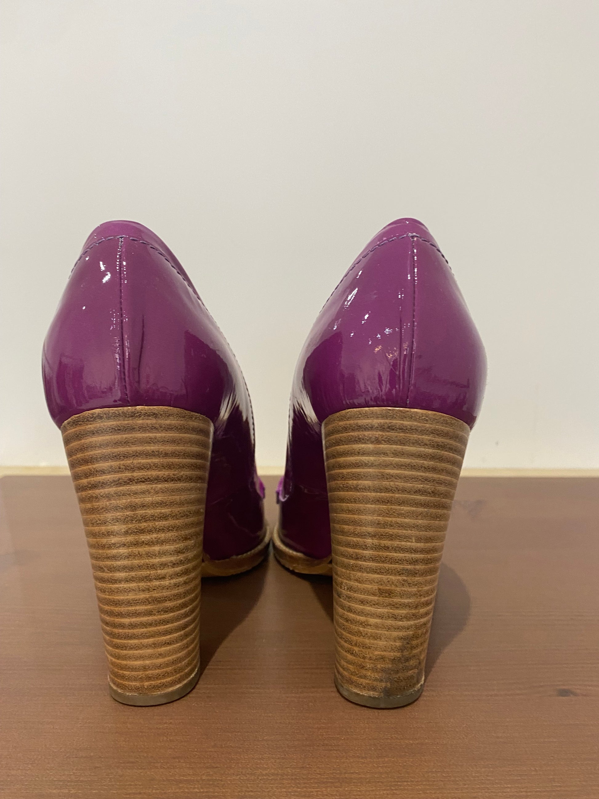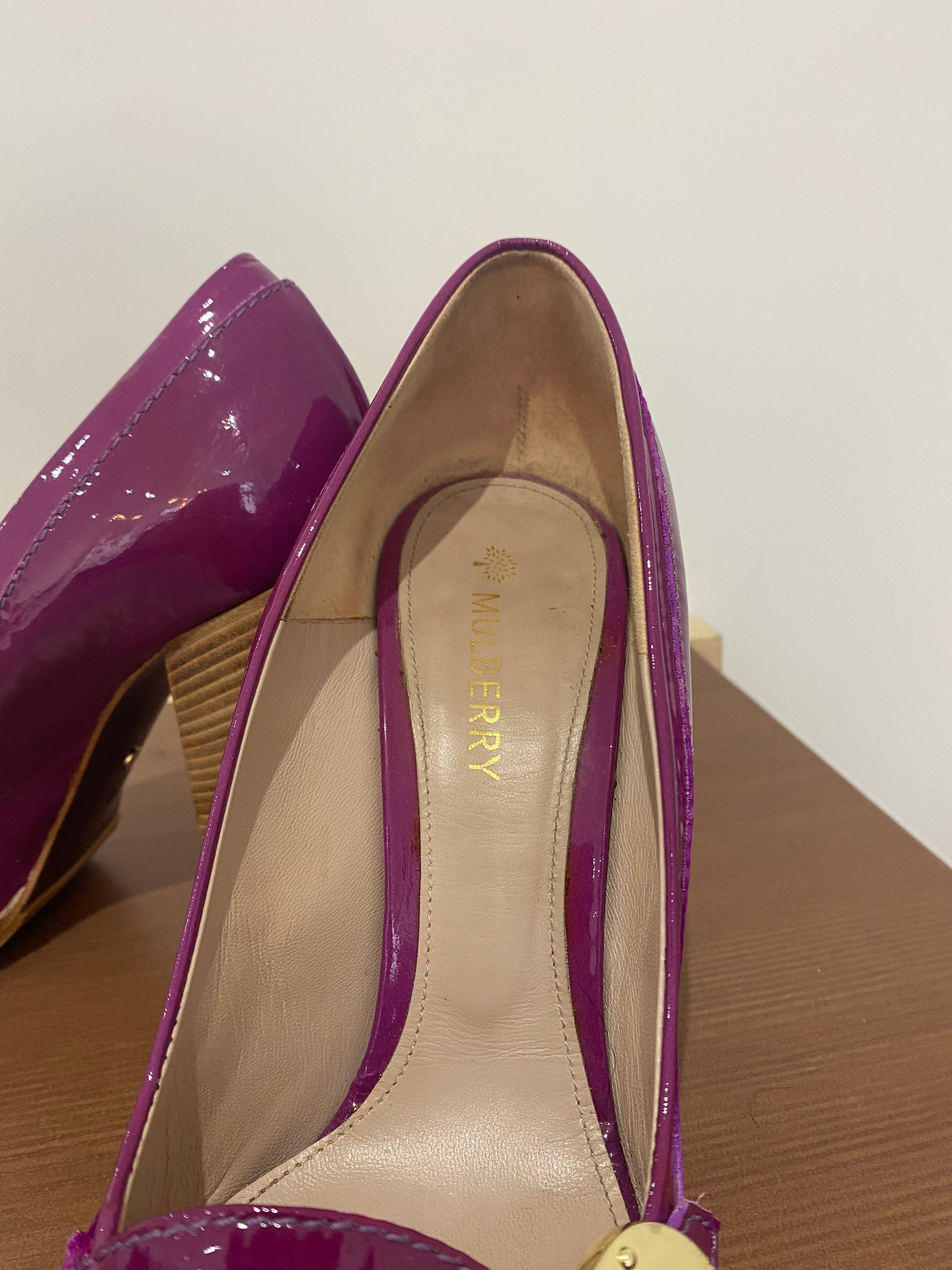 These gorgeous Mulberry Bayswater heeled pumps are a beautiful bright colour and are a soft patent leather. They are in great preloved condition. They would work dressed up or down.