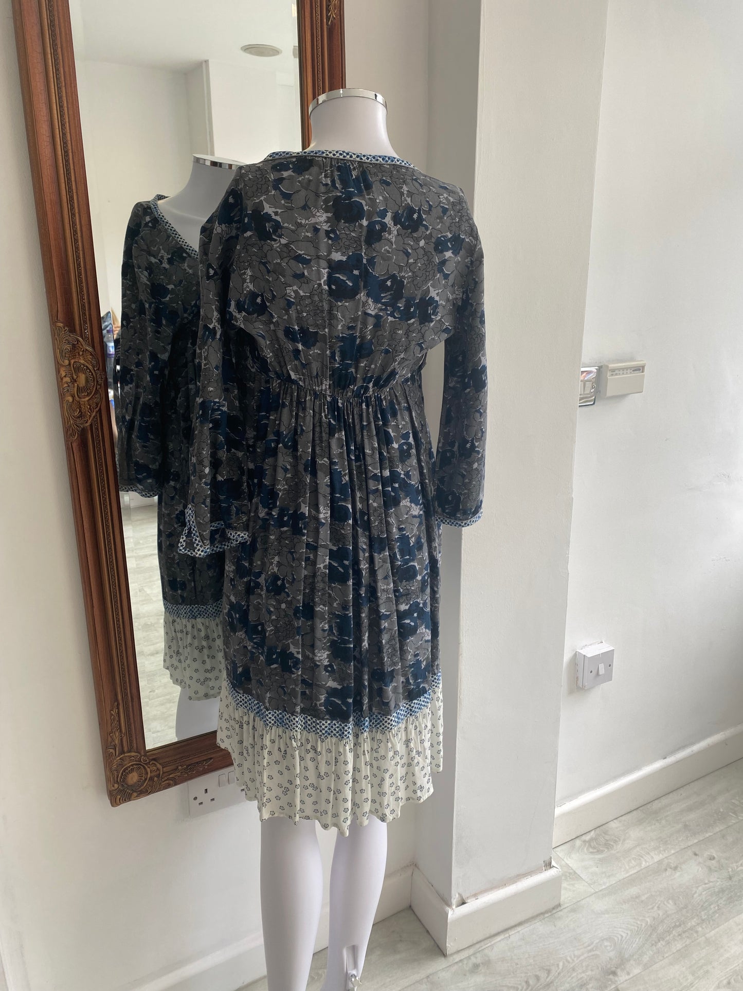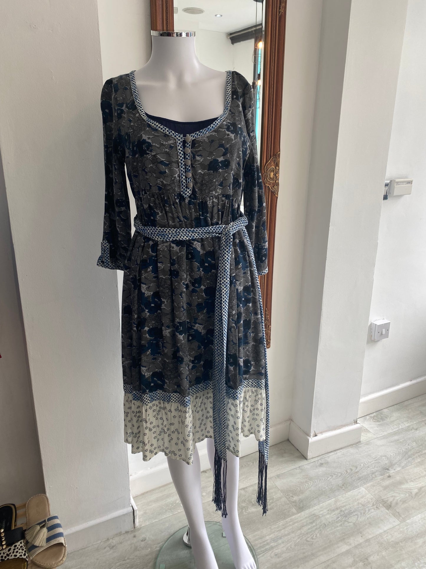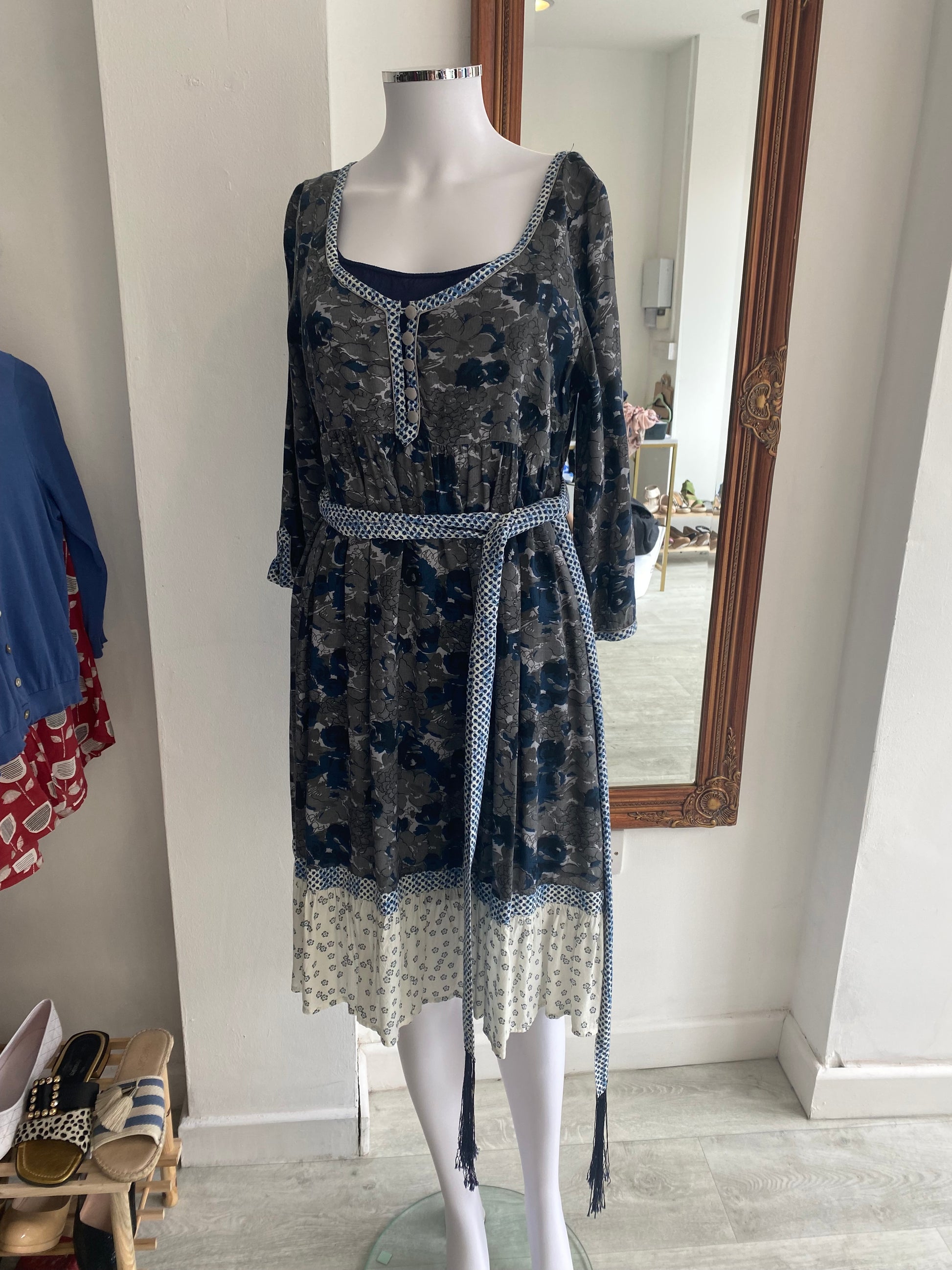 Lovely dress with a beautiful print, blue and grey colours. It comes with a tie belt or shawl, could be used as either, which has tassels on either end.