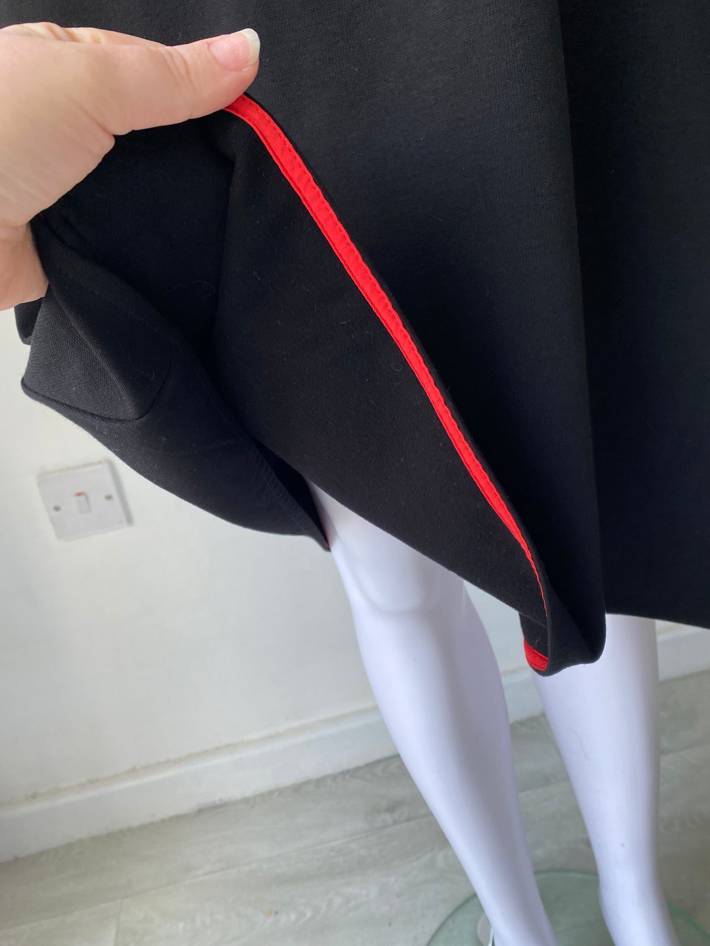 This dress is in good condition and is new with tags. It is black with a gorgeous red trim along the bottom.