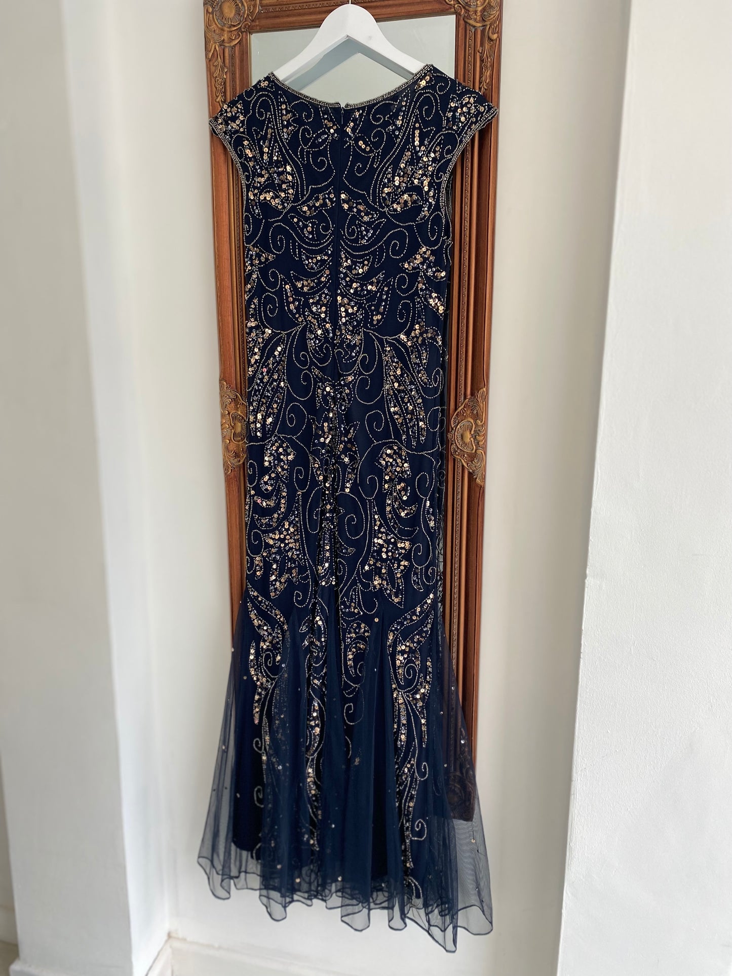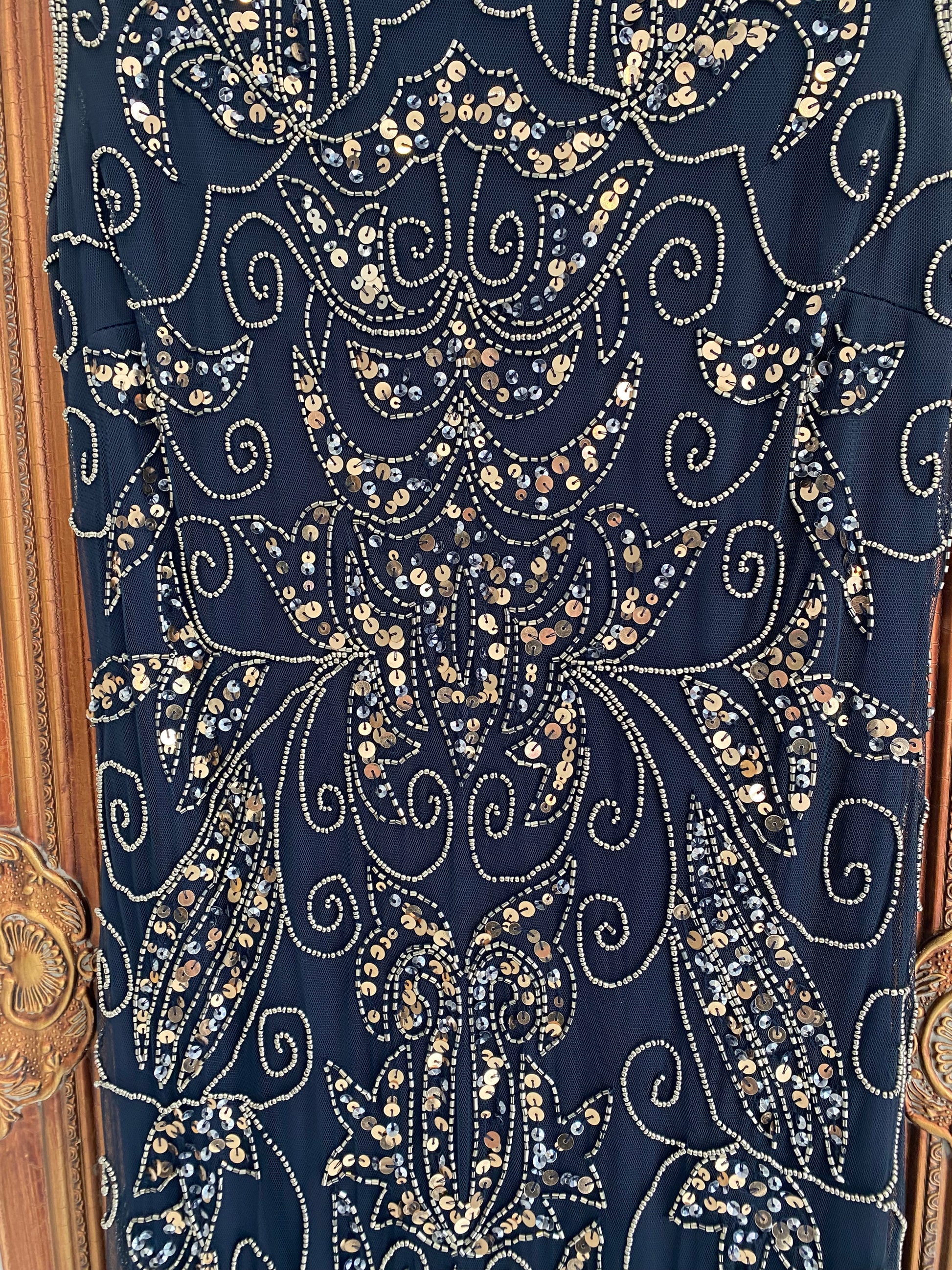 This beaded and sequinned dress is stunning. It has a mesh skirt. Stunning dress. It’s a size 12.