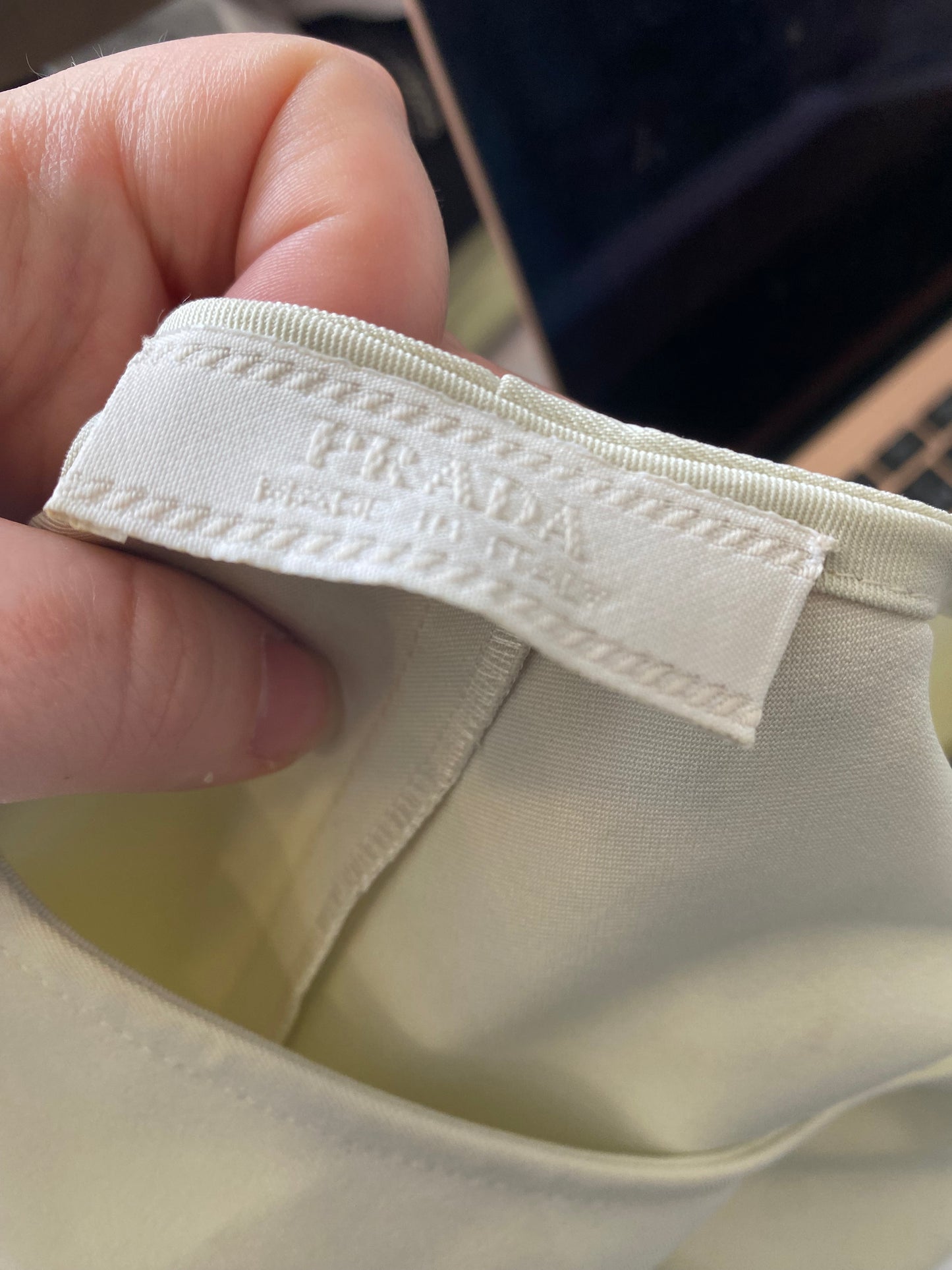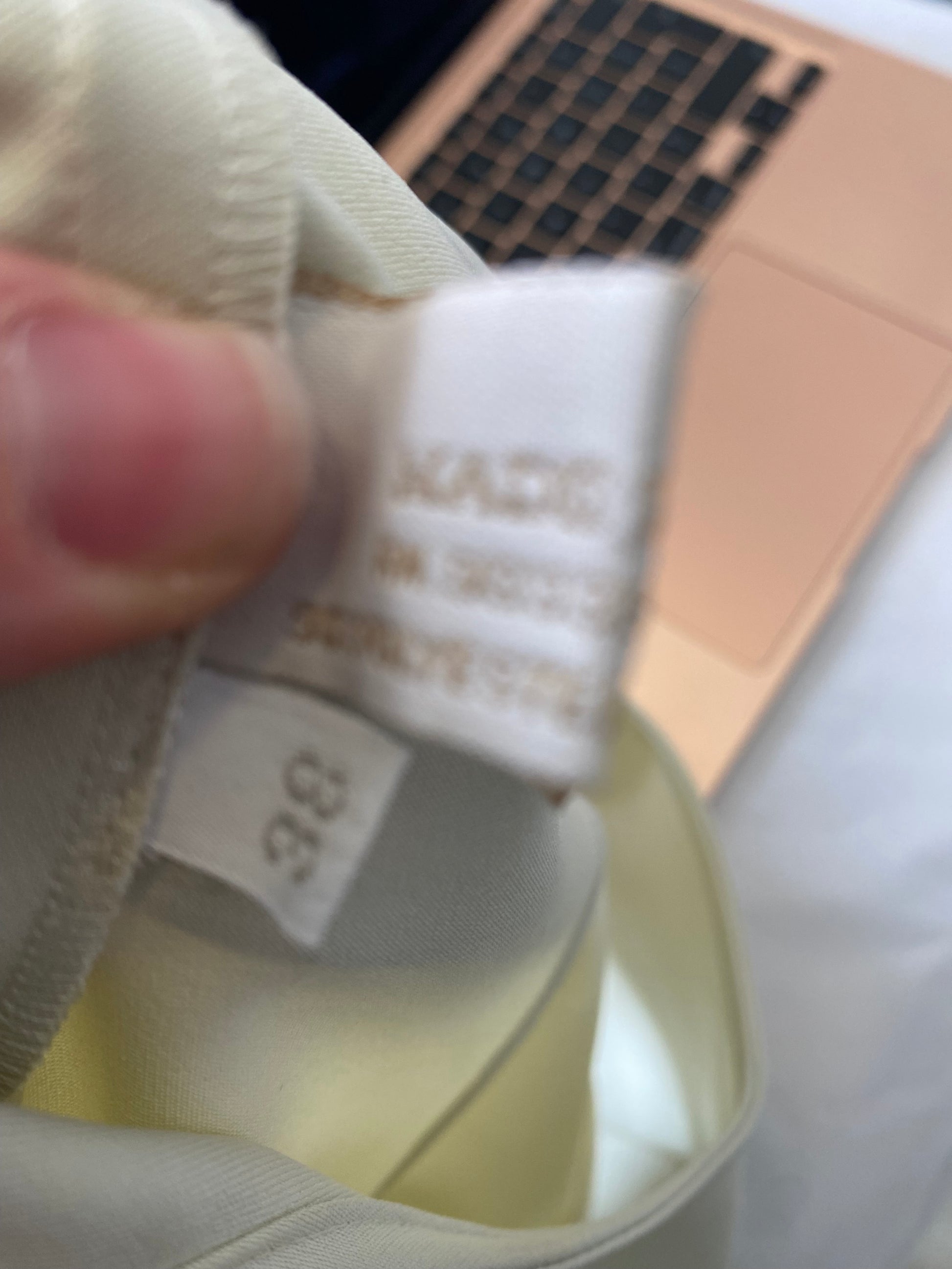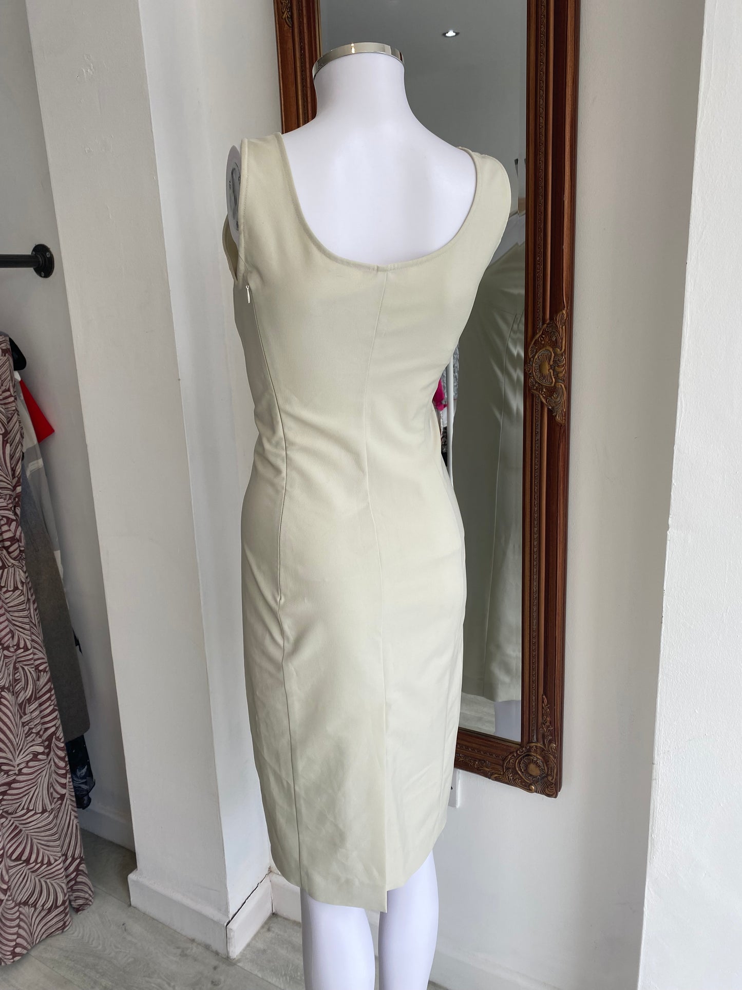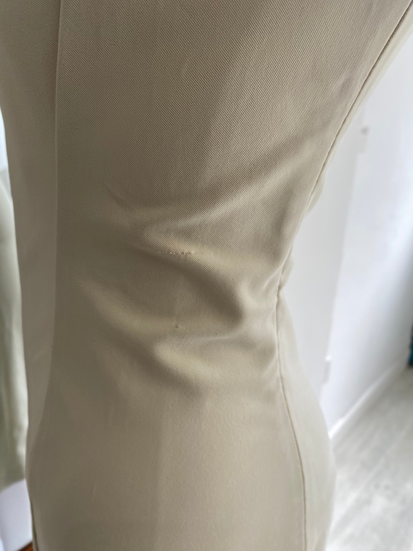 This dress is so simple and beautiful, it has a very structured design and has a small area inside of fake tan marks and a very small mark. Otherwise in great condition.