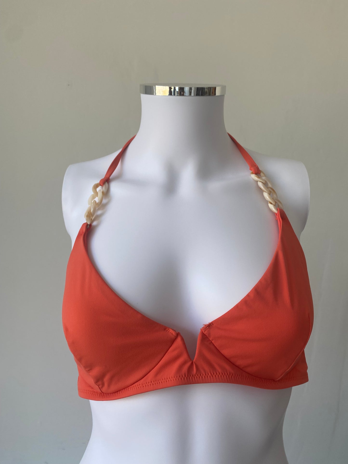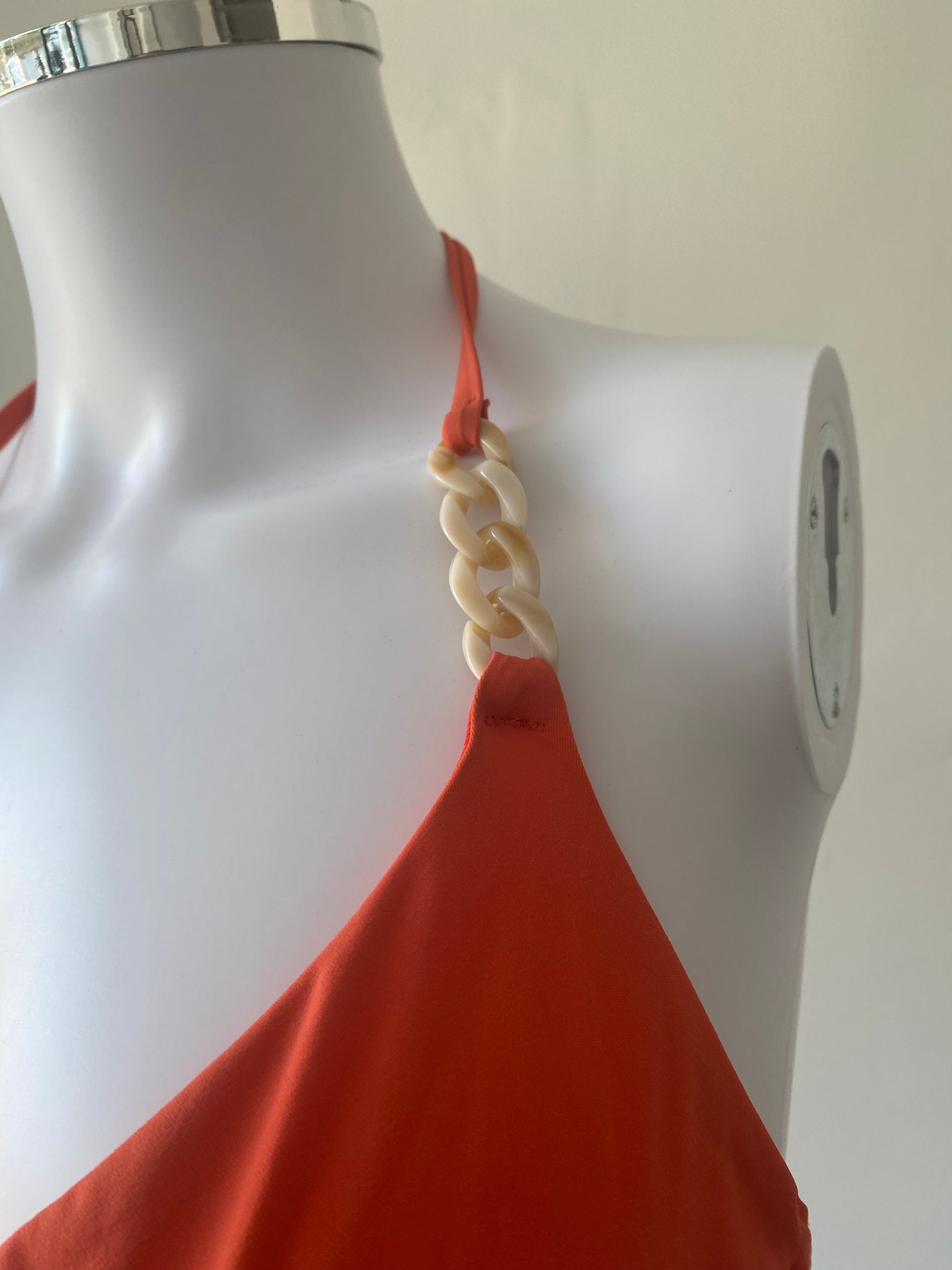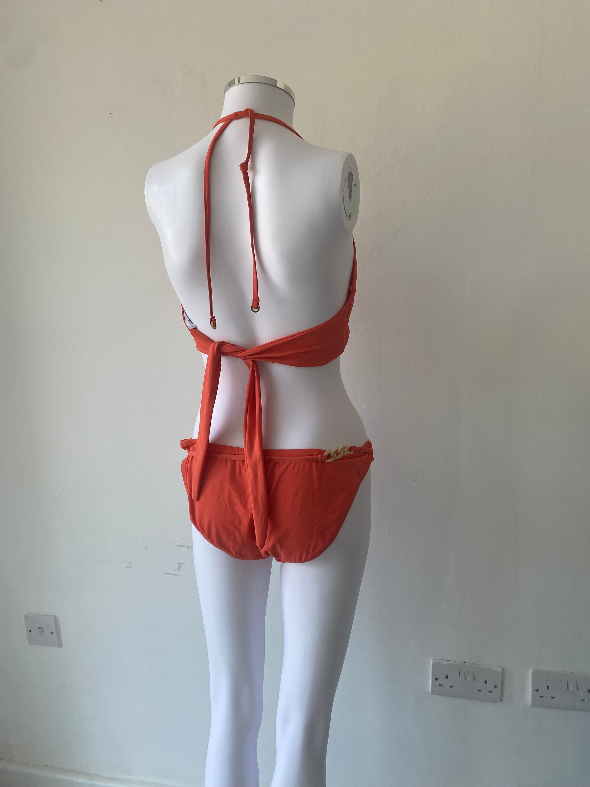 This bikini is such a lovely bright colour, has been lightly worn and has plastic chain detailing on the straps and around the waistband of the bottoms. It ties into a knot to fasten at the back of the top. It is a size 12.