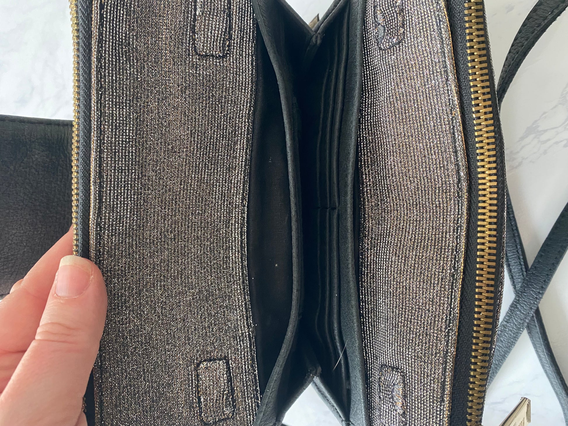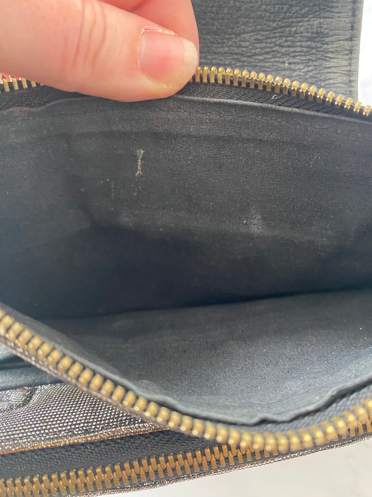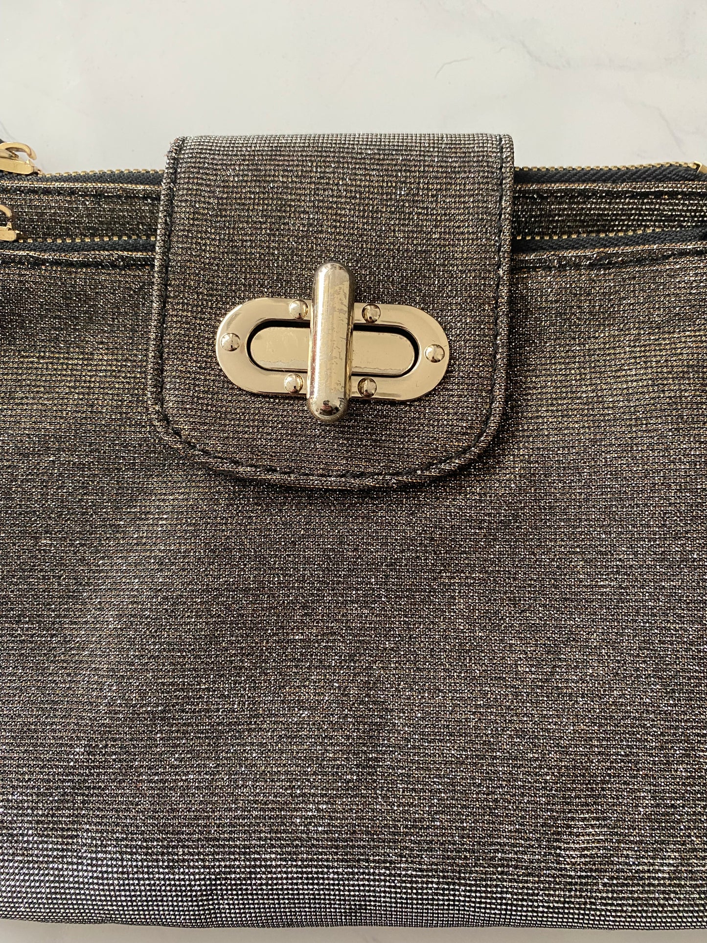 Lovely handbag, with a gold shimmer fabric. It has a turnlock to fasten which is in great condition and easy to operate. Inside is very roomy with 2 large zipped compartments and a section in the middle with card slots. In good, lightly worn condtion. The strap is a crossbody strap. It includes the dust bag. We have the matching loafers available.