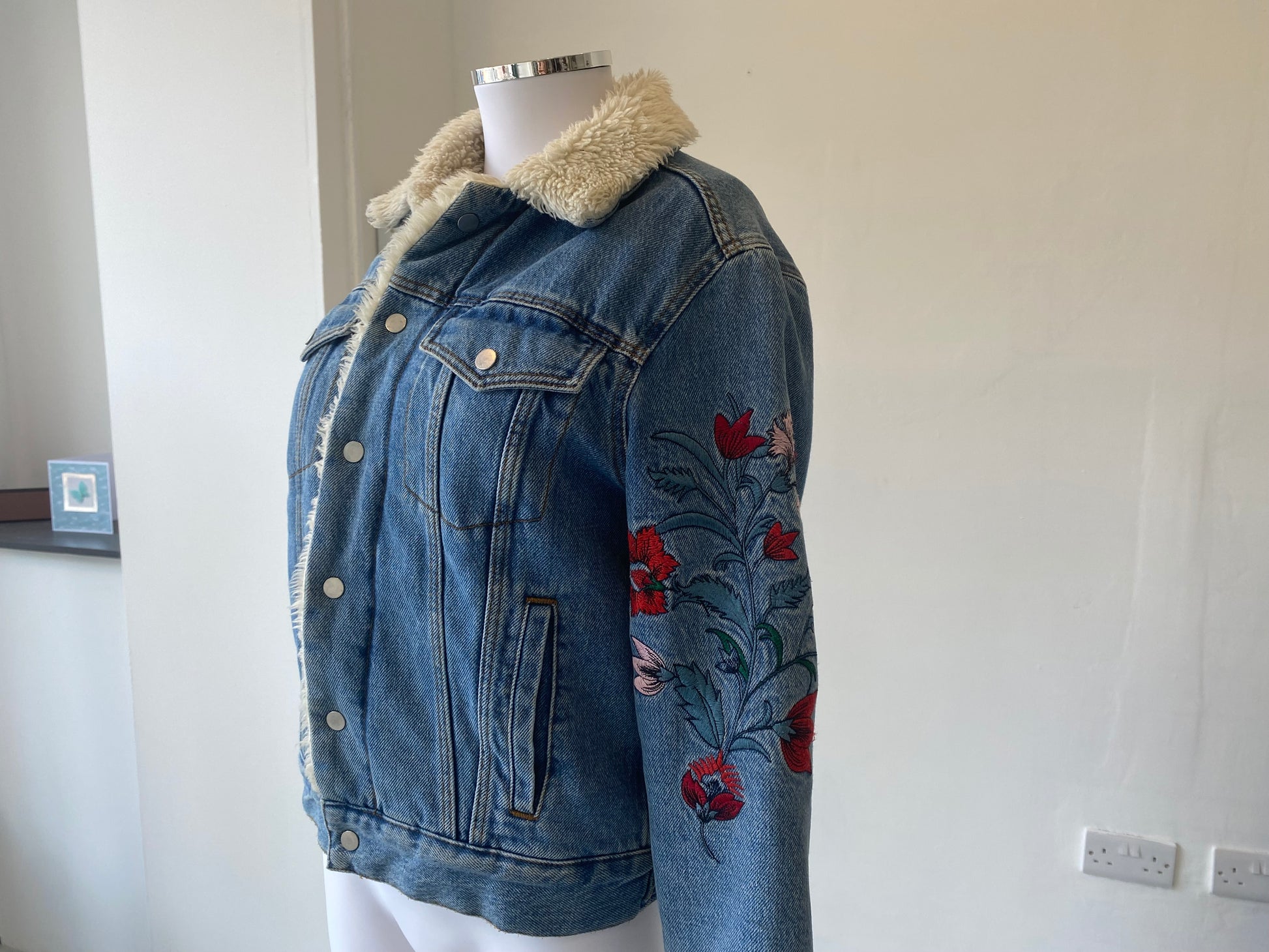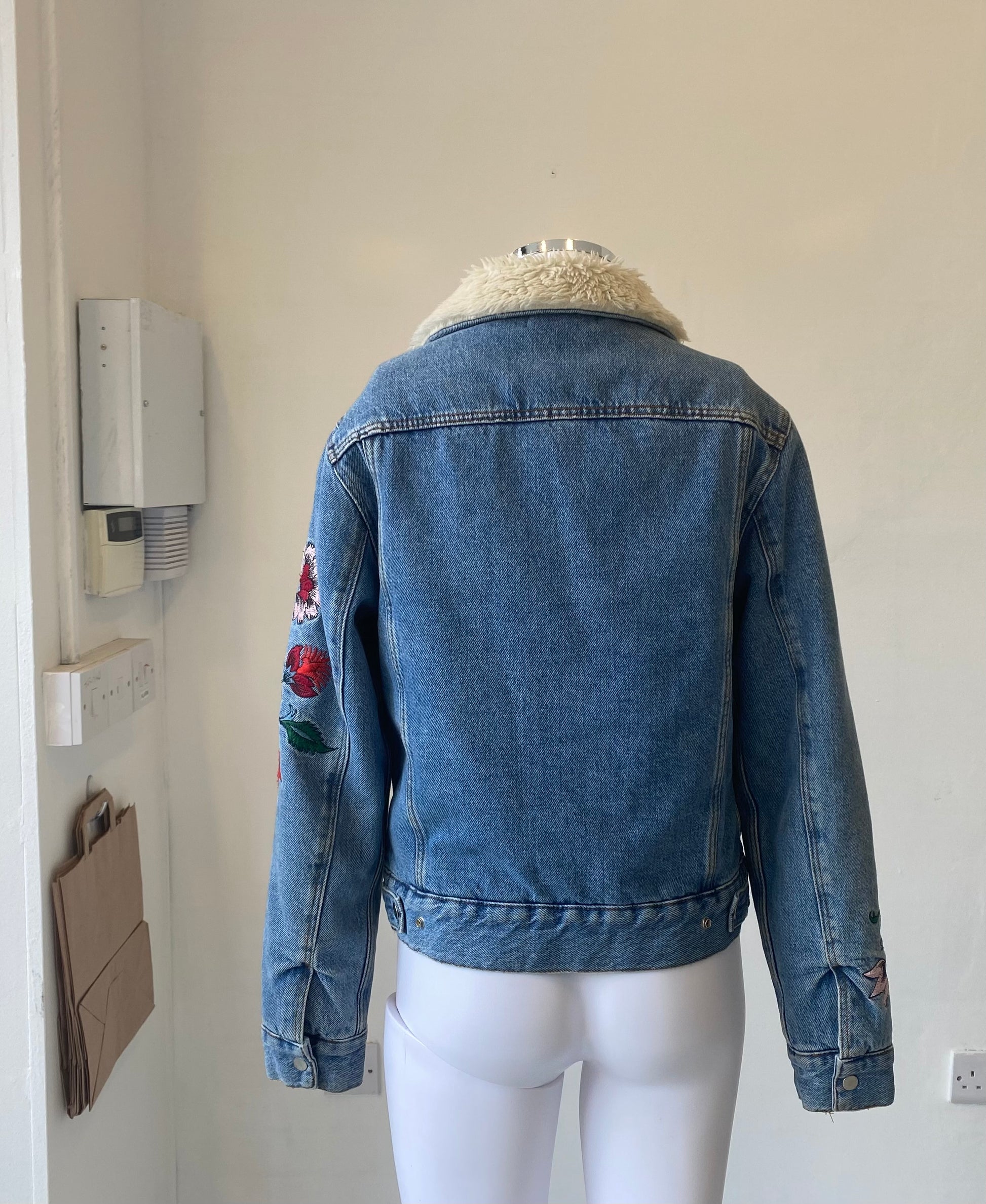Sandro Denim Jacket with Faux Fur Lining and Embroidered Detailing Size 8