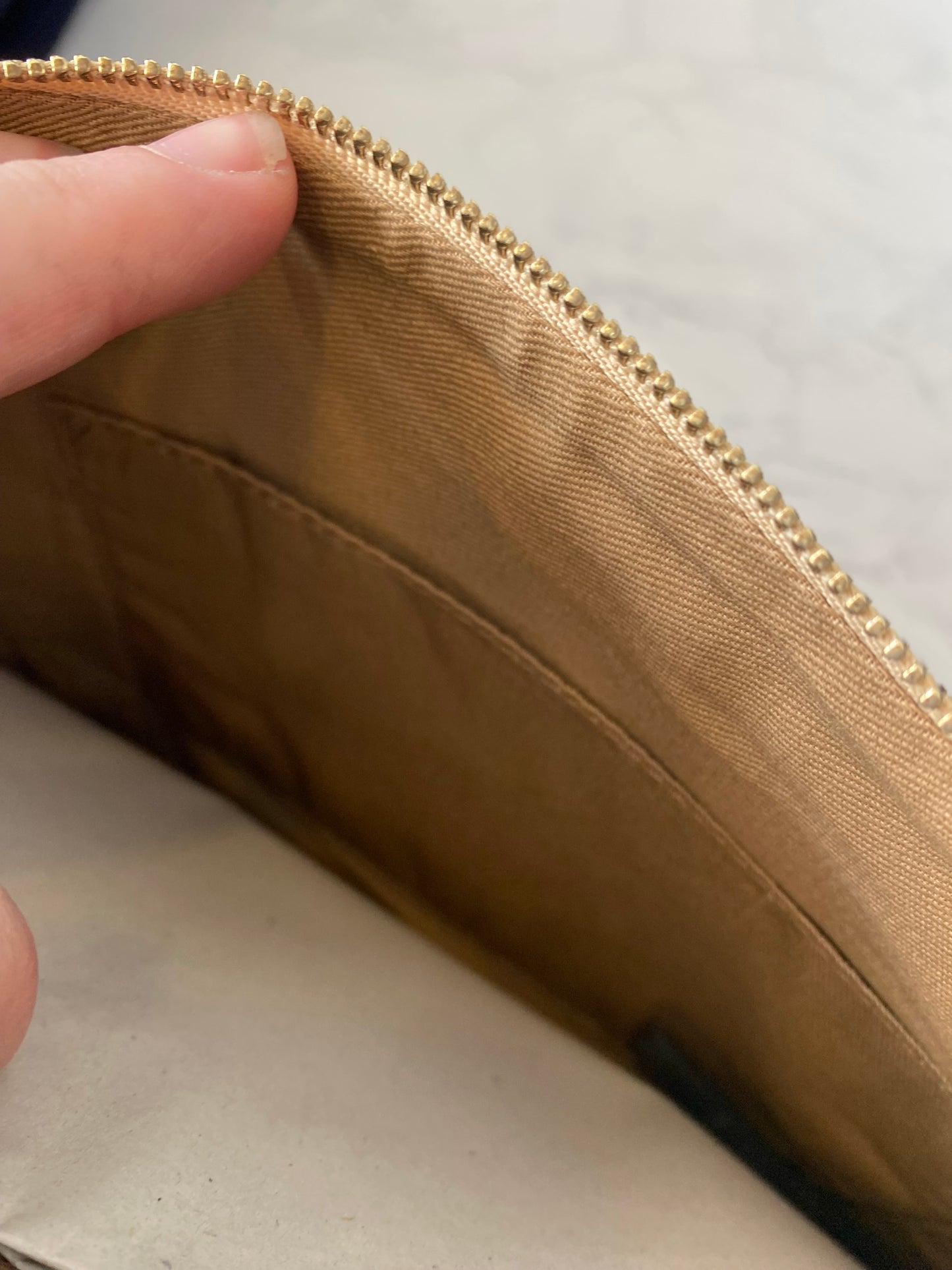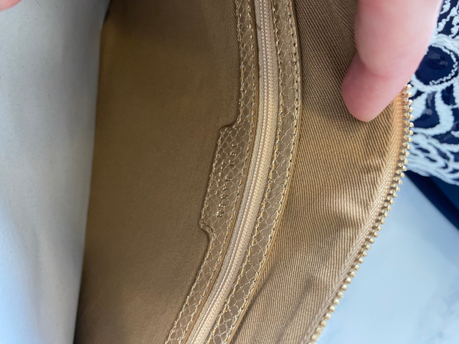 This bag is new with tags, and never worn. It is a textured leather which feels very soft.