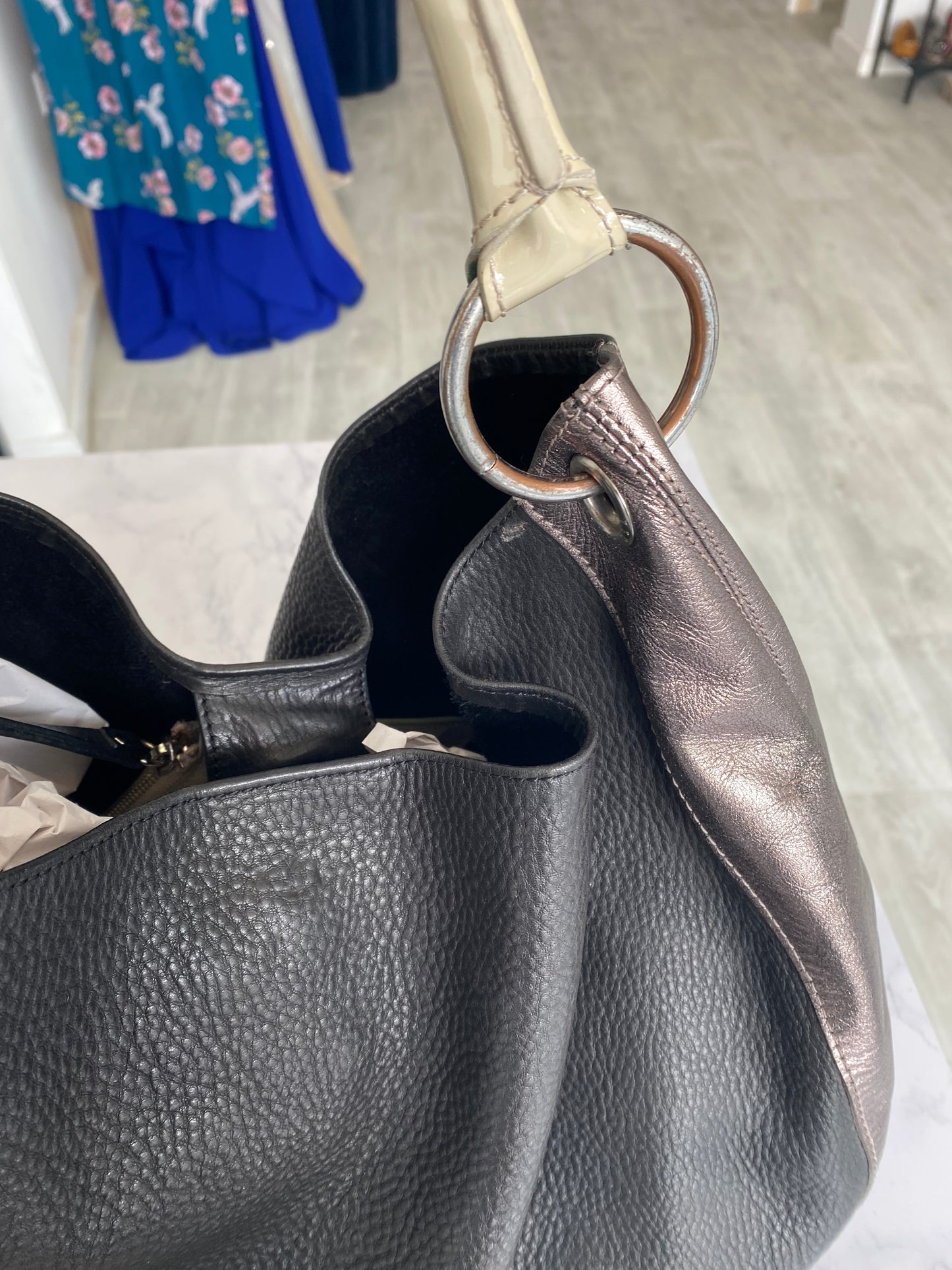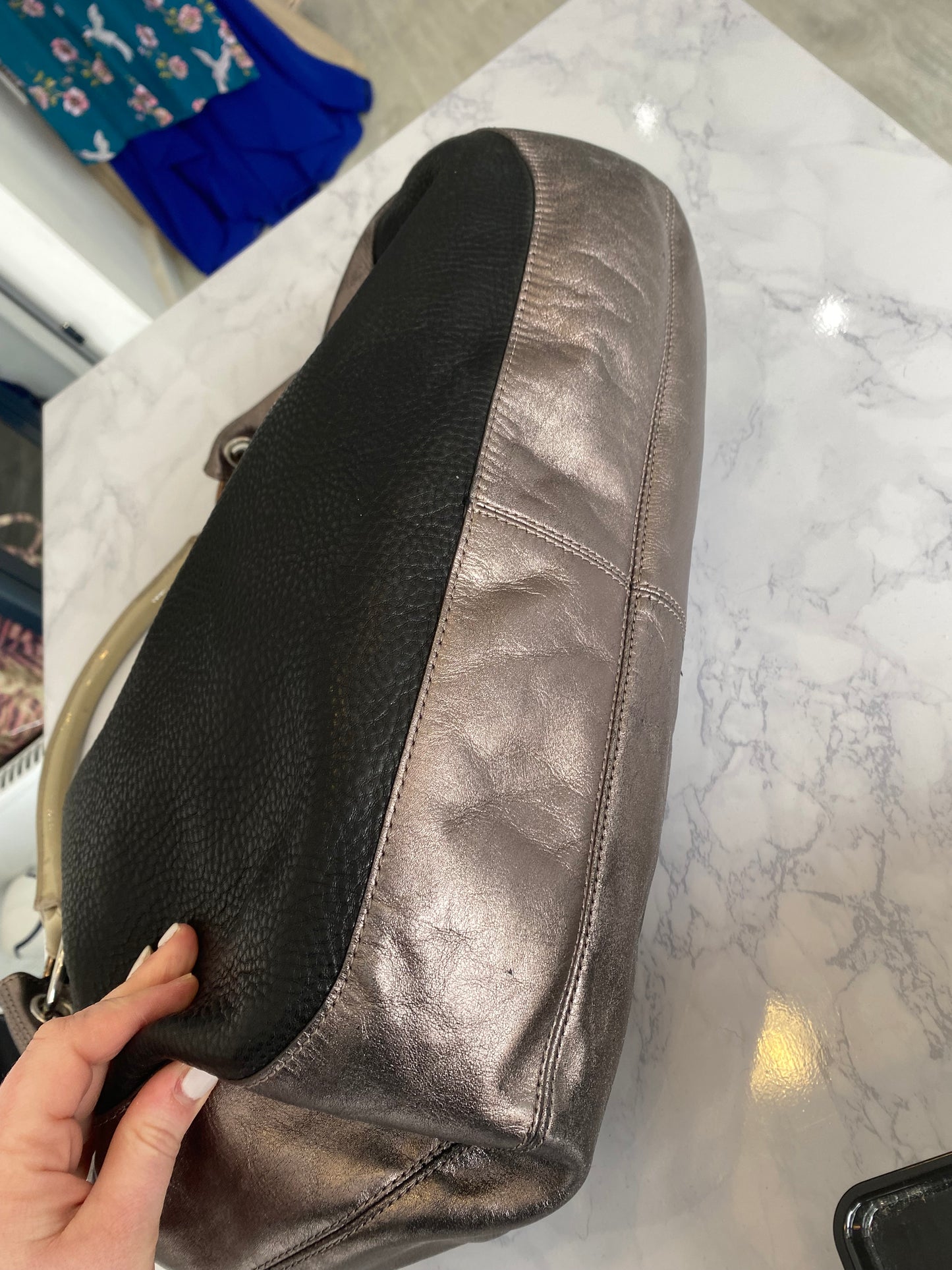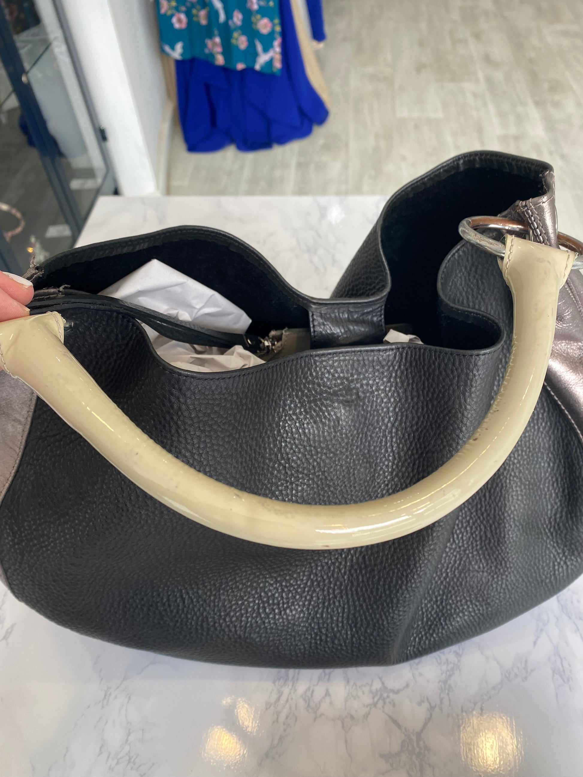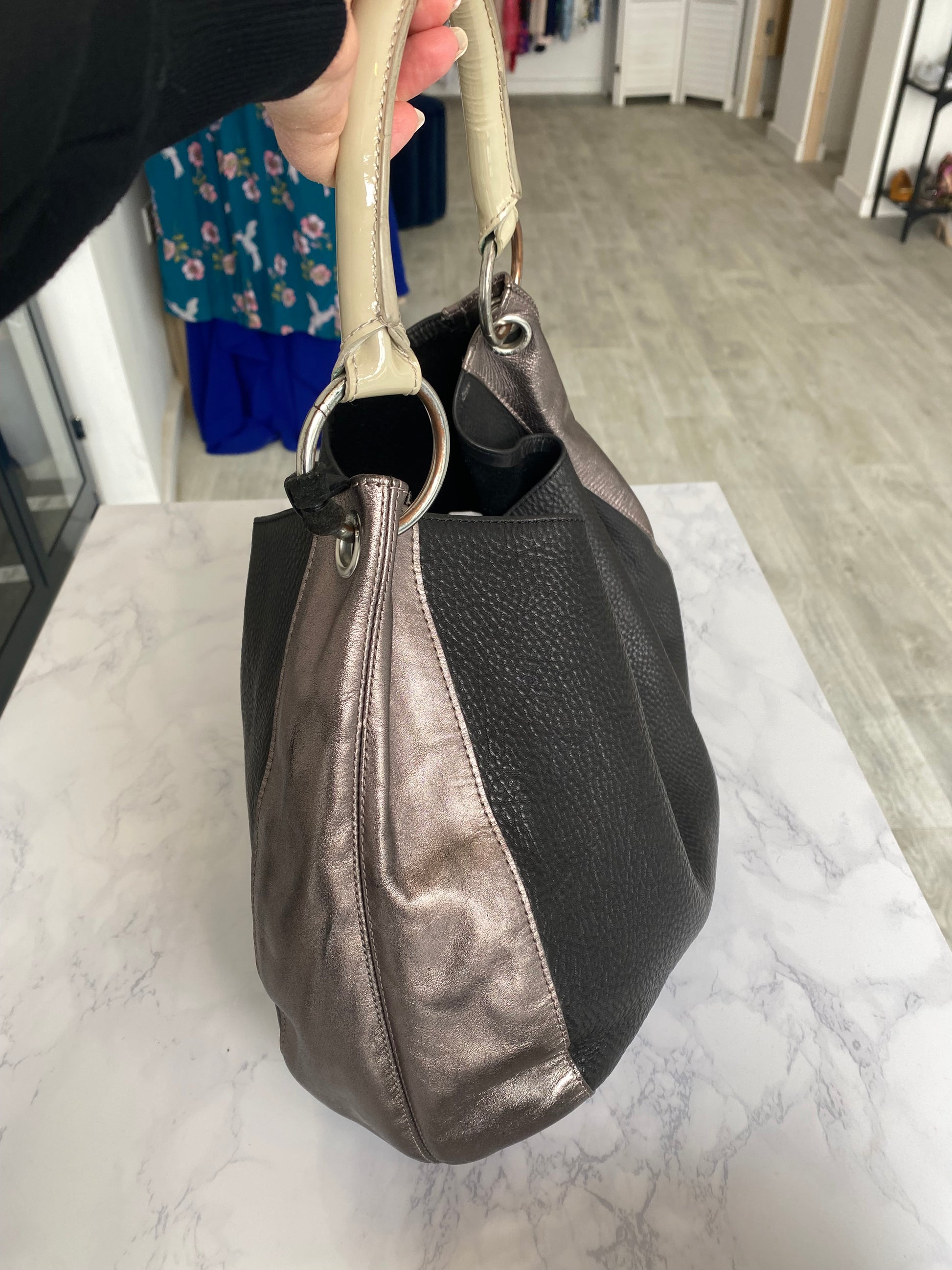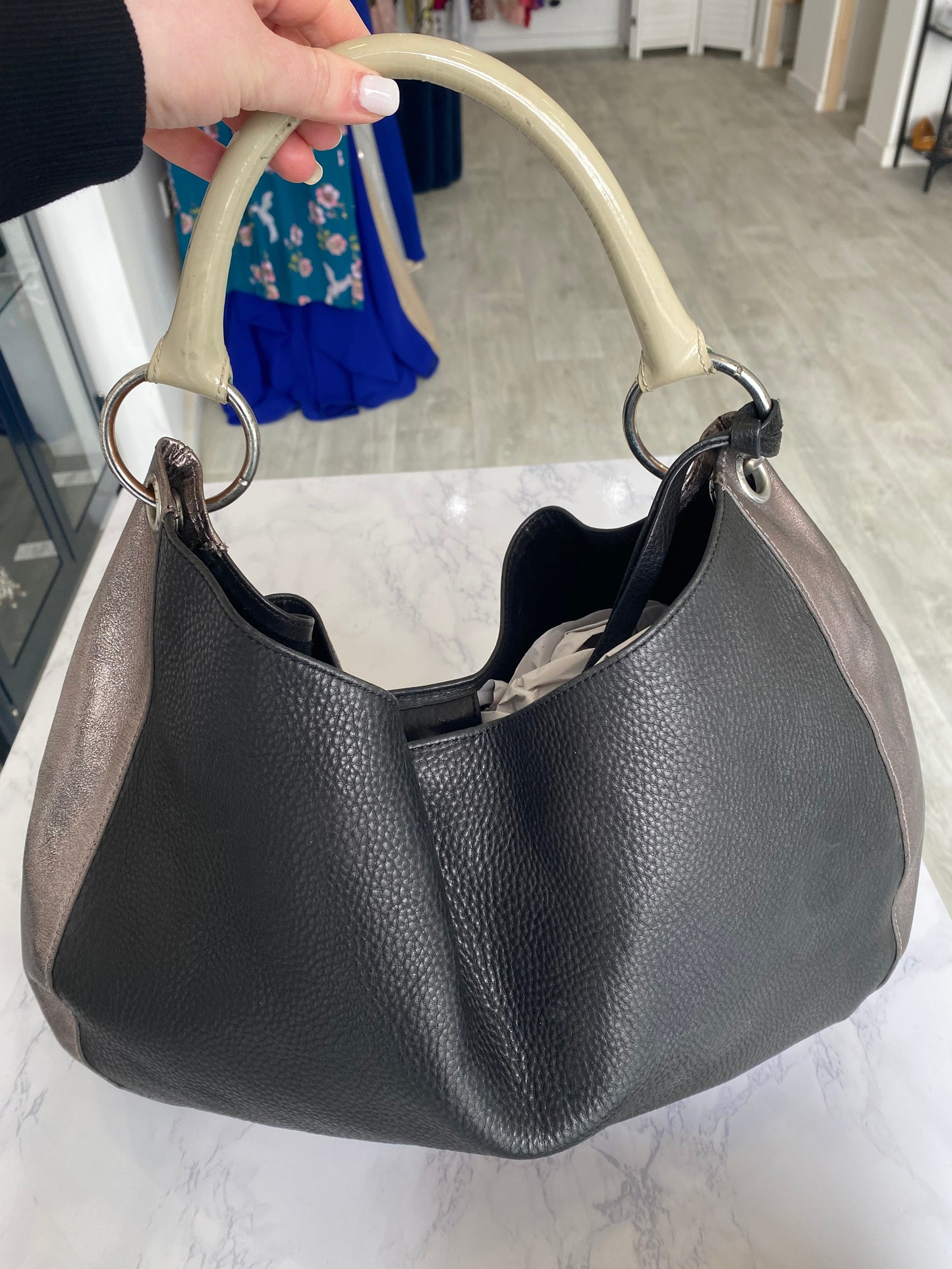 This gorgeous handbag is a hobo style - black with pewter metallic panels. The handle is patent and has a few marks. The inside is suede lining with no internal pockets but it does have a pouch attached which is patent. The pouch does have some marks.
