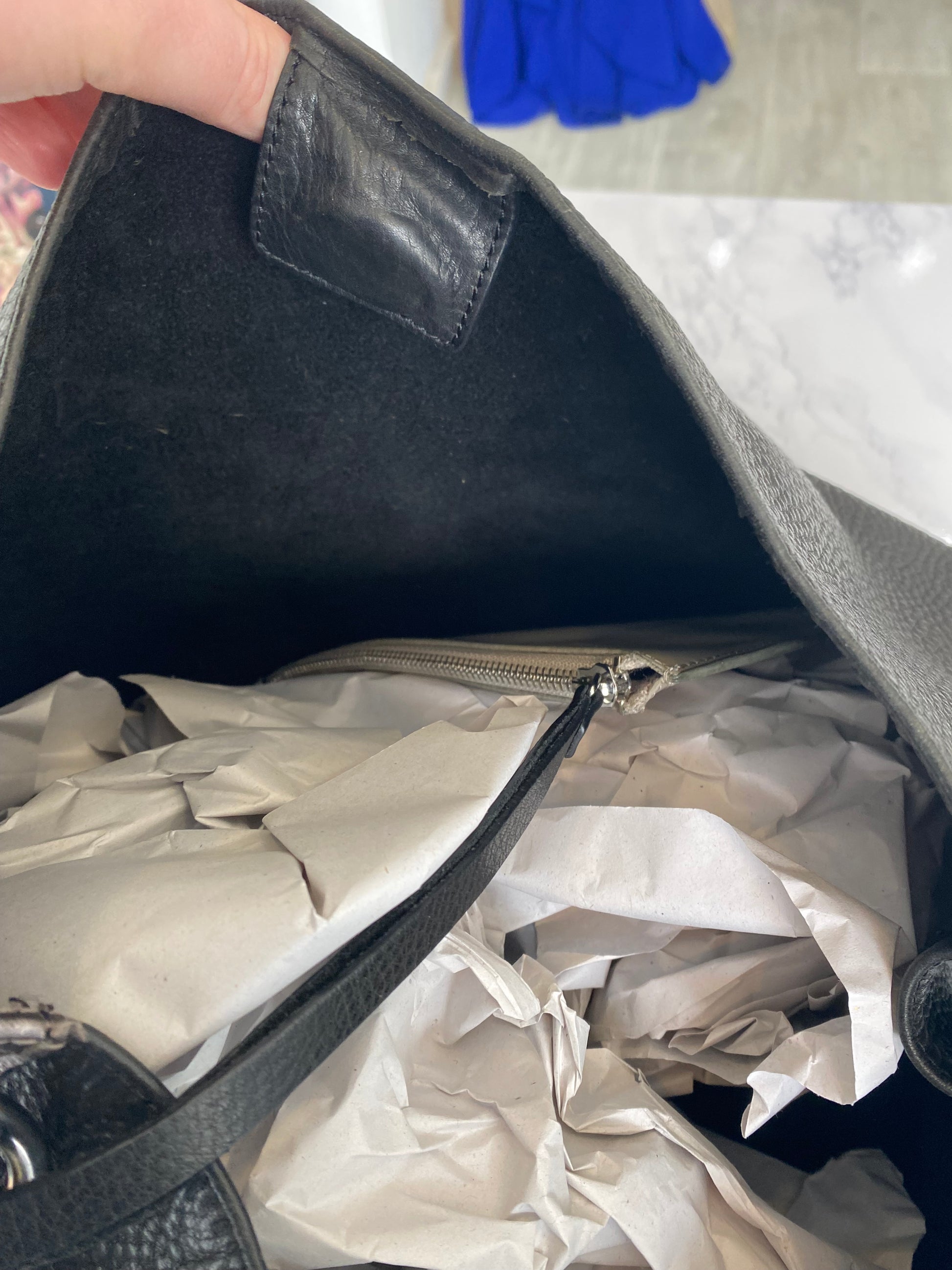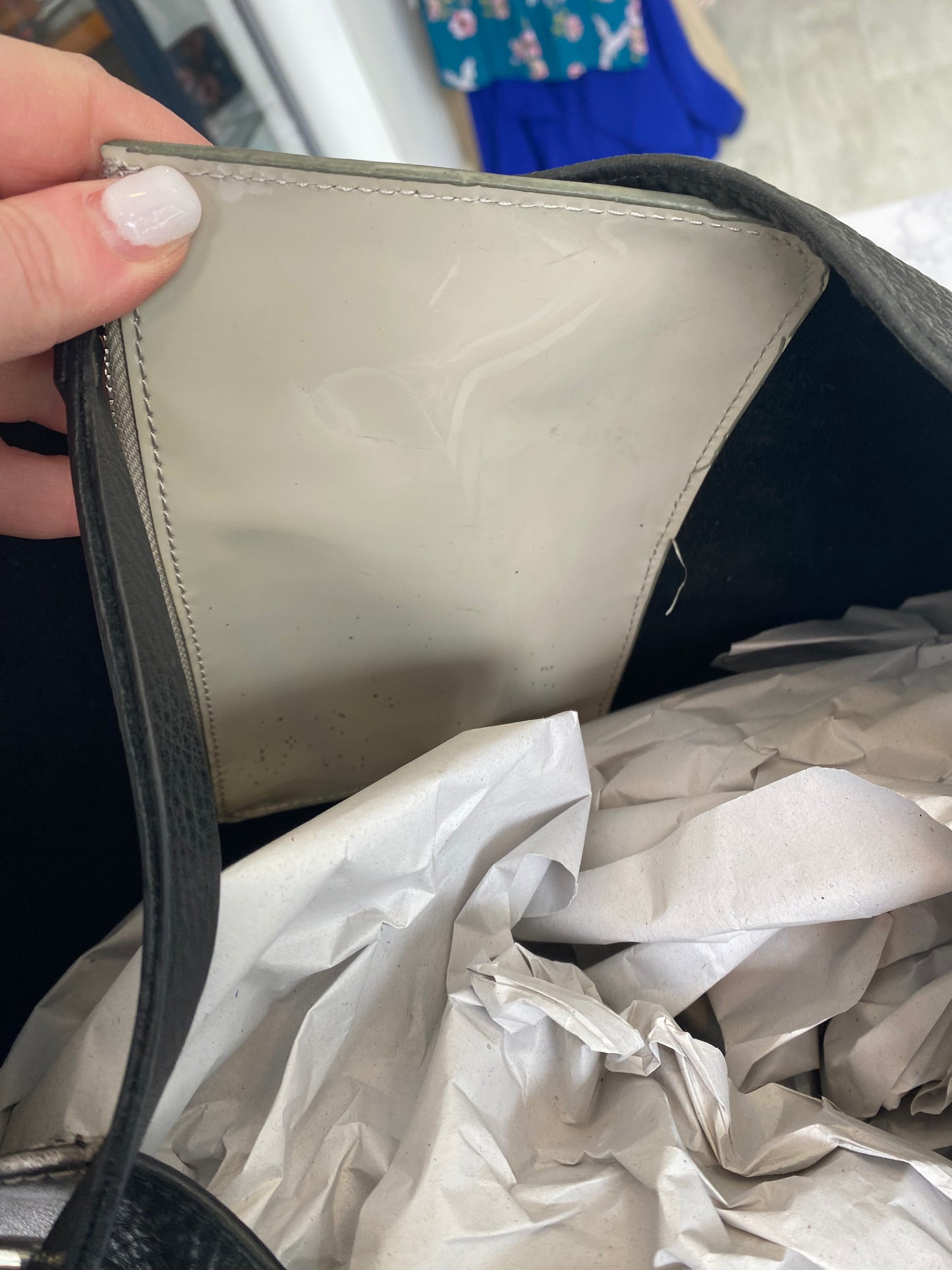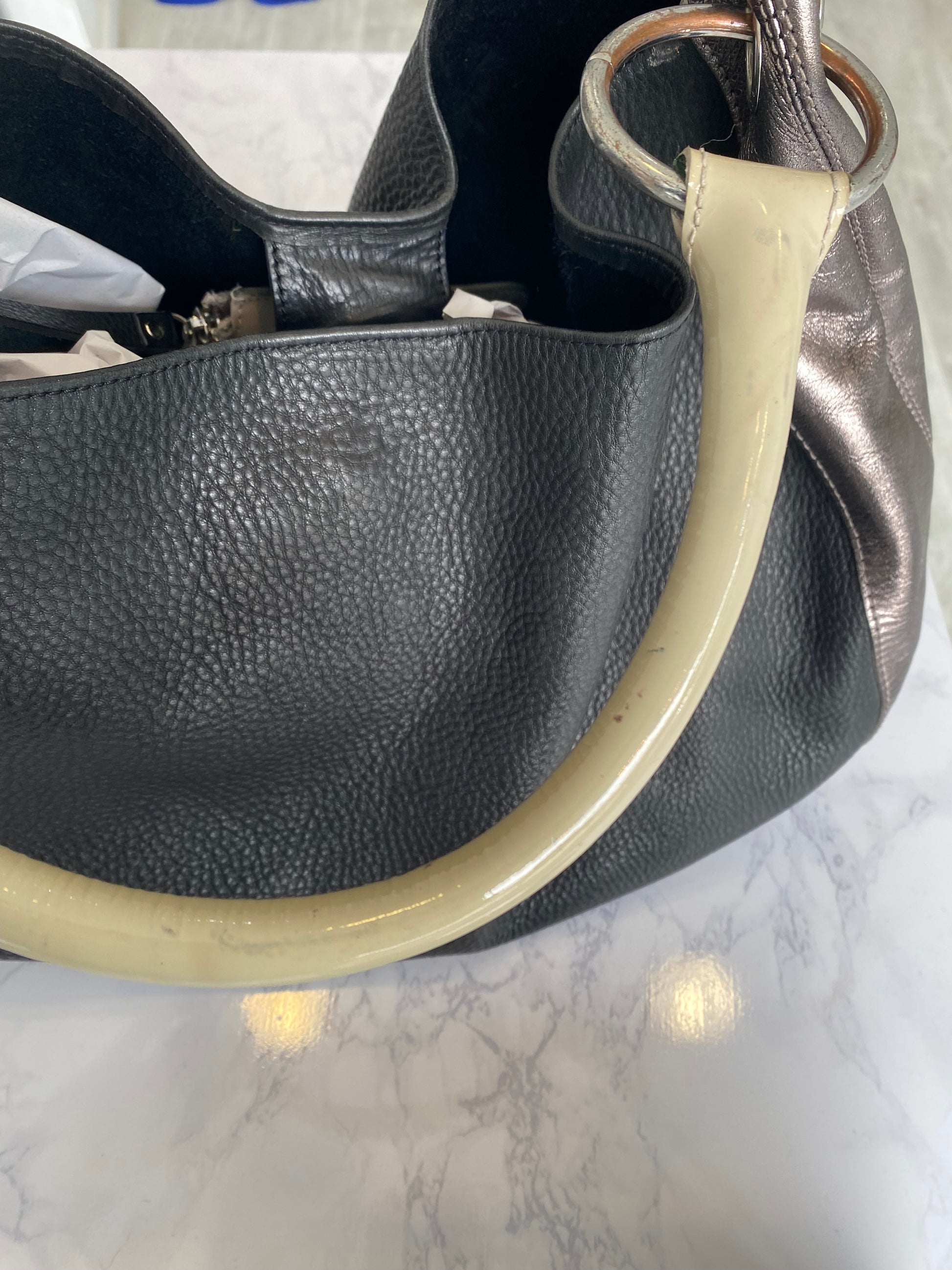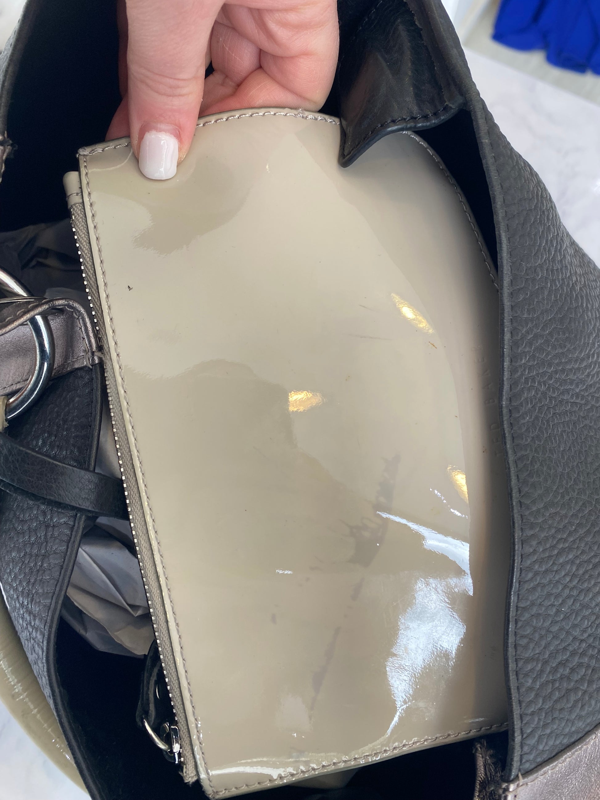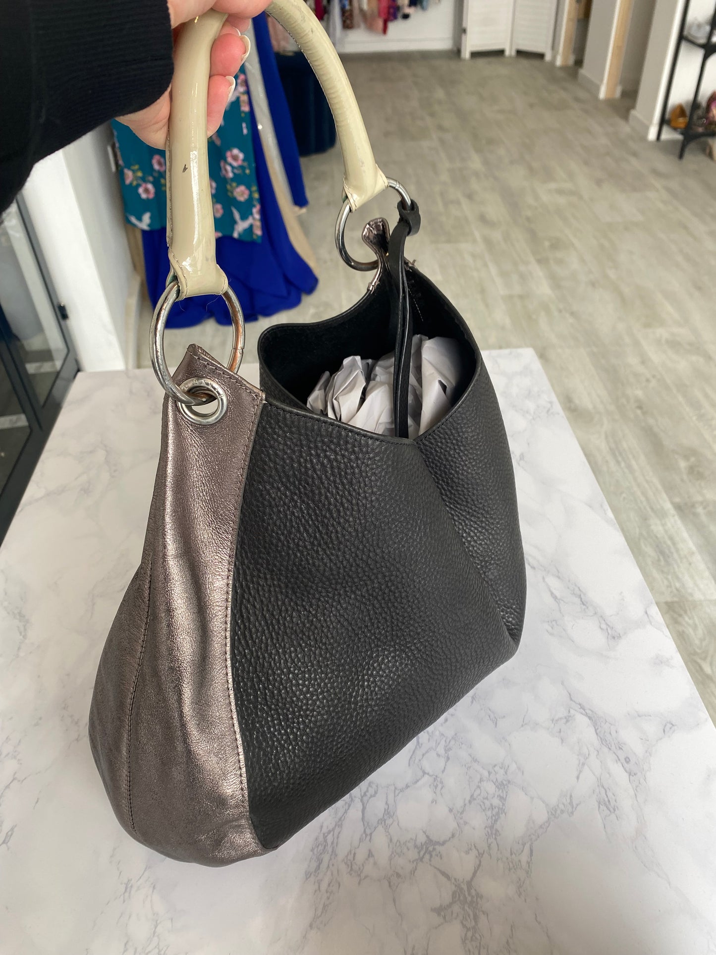 This gorgeous handbag is a hobo style - black with pewter metallic panels. The handle is patent and has a few marks. The inside is suede lining with no internal pockets but it does have a pouch attached which is patent. The pouch does have some marks.