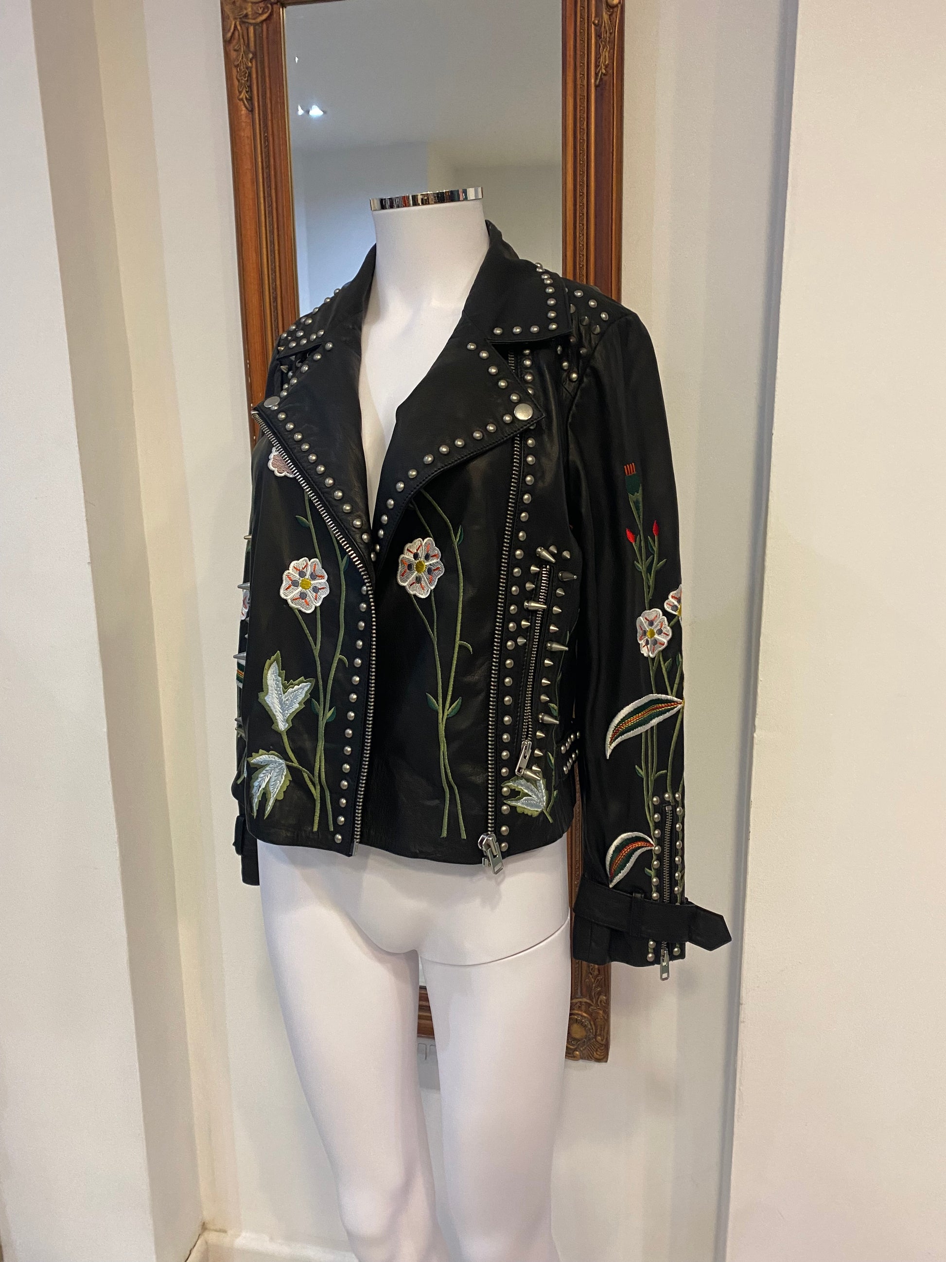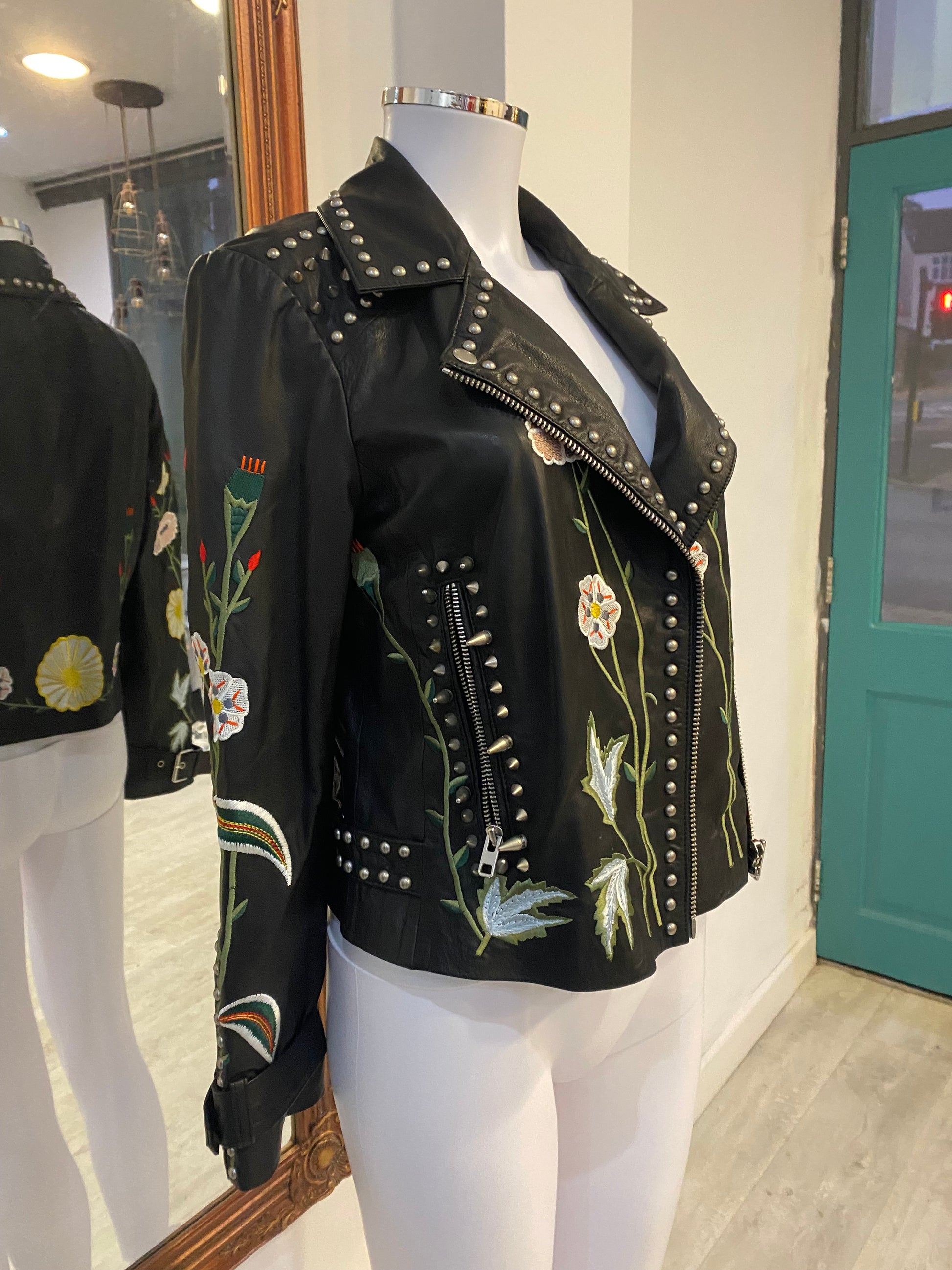 Topshop Black Leather Jacket with Floral Embroidery and Studs Size 8