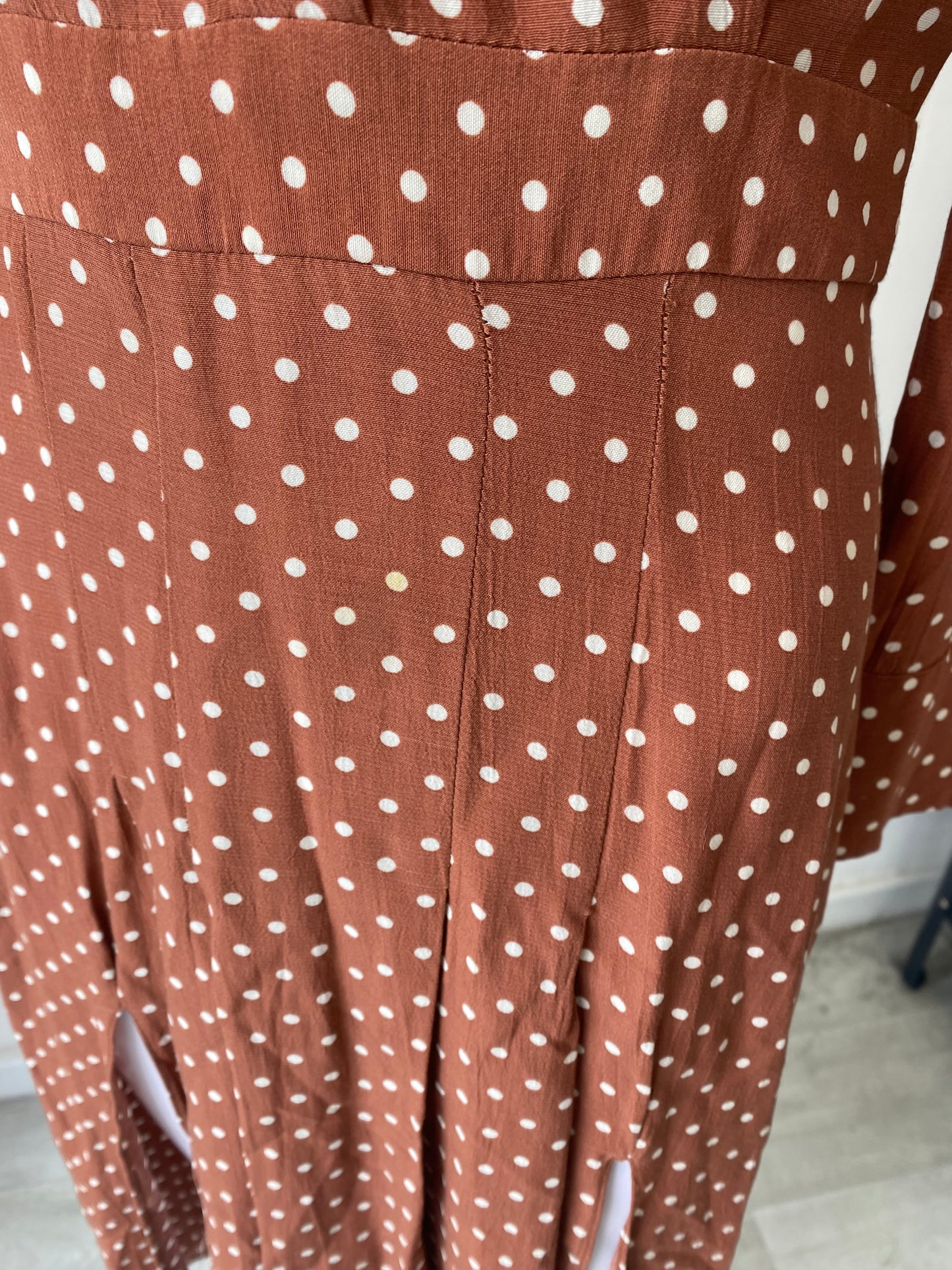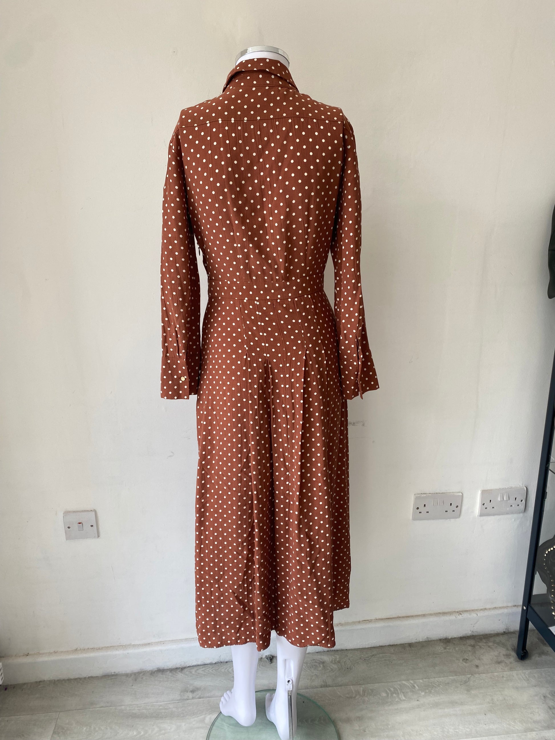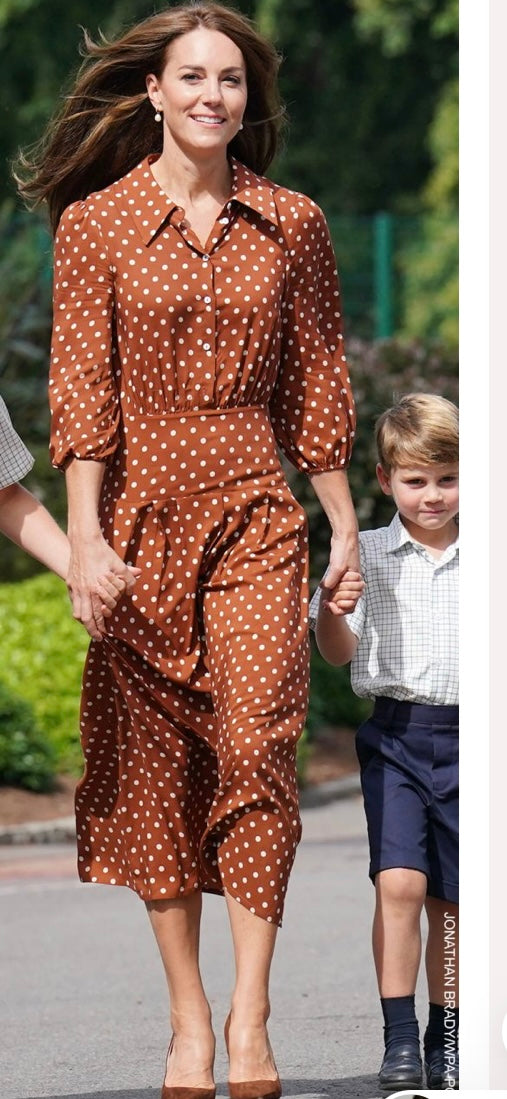 Gorgeous spot print dress, brown with white spots. Shirt style with 2 slits at the front. Worn by Kate Middleton.