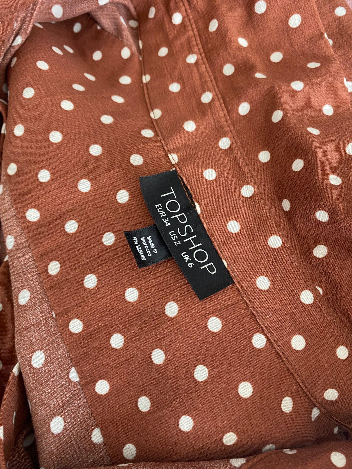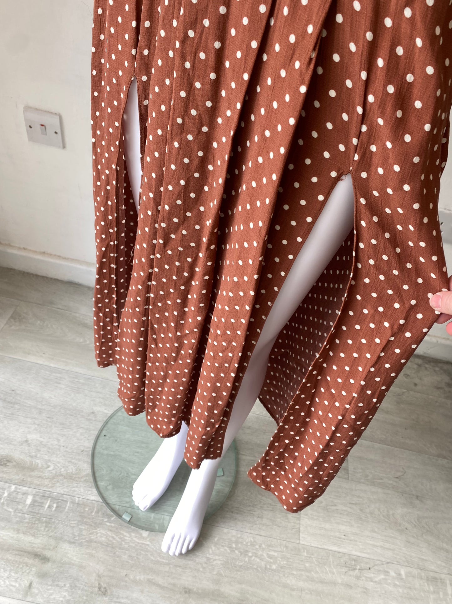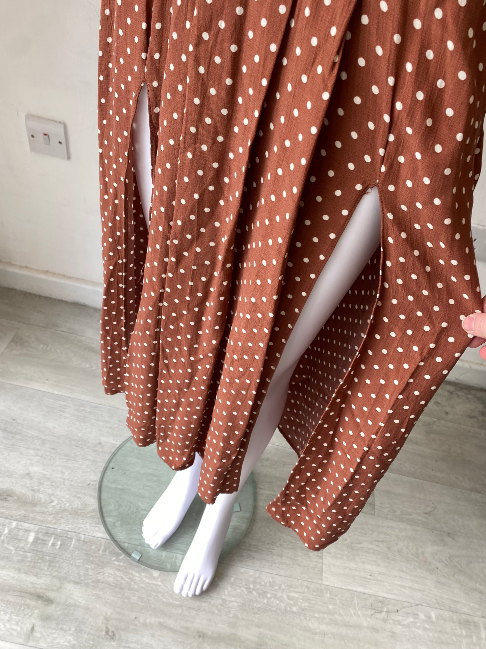 Gorgeous spot print dress, brown with white spots. Shirt style with 2 slits at the front. Worn by Kate Middleton.