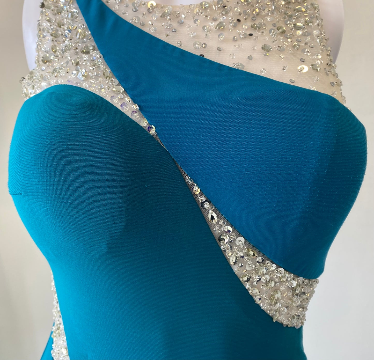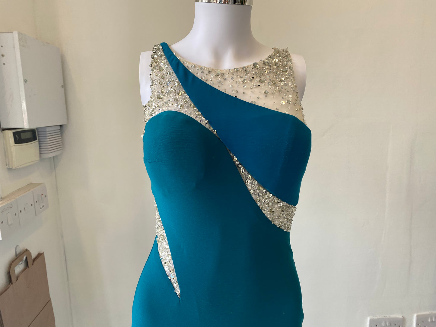This dress is a beautiful vibrant turquoise with beaded detailing.