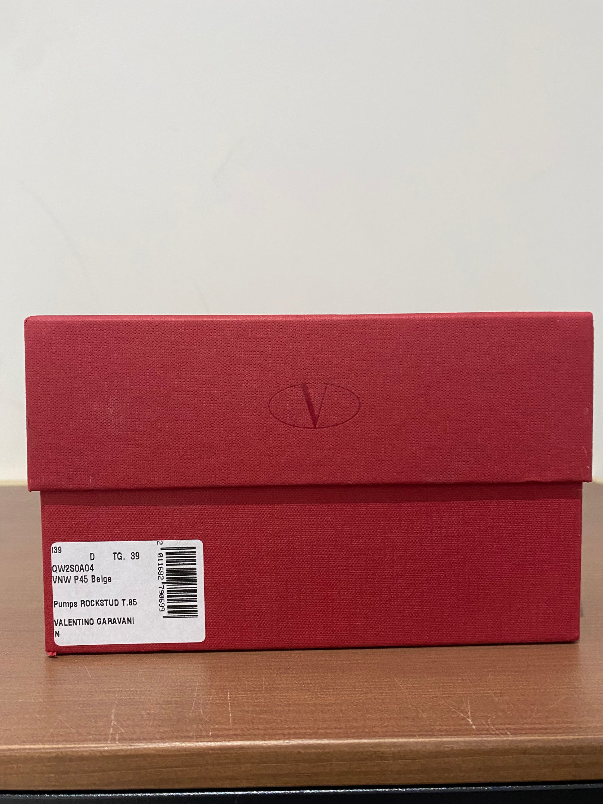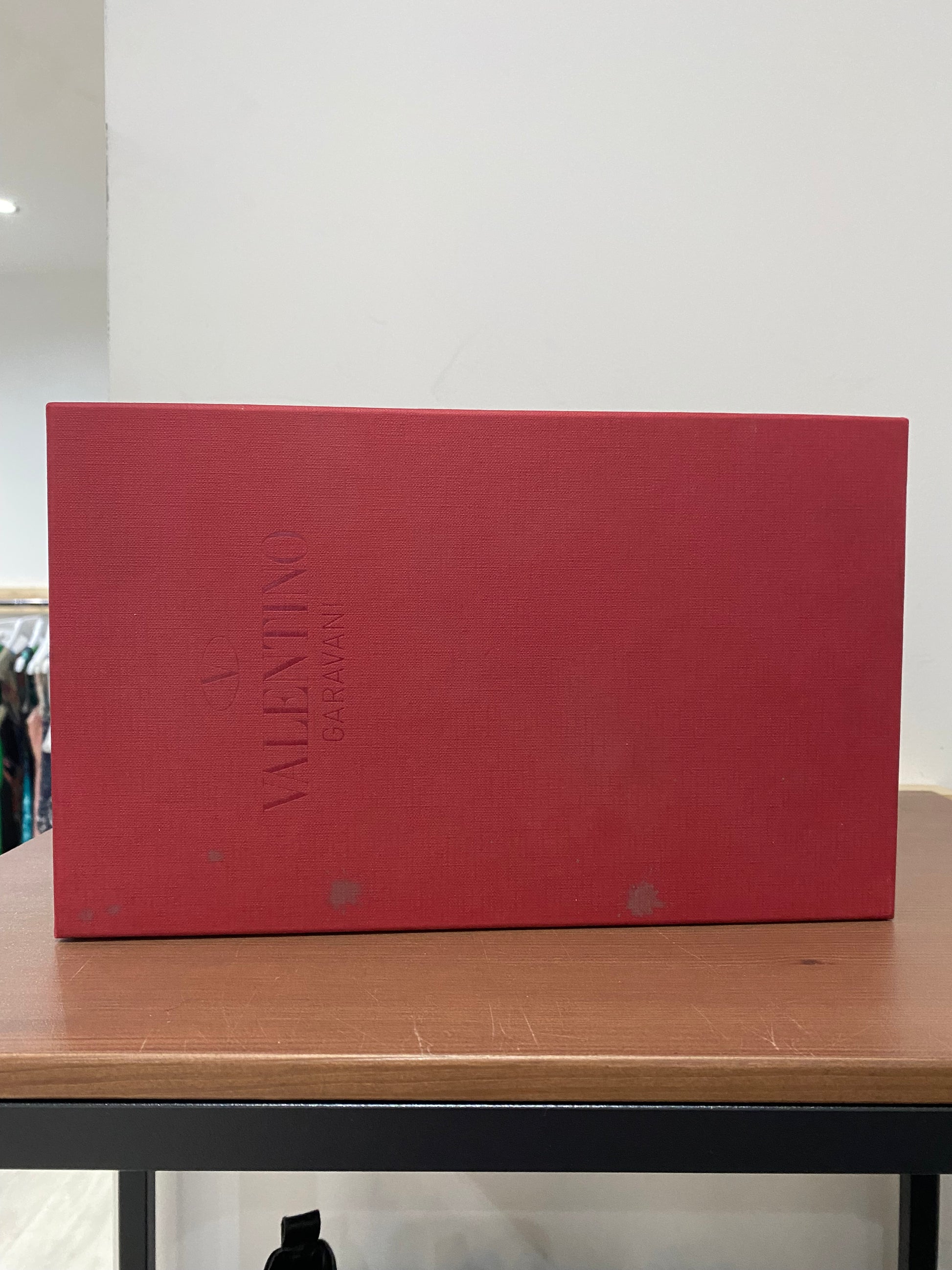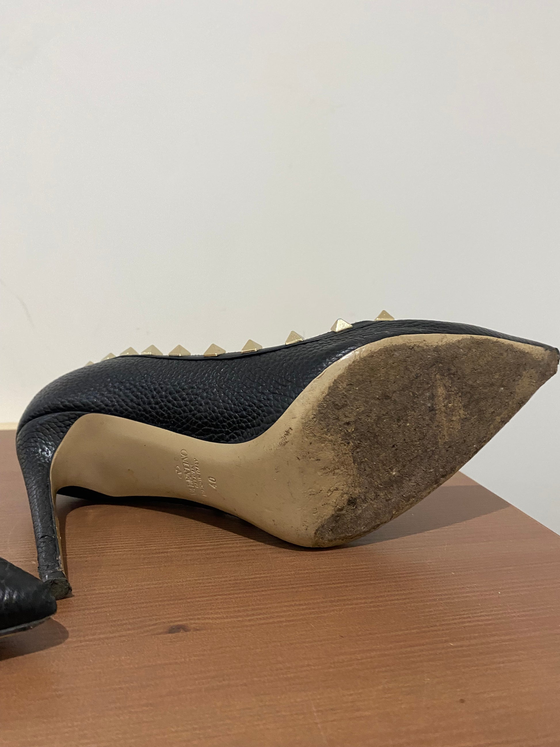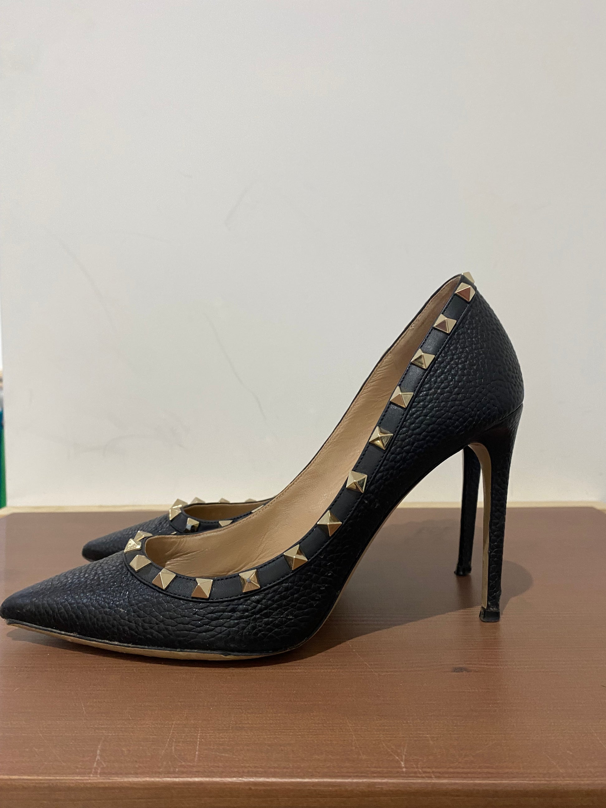 These Valentino court shoes are beautiful - they are black textured leather with gold Rockstuds and come with a Valentino box, it is not the original box. The box has some marks from being stored.